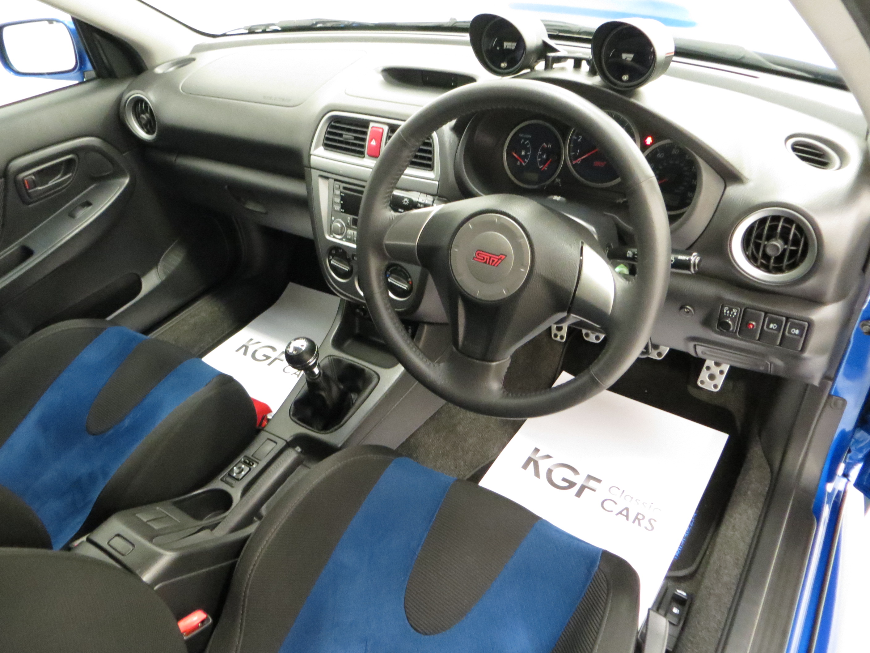 Aluminium bonnet, rear limited slip differential, driver and front passenger airbags, ring shaped reinforcement frame, ISOFIX child restraint system, remote central deadlocking, Thatcham Category 1 alarm/immobiliser, automatic air conditioning, aluminium pedals, Subaru CD/Radio/Cassette unit, electric windows and door mirrors, tinted glass, Tracker. Performance upgrade equipment; Prodrive ECU power upgrade, sports de-cat downpipe and Prodrive S/S exhaust system, Perrins induction kit, carbon fibre engine dressing kit, Tein fully adjustable coil over suspension, in car Tein Electronic Damping Force Controller, Tein front strut brace and bonnet dampers, KSport 6 pot front callipers, 330mm 2-piece grooved front discs, braided brake lines. Body upgrades; Morretti HD headlights with colour coded surrounds, HID dip and fog lights, STi Prodrive rear spoiler, upper rear window spoiler, STi bonnet scoop upgrade, Perrins colour coded side skirts, Zunsport stainless steel grille, Prodrive mudflaps. Interior upgrades; STi front and rear seats, STi steering wheel, STi guages, Perrins boost and exhaust gas temperature gauges, WRX carpet mats.
