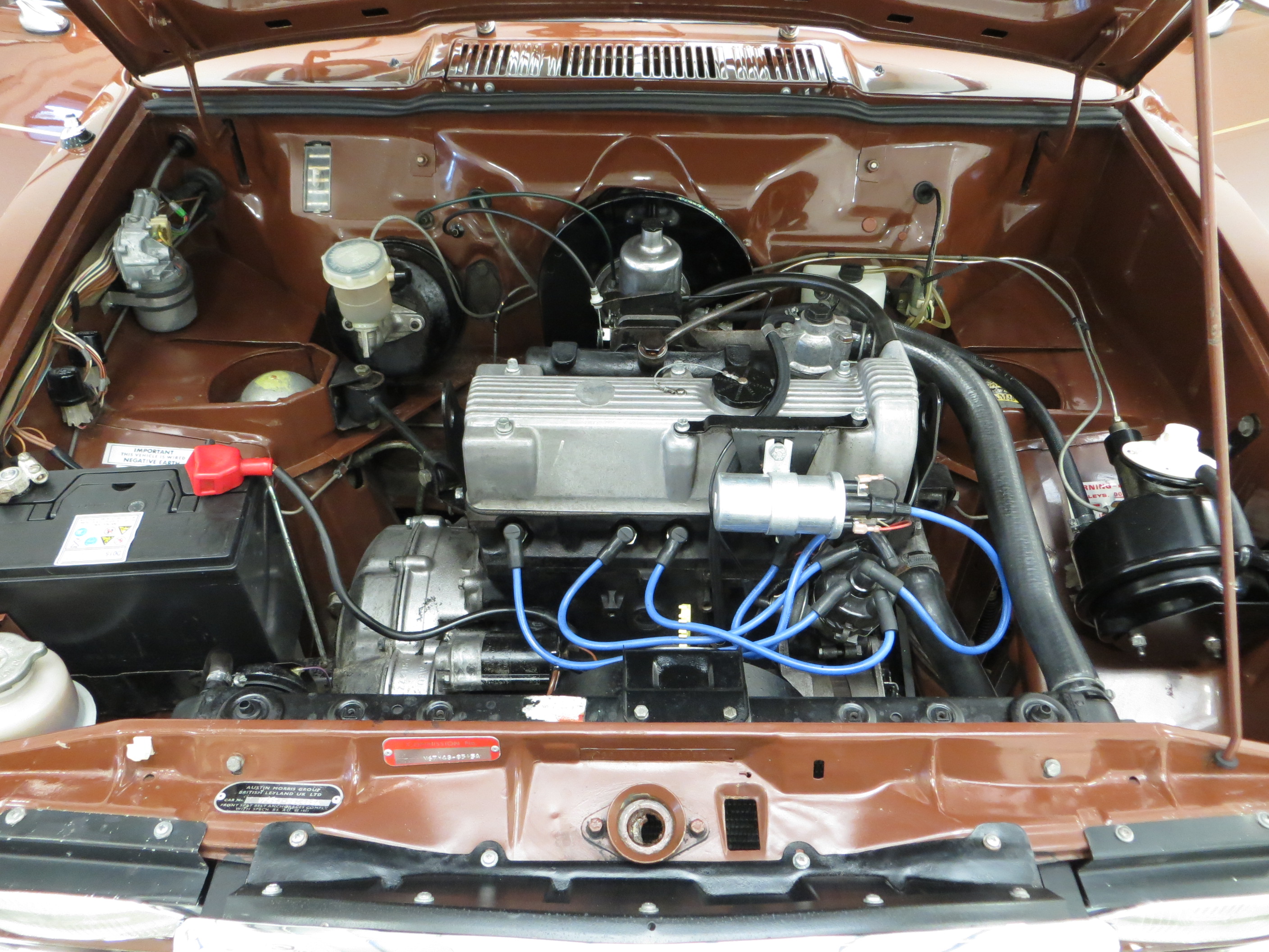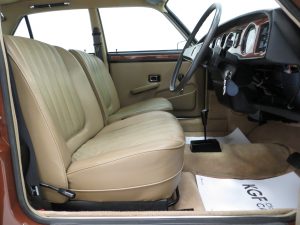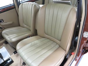 The Vanden Plas 1500 is totally luxurious. The sumptuous fully reclining front seats are upholstered in knit-backed expanded vinyl with fluted hide panels and the matching deep-pile wall-to-wall carpets are spotless. Extra sound-proofing, armrests for everyone and rear seat picnic tables all add to the sense of a special occasion. Traditional British craftsmanship is evident with the handsome finish of the walnut facia showing a few minor lines and the stitched handbrake gaiter and stainless sill trims. The nylon cloth head lining has loosened slightly in areas but in no way distracts from the opulent surroundings. All gauges function including the electric clock and an ambient mood is created thanks to three working courtesy lights! The boot area is factory perfect with jack, handle and wheel brace all in the black plastic bag.
