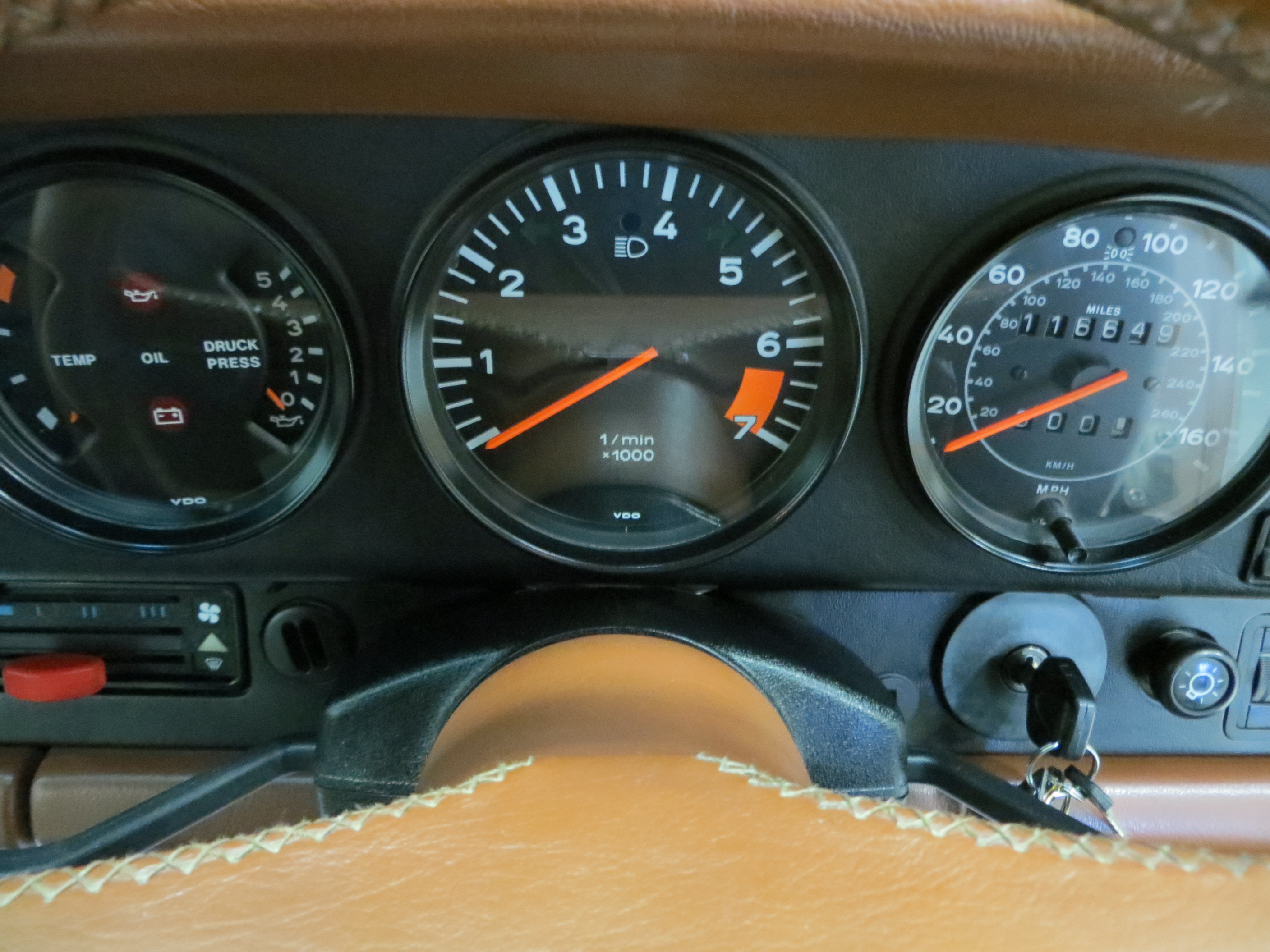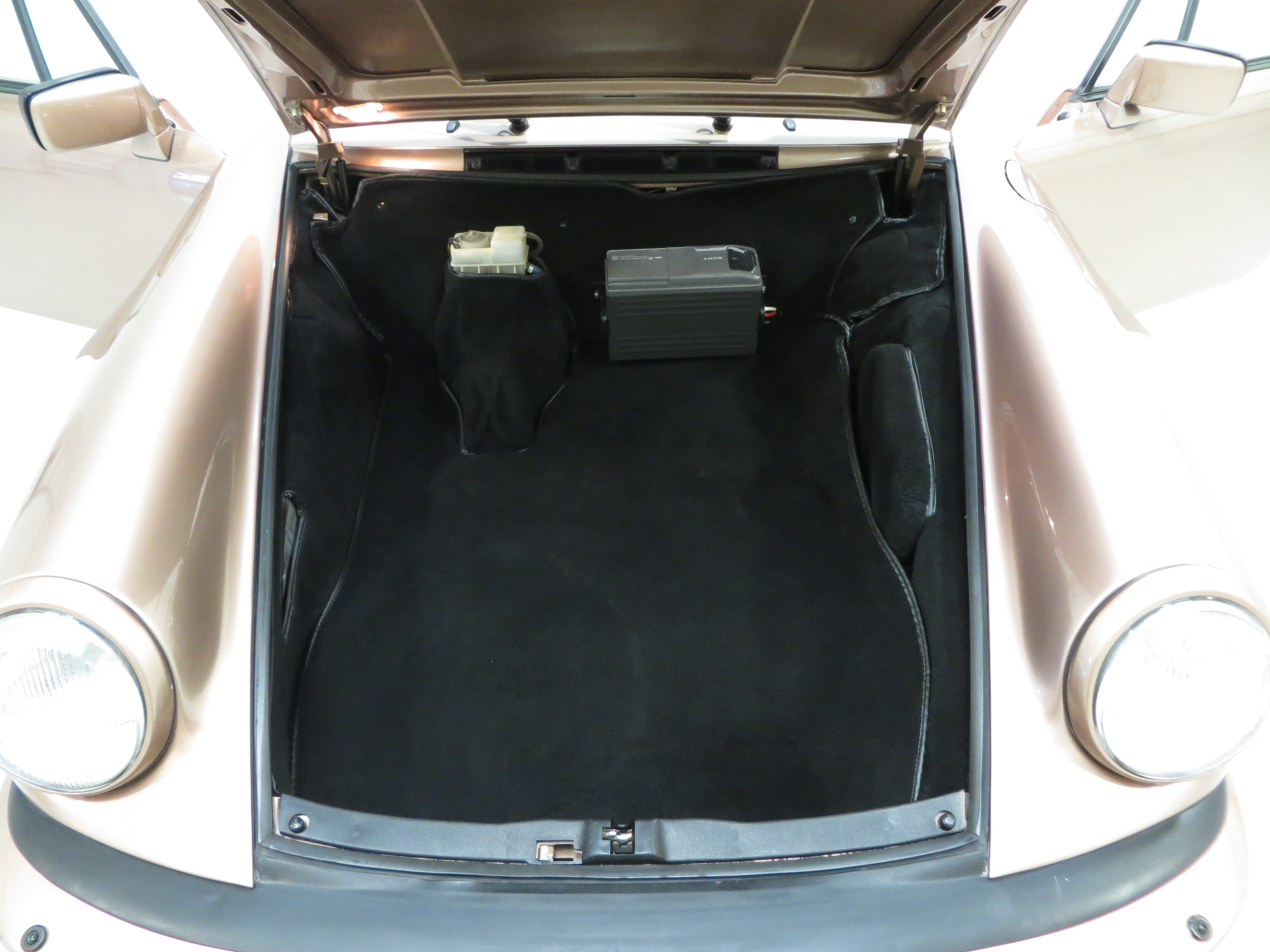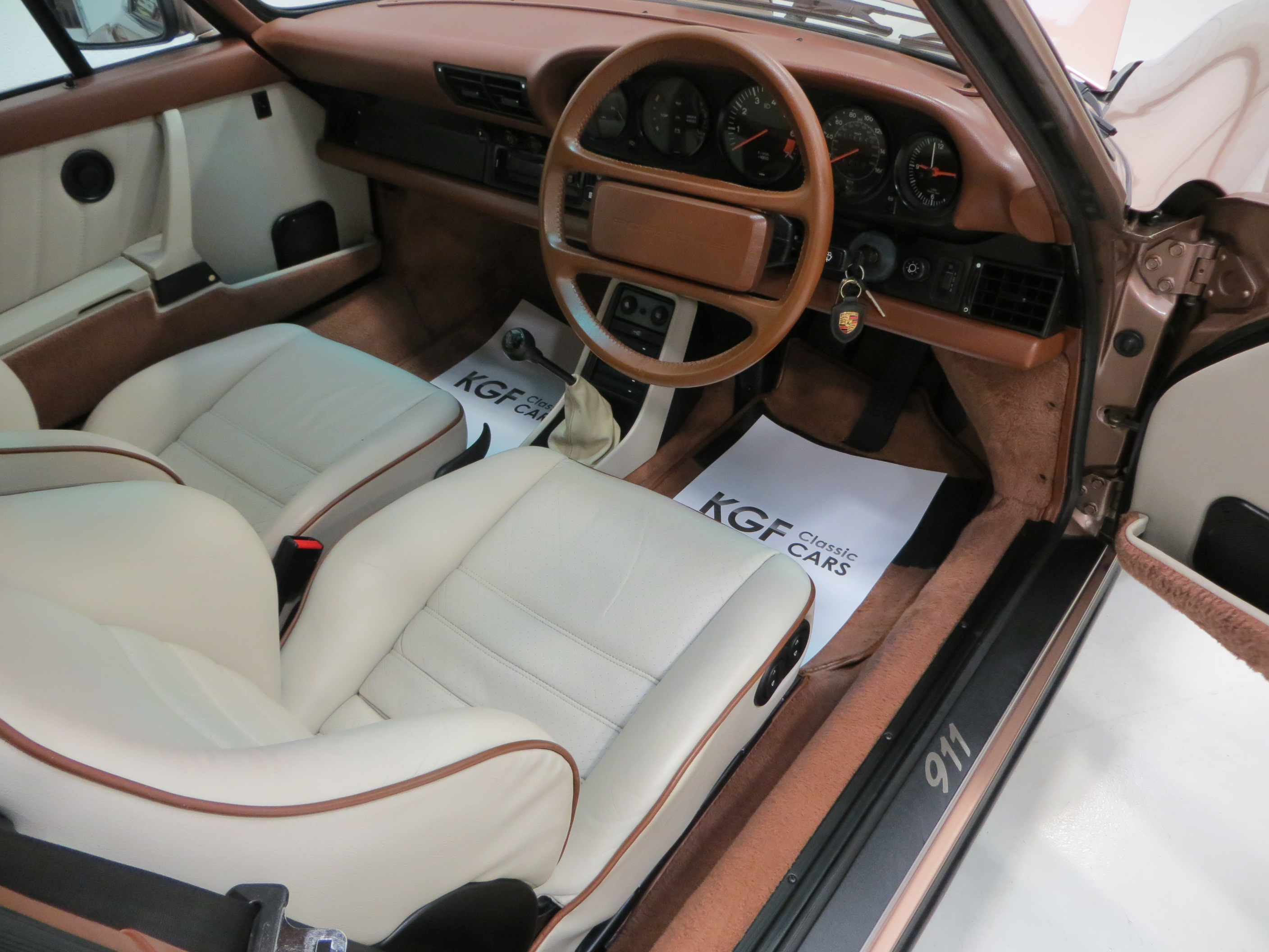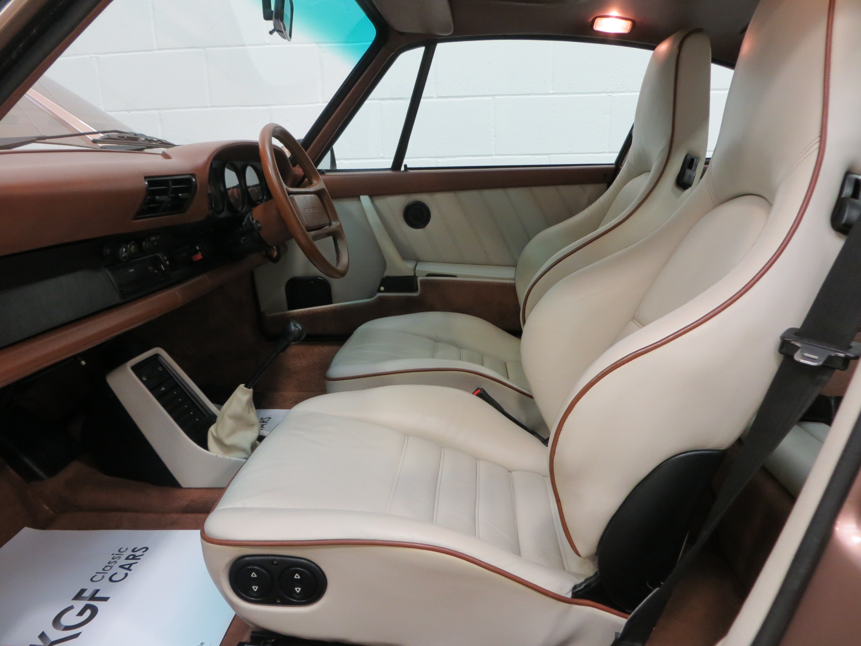 The splendid interior of this 911 Supersport is a delightful throwback to 1980’s supercar glamour. The seats are finished in beautifully clean Linen and Mahogany Leatherette with Linen interior inlays. Matching door cards and tailor-made carpet mats complete the look and the colour scheme dashboard and matching steering wheel resonate with 1980’s exuberance! Only tiny age related veins to the seat leather is visible upon very close inspection. The dashboard and associated switchgear is perfect with all functions and controls operating exactly as Porsche intended. The front luggage compartment still displays the important original factory build sticker under the bonnet which matches that inside the service booklet, and the Porsche ground sheet remains unused along with all other tools. The cockpit of a ground breaking automotive hero.