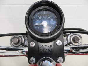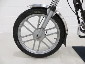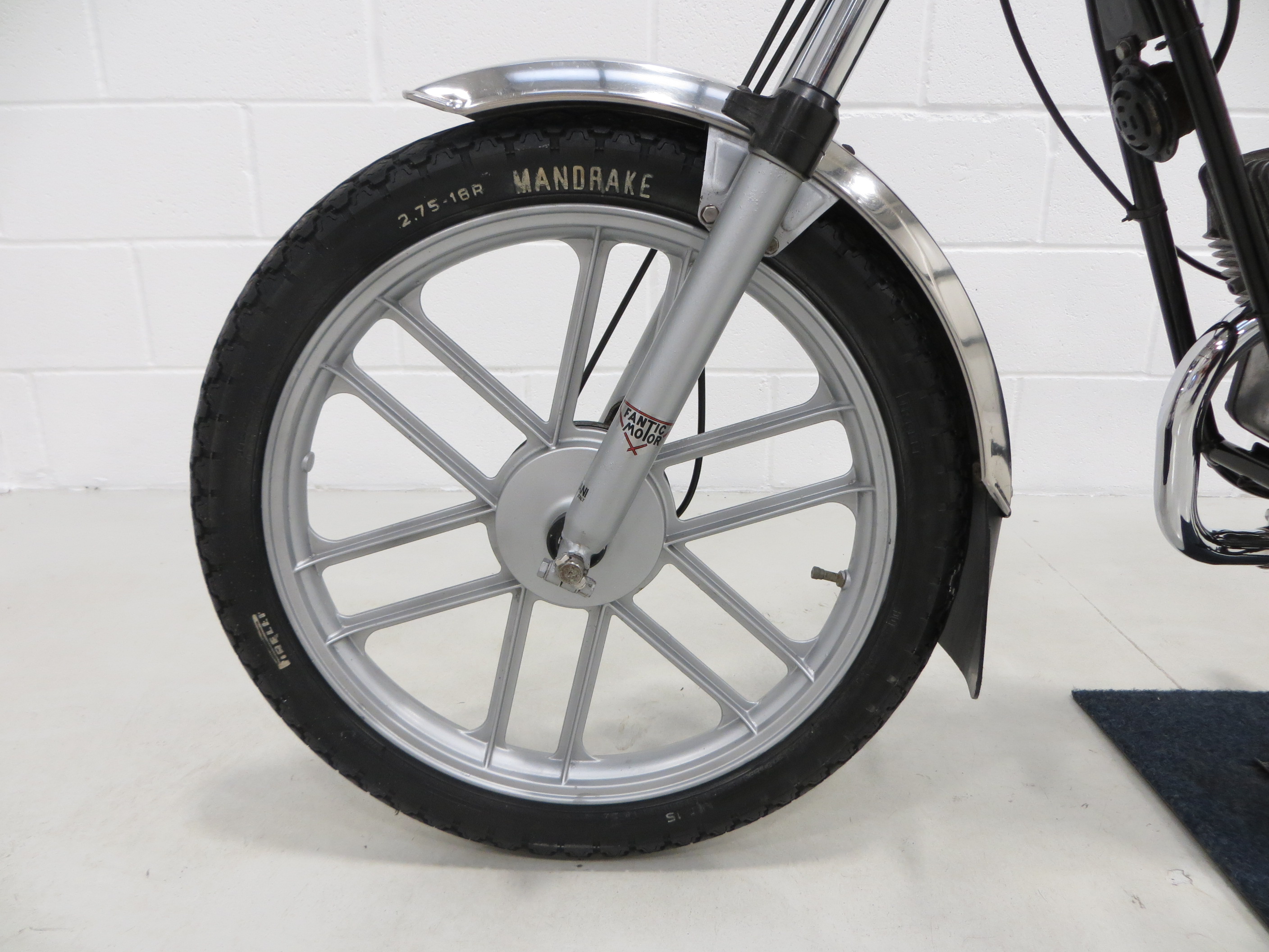 The original Italian made spoked wheels are in good condition just showing minor marks to the chrome finish surrounded with near new quality 2.75-18 tyres. Drum brakes front and rear provide adequate braking of this sporty Moped.