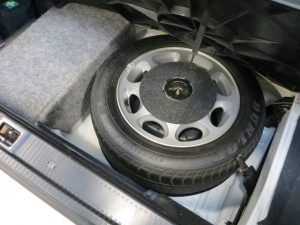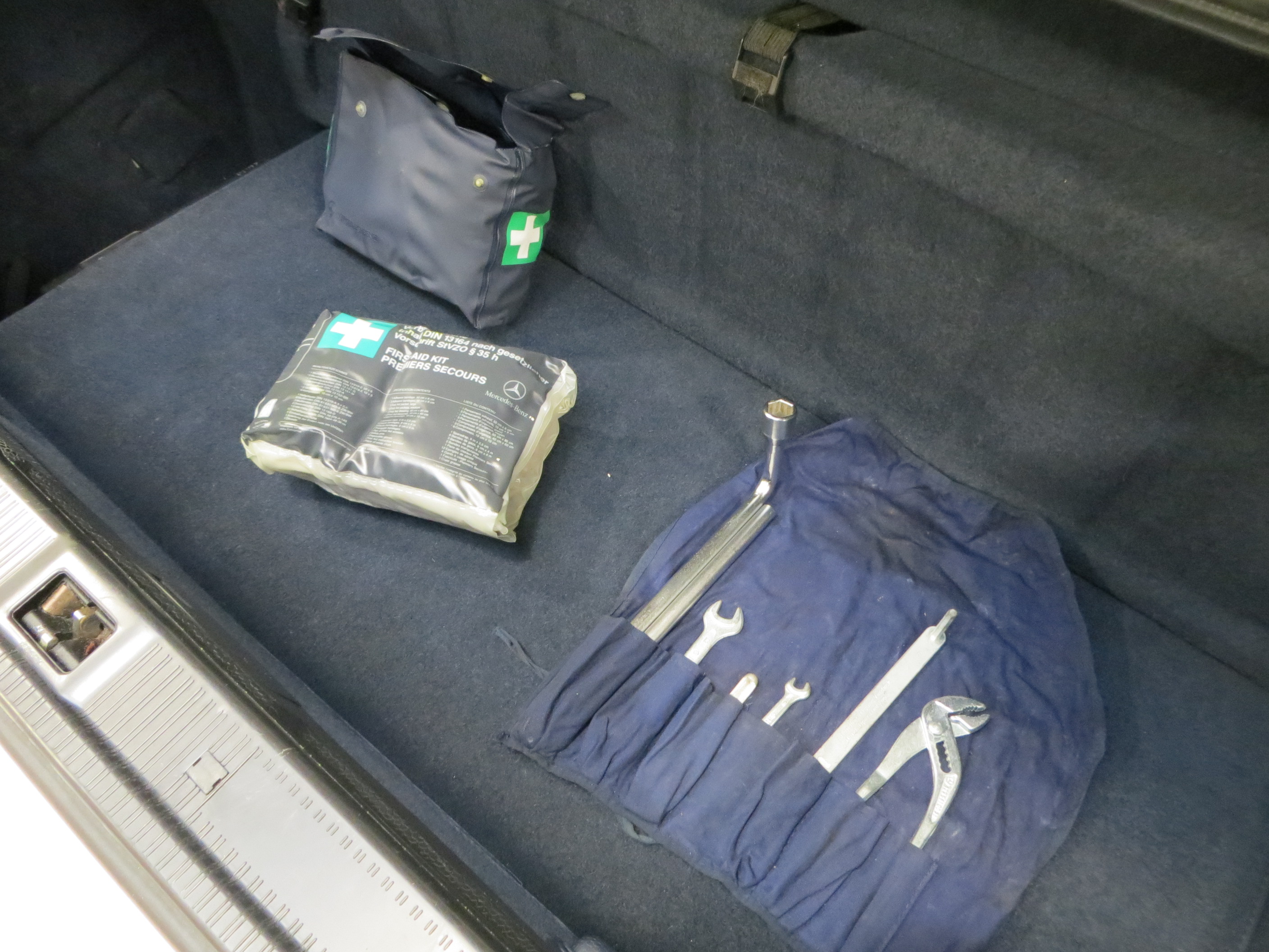 Cast light-alloy wheels in eight-hole design are virtually unmarked with no curb damage and have perfect genuine Mercedes centre caps. Matching Michelin Pilot Primacy 225/55 R16 are fitted all round and have excellent tread remaining. The full size spare wheel is housed neatly in the boot area alongside the Mercedes first aid kit, tool roll and warning triangle. The standard ABS system with fixed calliper disc brakes front and rear offers reassuring stopping power.