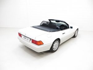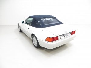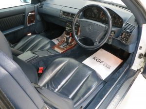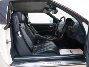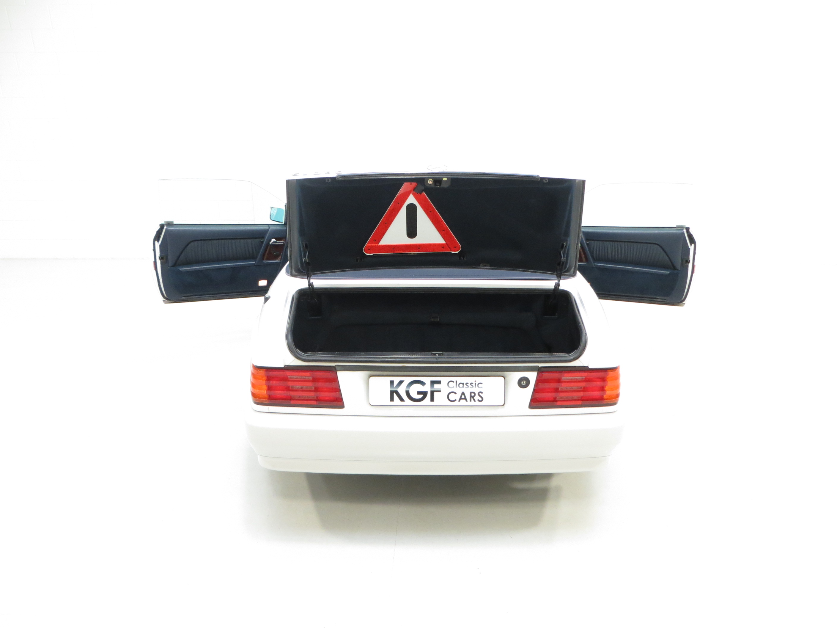 This elegant, cherished Mercedes-Benz SL is finished in stunning two tone Polar White (Code 149) and Arctic White (code 143), the original factory colour scheme. The uniform paintwork has an incredible bright finish owing to long term cossetted ownership and strict garage storage. All panels are free from damage with only miniscule imperfections visible upon close scrutiny, utterly insignificant. The factory Dark Blue soft-top (code 744) is perfect with clear unmarked screens and the Polar White hardtop is easy to remove/refit. An exemplary example of the model that affirmed the maker’s repute for engineering excellence.