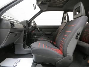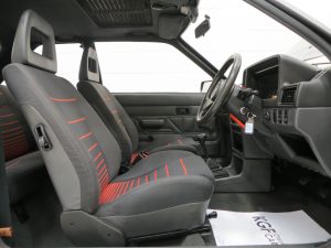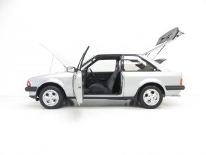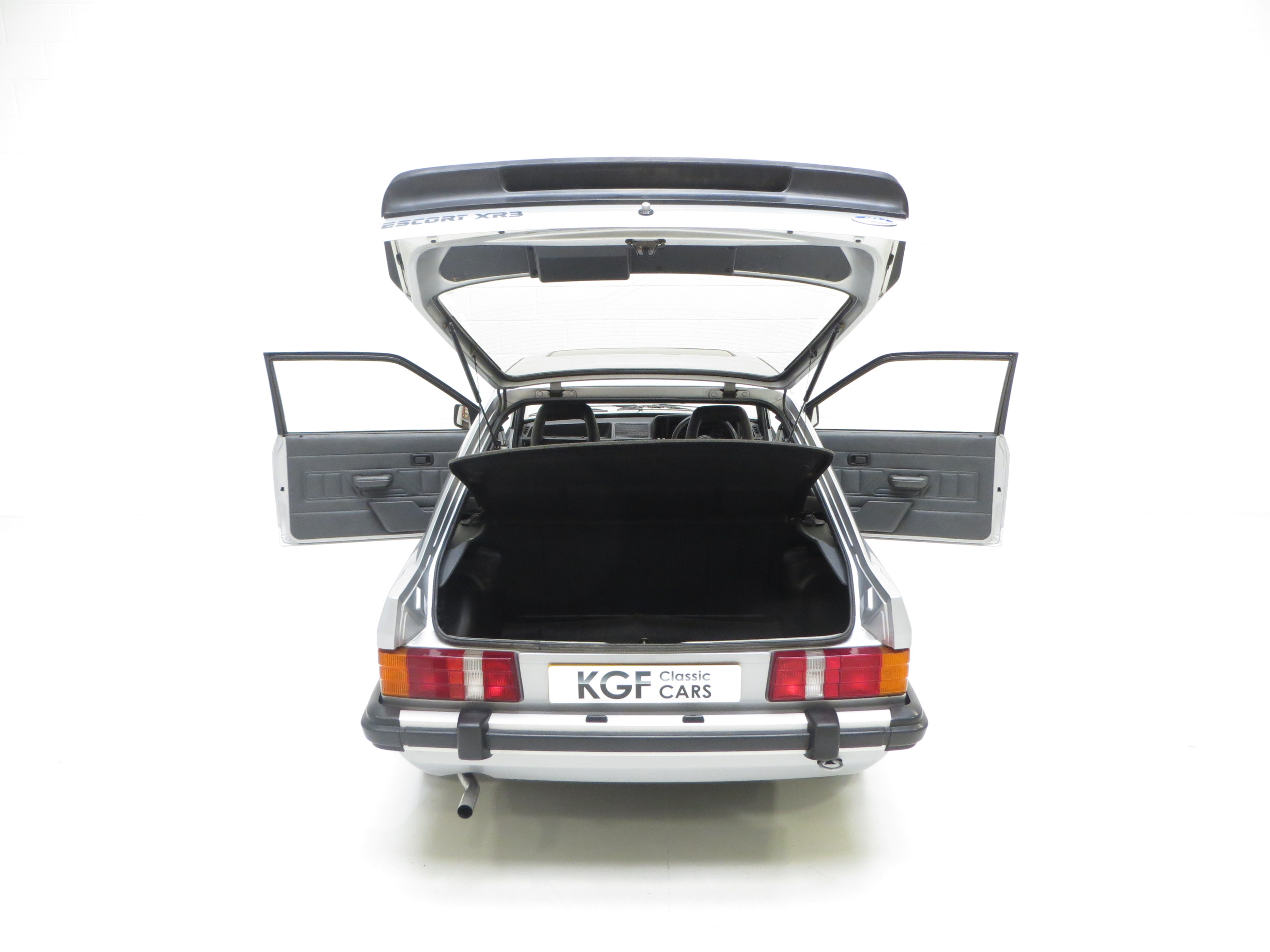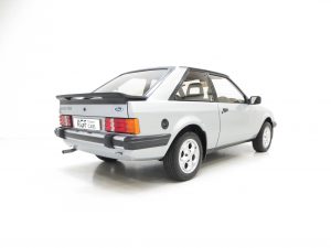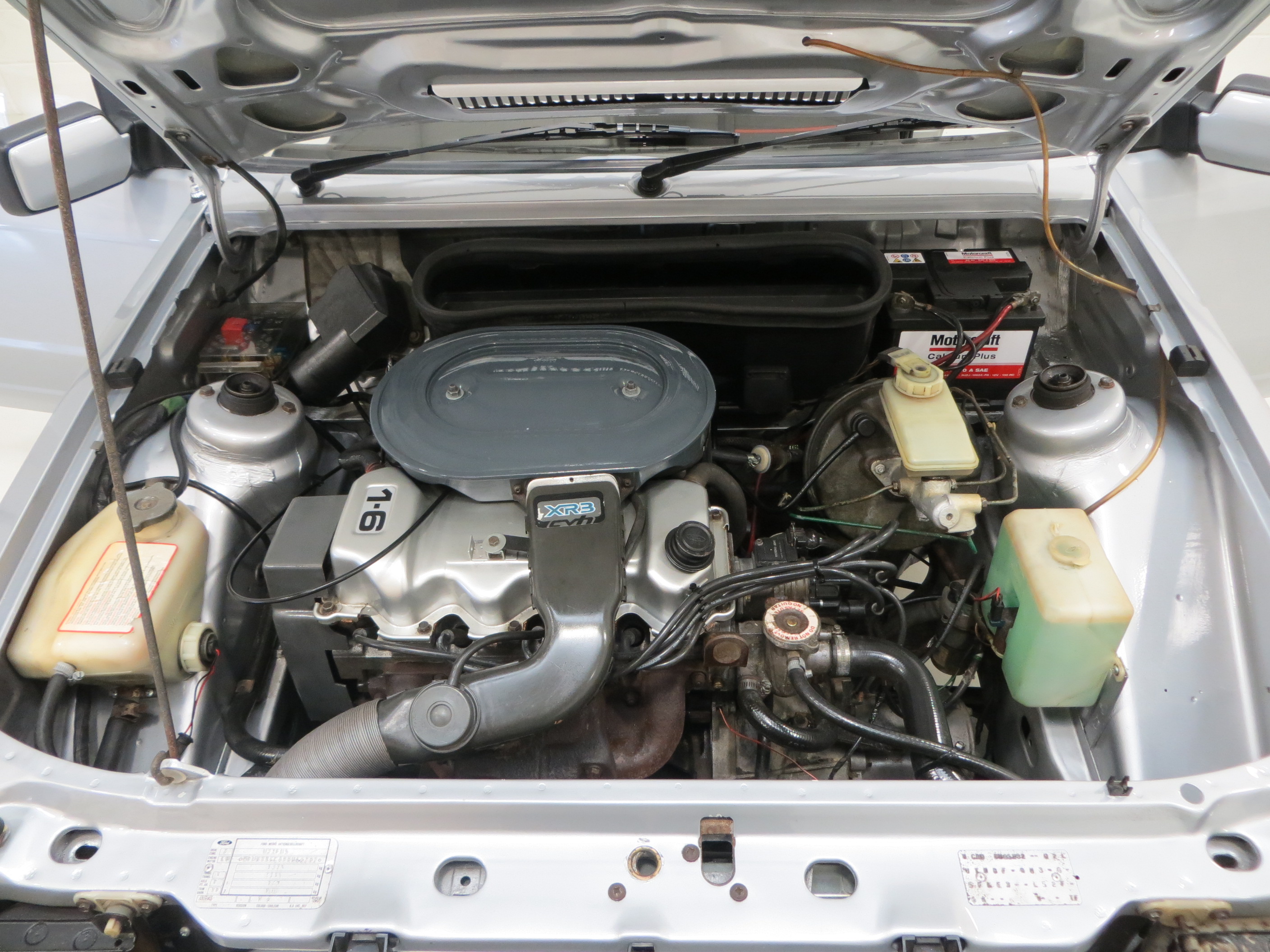 Finished in the original colour of Strato Silver Metallic, (Code V6), the paintwork is superb with a bright uniform finish and the factory panels remain fitted with stampings visible. Unique features denote a very early XR3 such as the single washer jet, washer bottle bracket design and satin black painted sill, and whilst debate rages as to exactly how many cars had these features, what is certain is that only very early cars did. Furthermore, the correct higher ride height prior to the introduction of the XR3i has been maintained. The trim sections, glass, lights and badges are in excellent order and supplying original dealer number plates remain fitted. A tiny paint blemish around the wing mounted aerial, a small split to the driver’s door top rubber and slight discolouration to the sunroof glass are visible upon close inspection. A superb example of this legendary contender in the 1980’s hot hatch war, unmolested and just as Ford intended.
