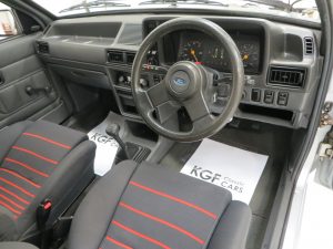 The original Special Laser fabric trim in Red/Grey, (Code TF), along with the small two spoke steering wheel again relate to the early XR3 cars and have remained in fantastic preserved condition. The bright colours to the seat fabric are free from fading and damage and the inner foam structures are firm and shapely. The anthracite headlining is unmarked, as are the door cards, and the carpeting is clean with only minimal wear. Incredibly the dash has only a few minuscule cracks around the vents, barely visible and is free from the common distortion. All the controls work correctly including the electronic warning system which monitors brake pad wear, coolant levels, low fuel, oil and windscreen washer level. Even the Ford P21 push button radio operates! A really well preserved, unspoilt 1980’s icon.