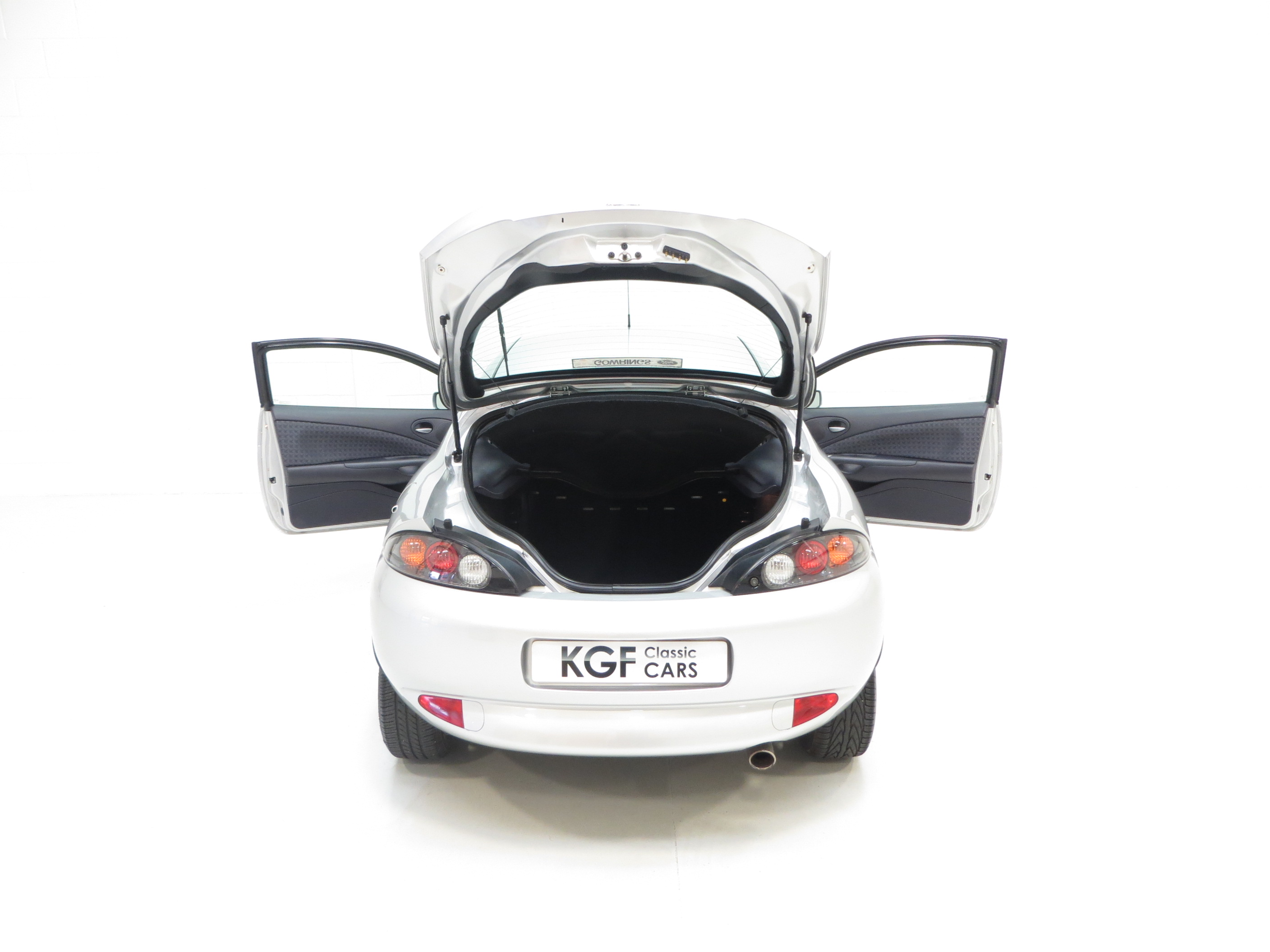 The sporty feel of the Ford Puma certainly continues one inside the snug cockpit which somehow manages to offer space and comfort for front seat occupants whilst not losing the sports car sensation. The original Chrome/Twill trim, (Code VJ), is superb with the spotlessly clean seats free from wear or damage. The low mileage credentials are clear to see in the preserved carpets and steering wheel leather sides, usually worn on most examples, which are excellent. The controls and switchgear are as new and all functions operate perfectly, including the optional air conditioning. The immaculate luggage area displays factory build stickers to the boot floor and both the parcel shelf and carpet are perfect. A well-made and lovingly protected interior, complete with the new Ford smell!