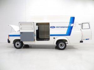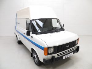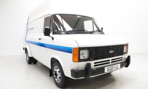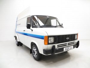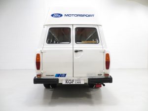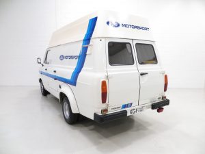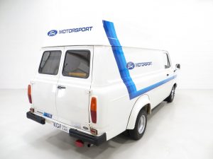 First registered in 1982, the van was supplied to a British Air Force Base in Jersey where it stayed for 9 years until first UK registration on 6th February 1991. There is even a Defence Evaluation Research Agency journey log sheet in the history file! Walkers Bodywork of Watford and Stockport were commissioned to carry out the high-top roof conversion when new and their company plaque remains fitted to the rear door and nearside door step. Forming part of private collections since arrival on the UK mainland, the van spent several years on display at Evans Halshaw Ford in Blackpool before being purchased by Alan and Phil Sherwood, the former being the RS Owners Club RS2000 Registrar. Having lived a life a far cry from the majority of examples, the amazingly low mileage of 3710 miles and careful storage has ensured total preservation of this legendary commercial classic. Although fully operational upon acquisition, KGF Classic Cars have undertaken a process of full recommissioning and replication of the classic Ford Motorsport livery of the 1980’s. Images of this van towing an 80’s RS Escort would draw the crowds at any show! The decals are easily removable without trace should the next owner wish, leaving nothing other than the original badges and Walkers plaques. It is hard to imagine finding a better unrestored example, truly special.