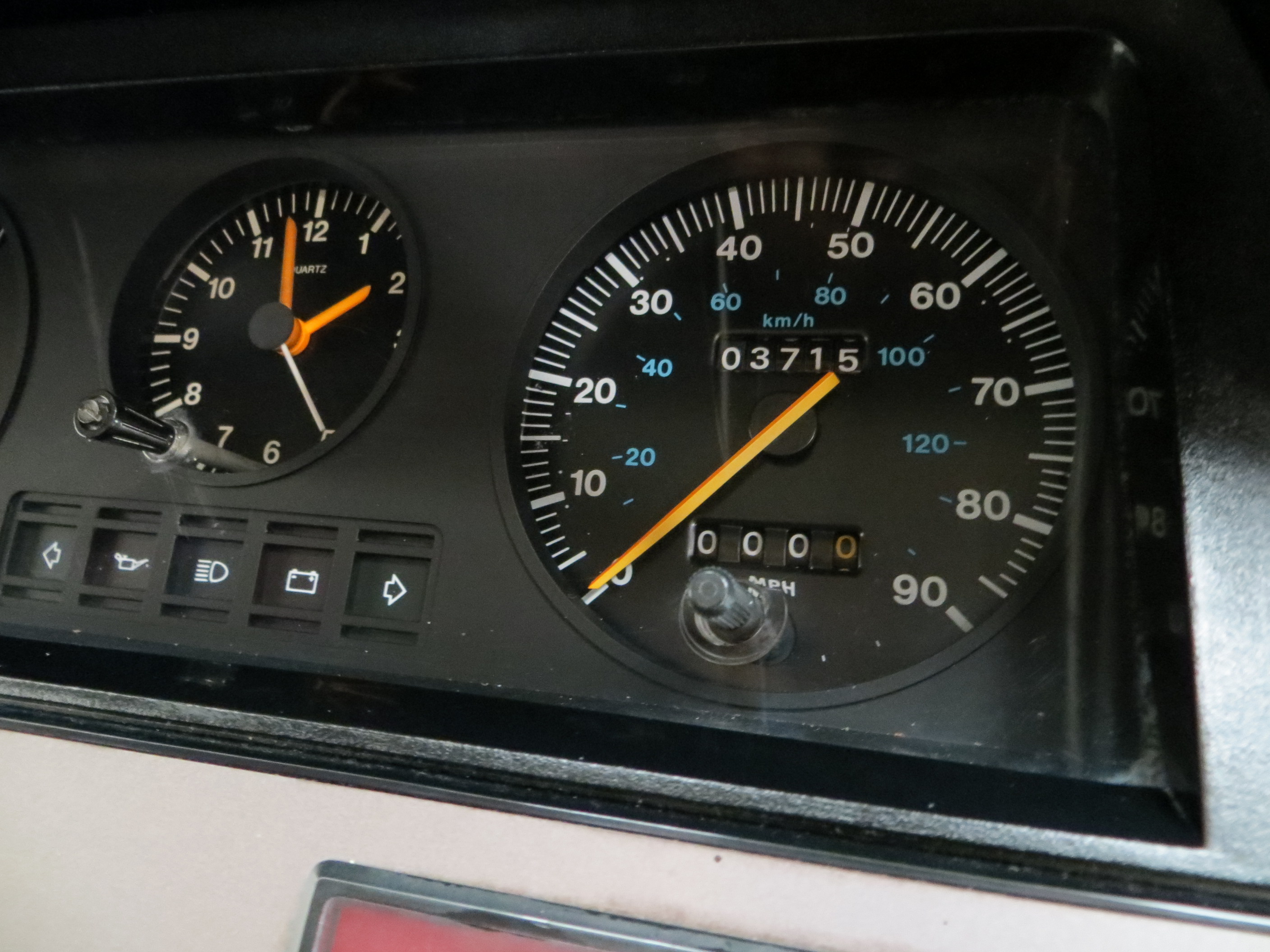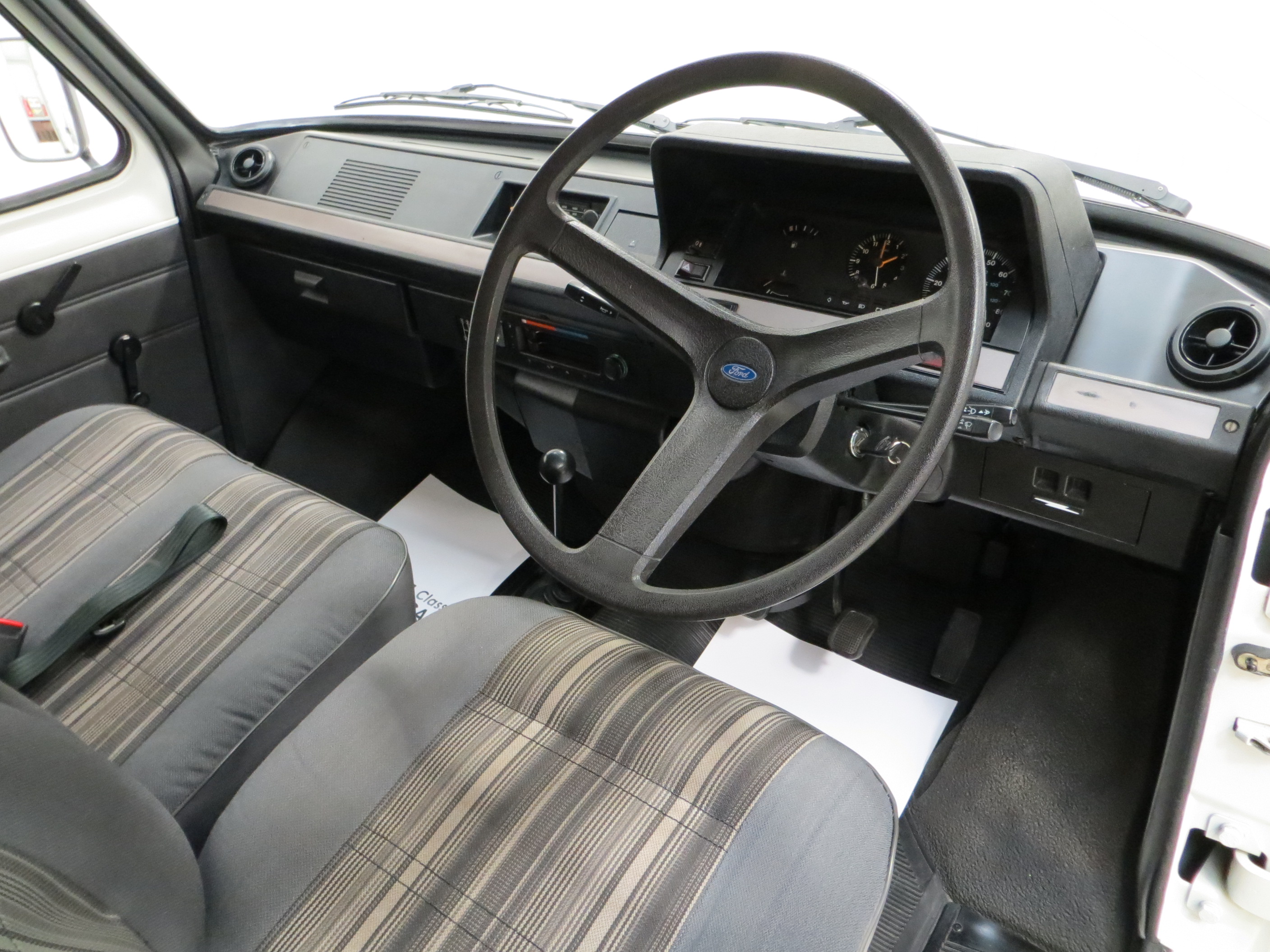 Trimmed in the Custom optional and rather amusingly named ‘Random Stripe’ cloth upholstery, the seats are in as new condition and entirely commensurate with the incredible low mileage of 3,715 miles. In fact, cabin space is largely as it left the showroom in 1982 with the huge dished steering wheel showing natural prominent veins and all switchgear as new. Only slight loosening of the headlining above the windscreen is worthy of mention. Even the original Ford push button radio remains fitted and operational! Factory build plates to the nearside door step remain fitted and the door shuts still have factory wax injection marks. The rear load space is clean, and heavy-duty rubber matting protects the load floor. Door cards to the loading doors, usually destroyed upon regular use are fully intact with minor marks. Massively nostalgic and a delight in every respect.