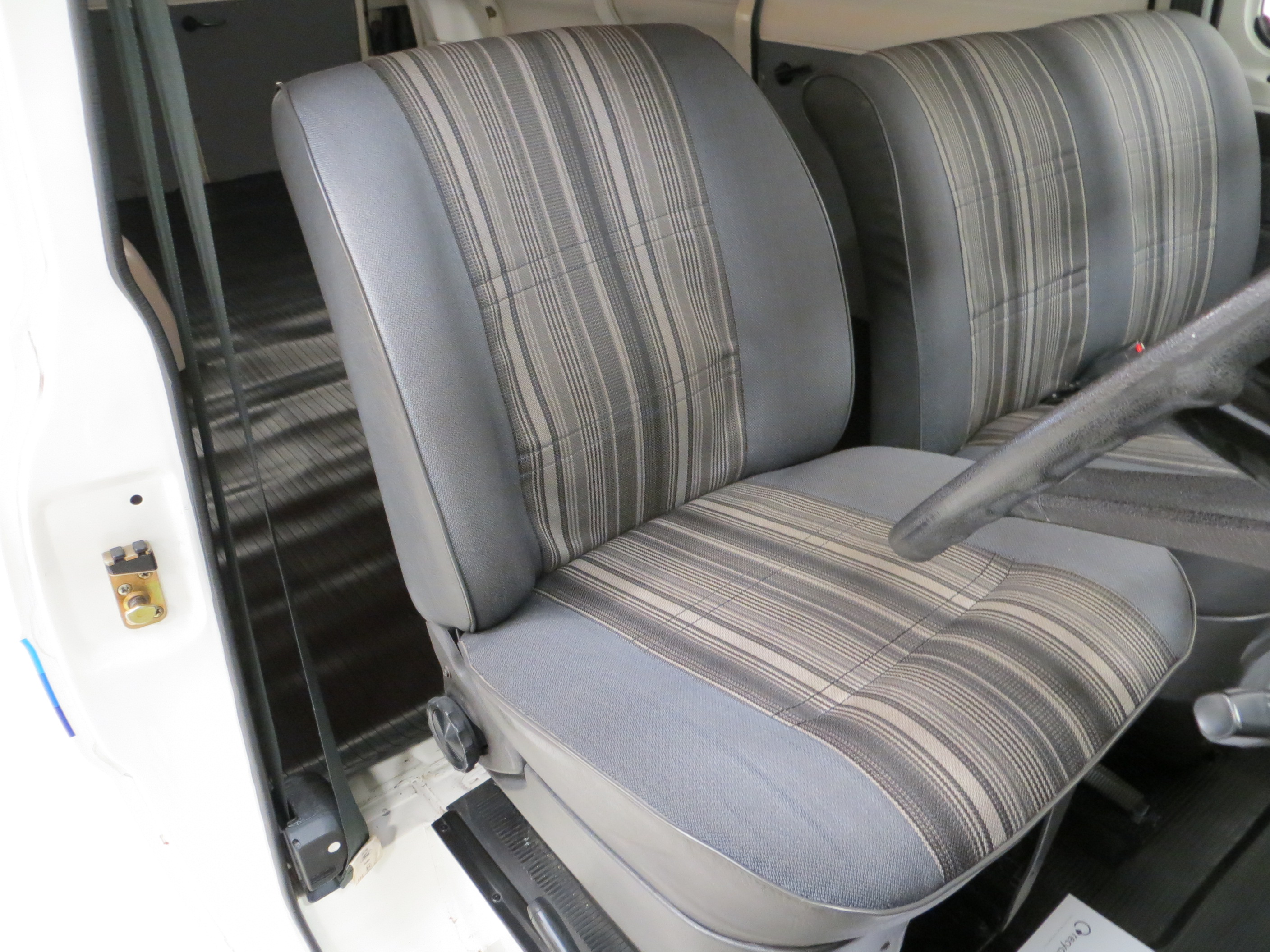 Hinged cab doors with drop windows, hinged side loading door, twin glazed rear doors, two speed windscreen wipers, electric windscreen washers, black rear quarter bumpers, rear fog lamp, rubber floor mat, face level eyeball vents, two speed heater/demister, fascia mounted fuse panel, interior lights, ‘R’ Module incorporating; speedometer, odometer, fuel gauge, temperature gauge, four warning lamps. Custom Pack options; Rectangular halogen headlamps, glovebox with lid, cigar lighter, engine compartment lamp, intermittent wipe, additional coat hooks, driver’s door stowage bin, driver’s seat height adjustment. Factory options; Dual passenger seat, ‘Random Stripe’ cloth upholstery.