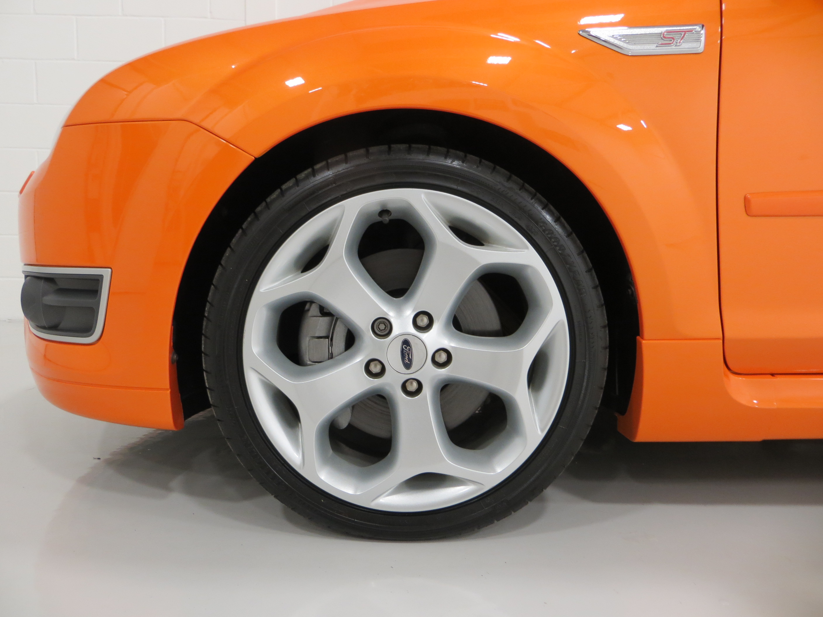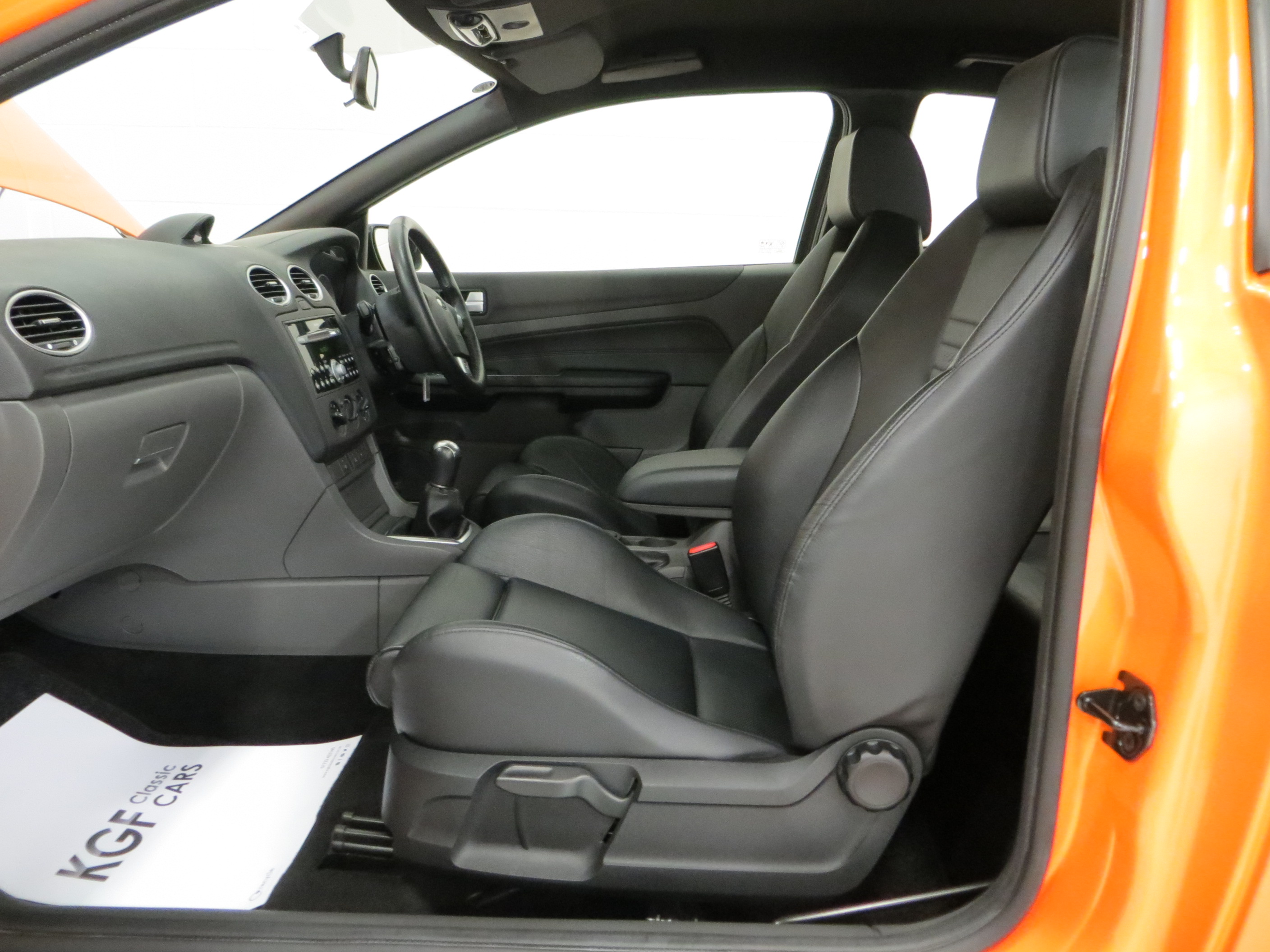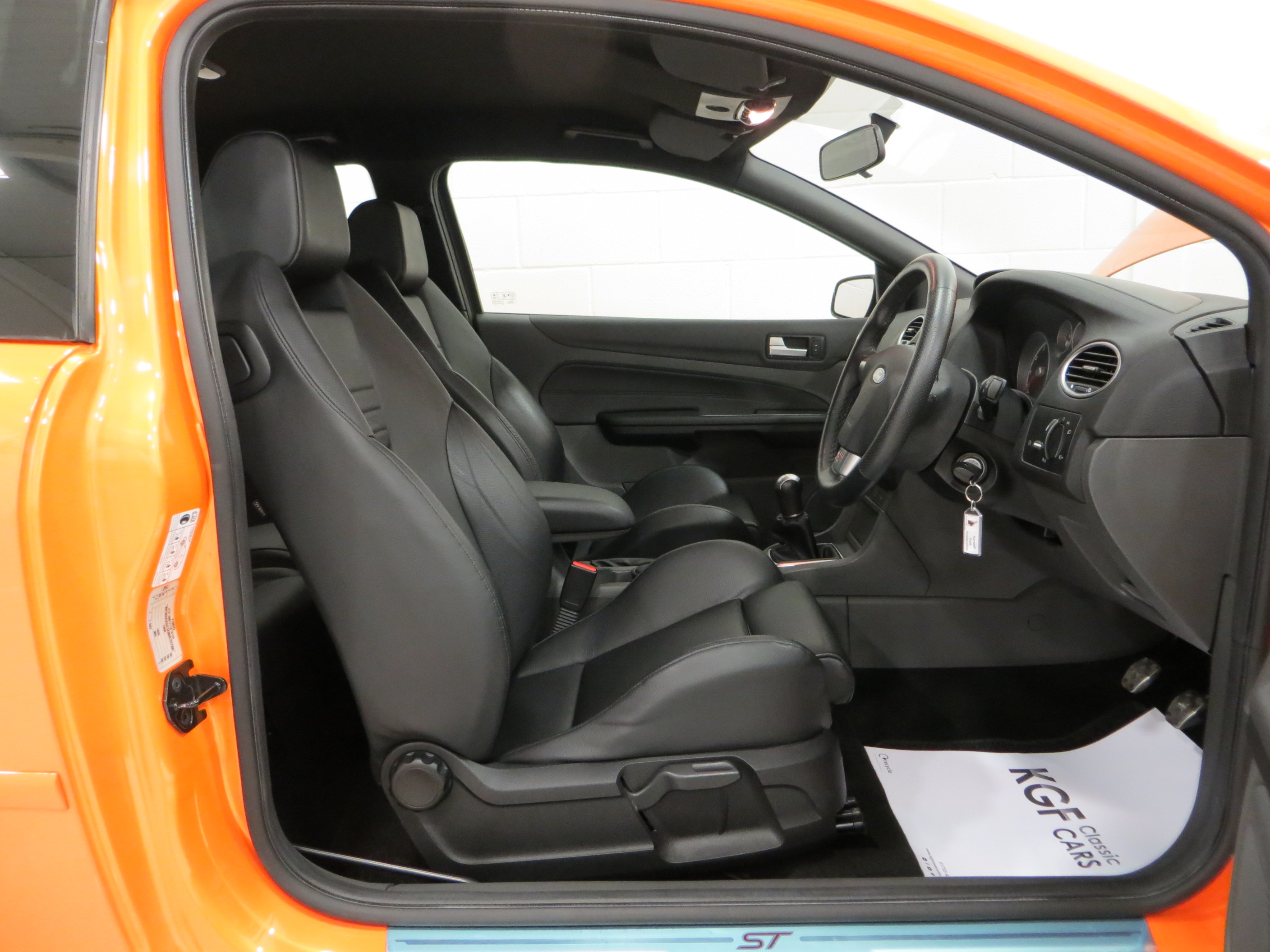 Exclusive ST sports body kit, unique ST bumpers and mesh grille, ST single wing spoiler, chrome tipped twin sport exhaust tailpipes, side and curtain airbags, Electronic Stability Program, Passive Anti-theft System (PATS), CAT 1 Thatcham Approved alarm, Bi-Xenon headlamps with automatic levelling and washer jets, air conditioning, Quick clear front windscreen, auxiliary instrument panel housing turbo boost, oil pressure and oil temperature gauges, ST Sports steering wheel, jet black headlining, submarine lighting, brushed aluminium gear knob and handbrake grip with racing pedals. Exclusive ST-3 equipment; Ford Sony MP3 stereo radio/6CD, Full leather Recaro sport seats, 10-way manual adjustment and seat heating to front seats, rear sculptured bench. Factory options; Electric Orange Tri-Coat metallic paintwork. Dealer options; Space-saver spare wheel, Fortron Shield protection, carpet mats.