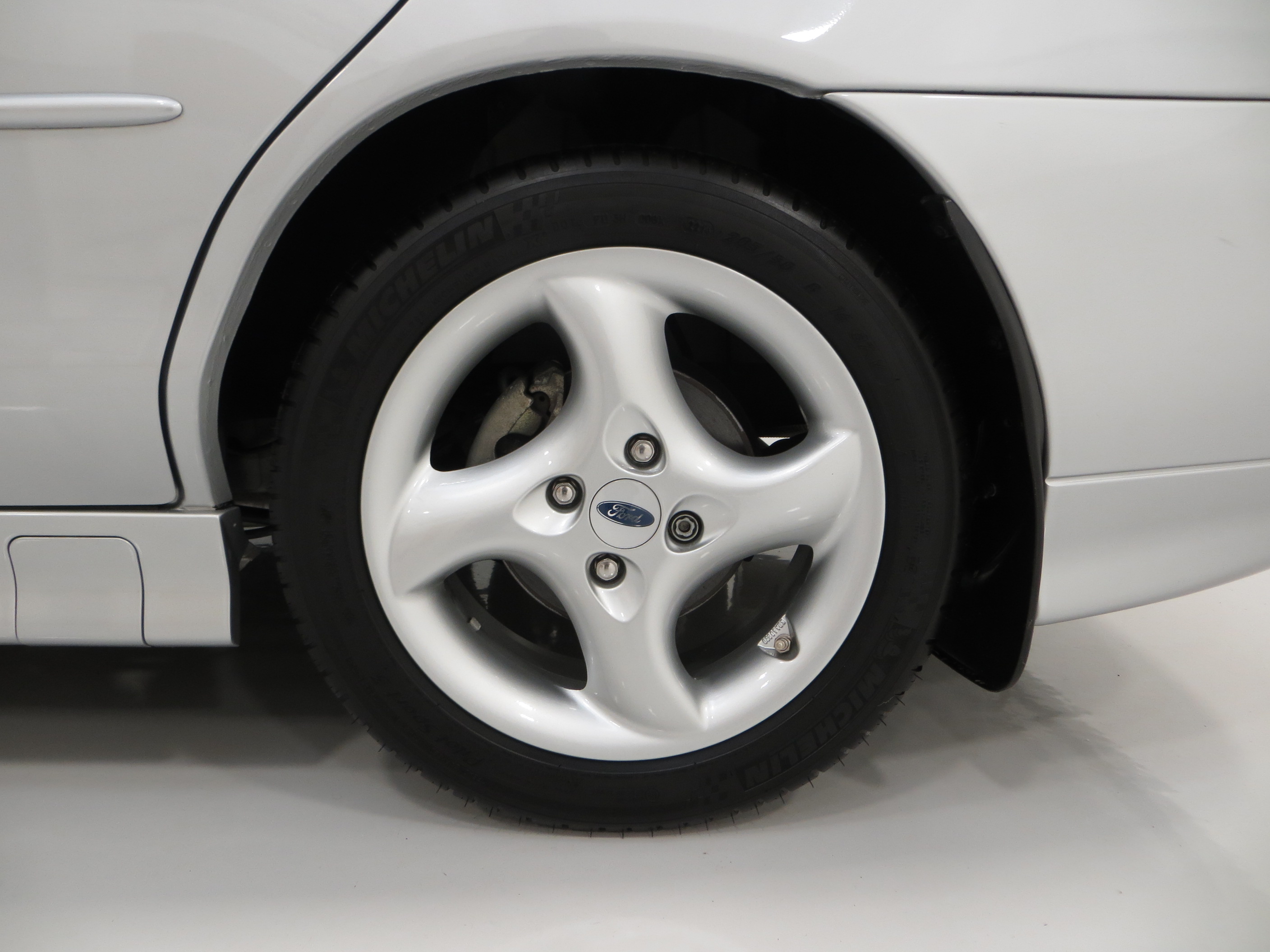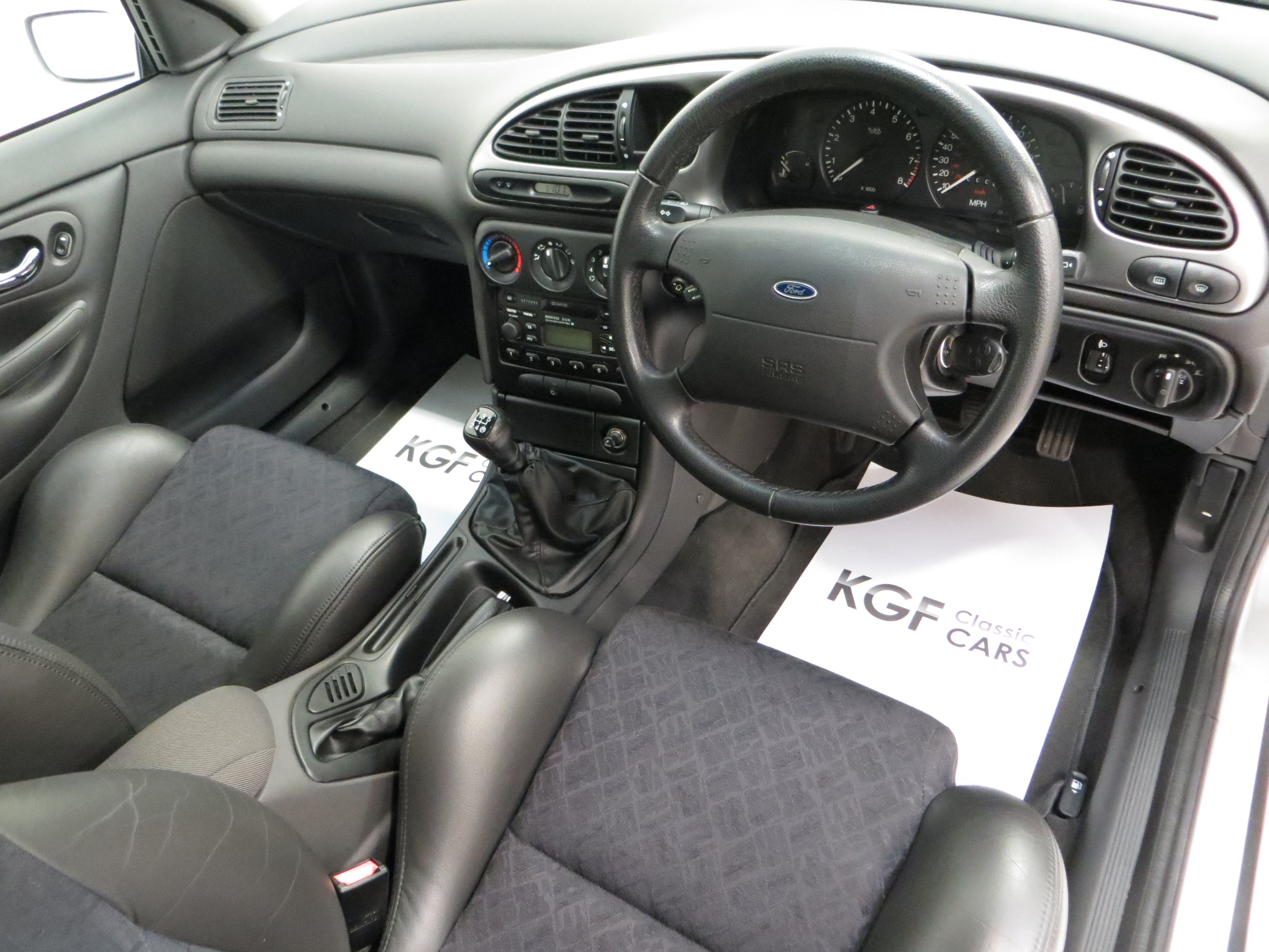 Performance and luxury in perfect harmony with the supportive sports seats finished in Midnight seat fabric with Match leather-trimmed seat bolsters, all unmarked. The perfect perforated leather trimmed steering wheel and gear knob have no wear thanks to the ultra-low 5,138 miles and the carpets have been protected by Ford mats. All controls function and are logical and uncluttered with precision focused movements. The Metallic finish on the instrument cluster bezel found only on the sporting models houses crystal clear working instrumentation and the Model 5000 radio/cassette still has the 6-disc cartridge wrapped in factory film never used! All door apertures are sparkling clean and the boot area appears unused. Truly exceptional and unquestionably an enthusiasts car.