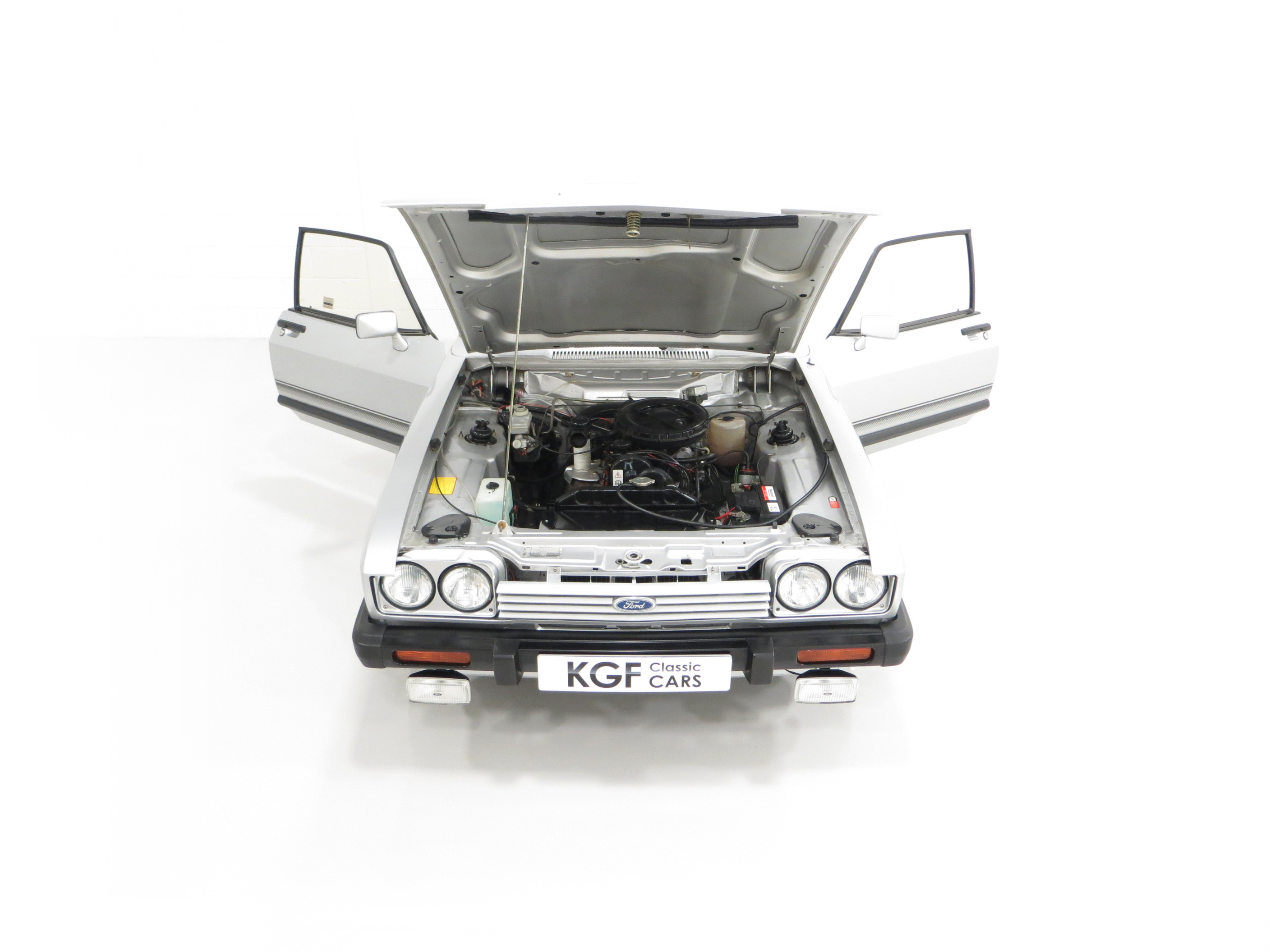 The term time warp is often overused but entirely justified with the interior of this exceptionally low mileage example. The ‘Truro II’ cloth trim, (Code XE), with matching door and quarter panel inserts is pristine and reflective of its 6,680-mile credential with absolutely no visible wear to the fabric. The colour matched carpeting and headlining are both immaculate and the dashboard is completely intact with no cracks whatsoever. All controls fully function including the two-speed heater fan and analogue quartz clock. A period replacement stereo has been fitted. The spotless boot area houses the original jack and unused spare wheel still with virgin Pirelli spare tyre with label and coloured banding to the tread. The parcel shelf is pin straight and untouched and factory stickers remains attached to the boot floor. An iconic and instantly familiar classic Ford interior.