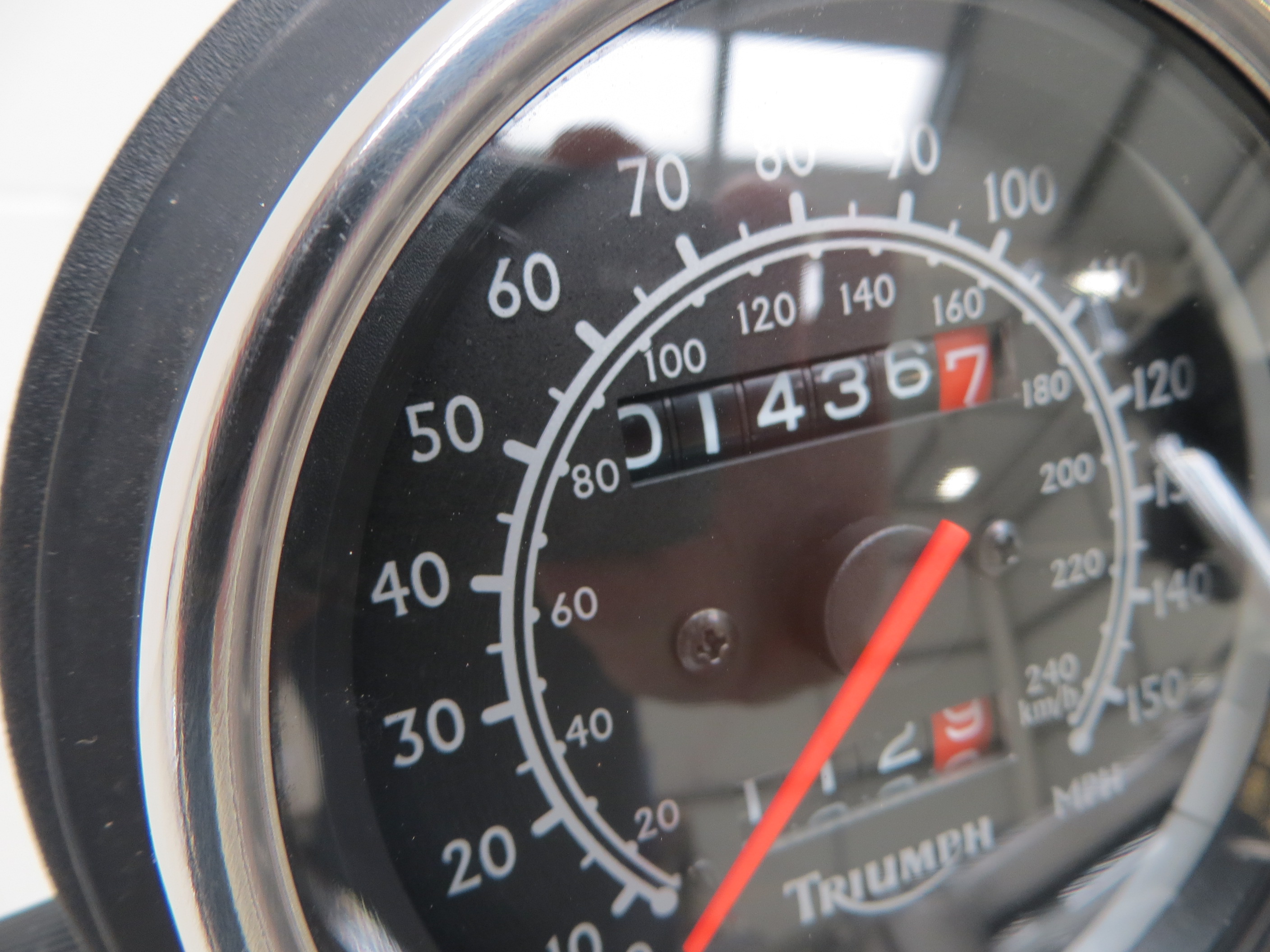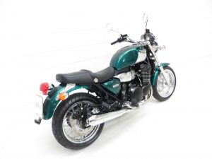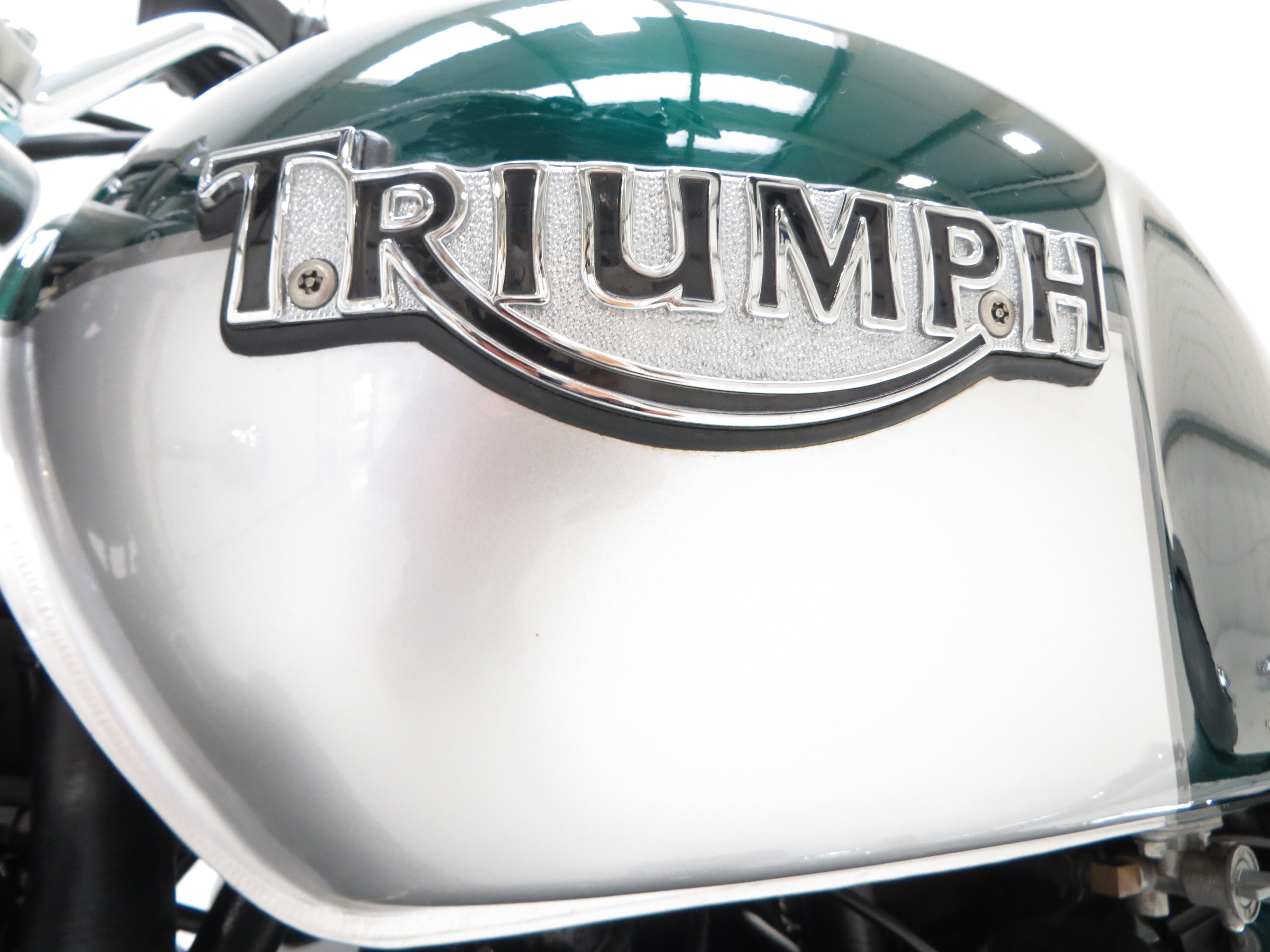 Micro alloyed high tensile steel spine frame, aluminium twin-sided swingarm, brushed finish front suspension with triple rate springs, monoshock rear suspension with adjustable preload, colour matched mudguards, satin black power coated engine, 15 litre tear-drop fuel tank, digital ignition with electric start, deep-chromed engine covers, pillion seat, reverse cone megaphone silencers, steering lock, twin chromed rear view mirrors, large chromed single headlamp unit, chrome-bezelled speedometer and tachometer, warning/information lamps, high beam lamp, heavy-chromed ‘old’ Triumph tank badges. Accessories; disc brake lock.