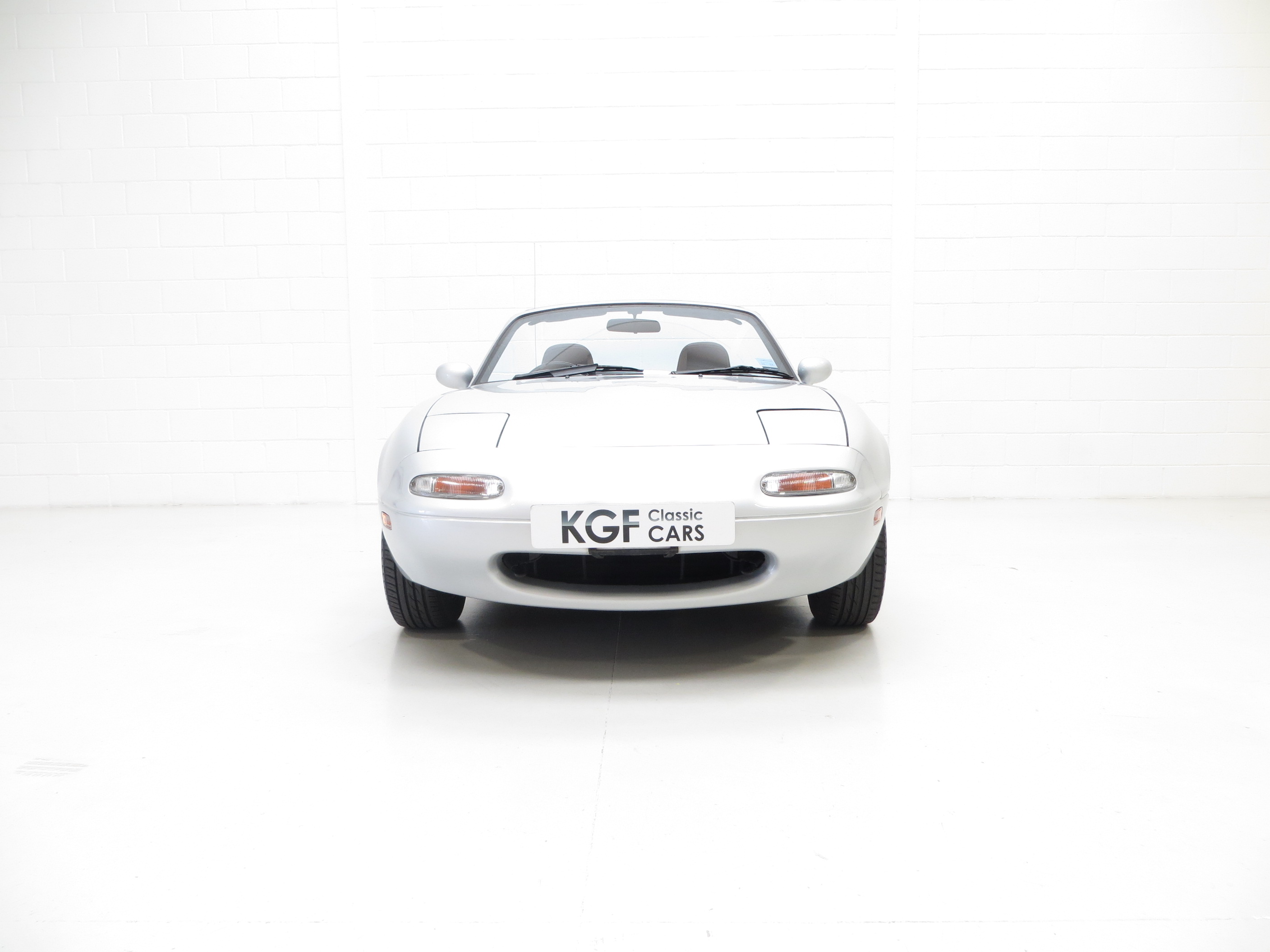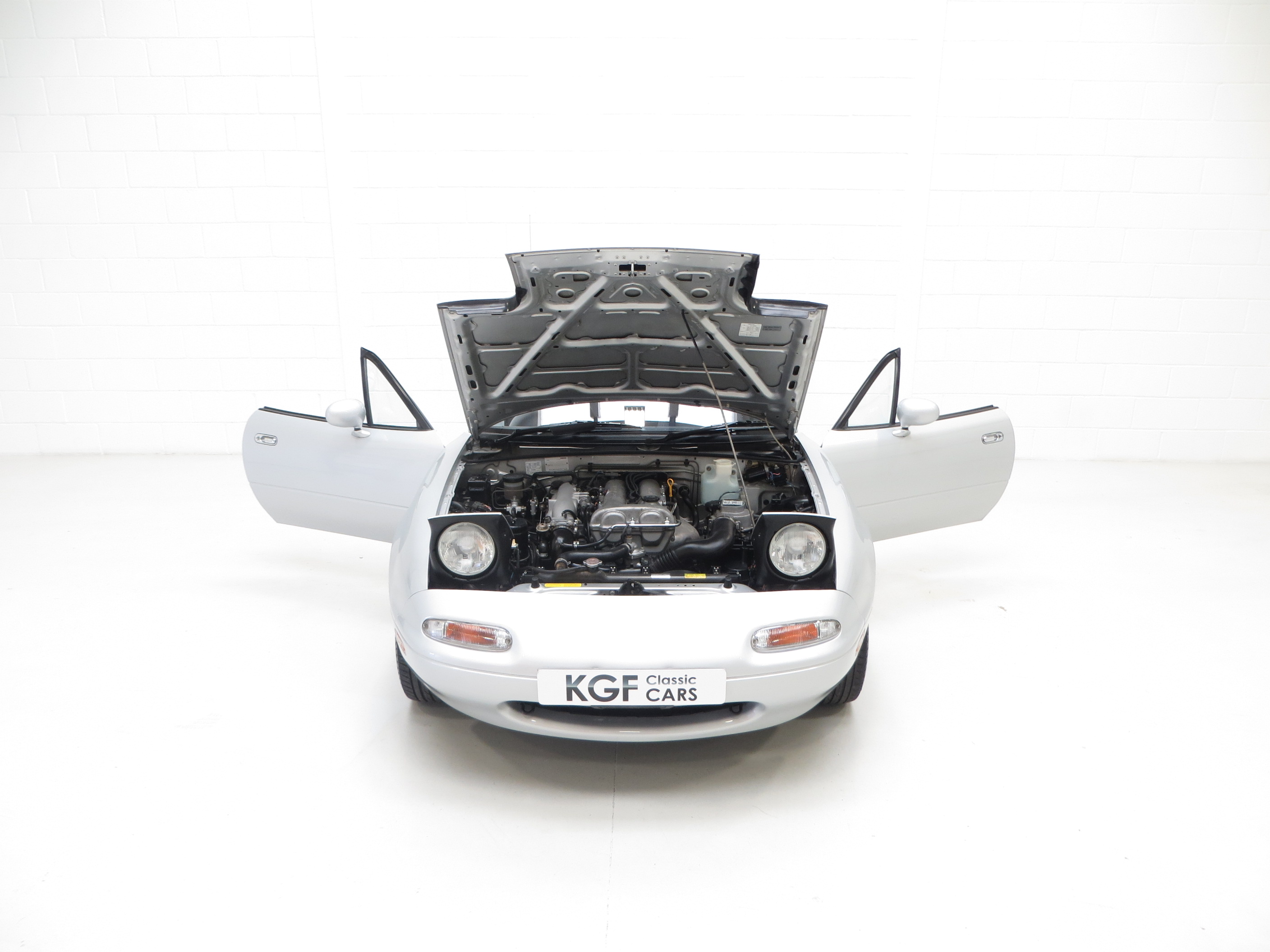 This delightful very early UK Mazda MX-5 is finished in Silver Stone Metallic (colour code 3L). The paintwork boasts an attractive bright shine and polished finish. Minor age related markings and small imperfections can be seen upon scrutiny, not detracting from the overall excellent appearance. A welcome absence of excess applied underseal allows easy inspection of the very good underside condition. The common modification trend has thankfully been avoided, and this unmolested example is just as Mazda intended. The trim sections are all intact and the black canvas hood is immaculate. The heated glass screen is a welcome upgrade from the often flimsy and discoloured Perspex. An instant success from Mazda upon UK launch in 1990, this example is one of the very first and ready to enjoy.