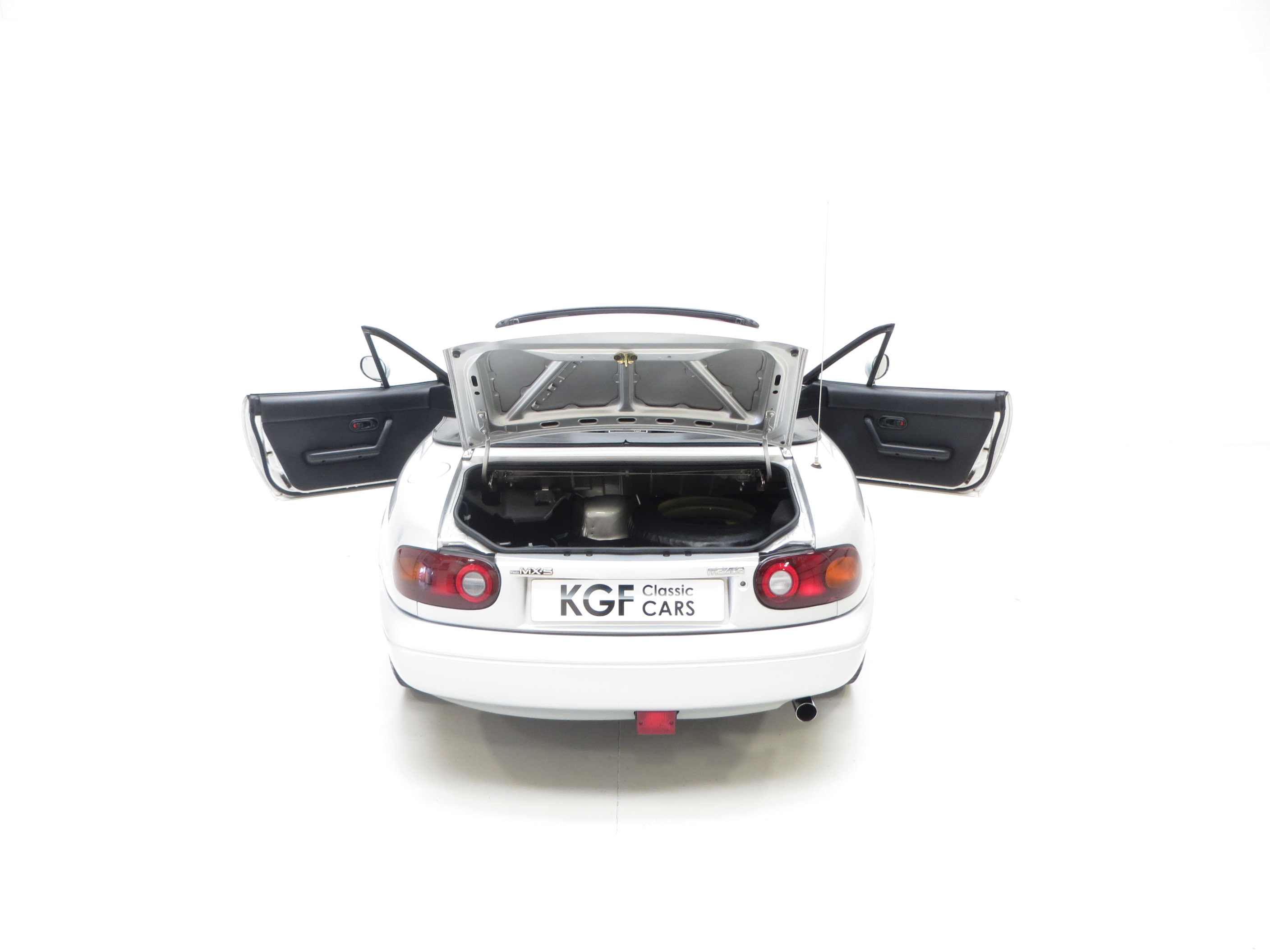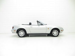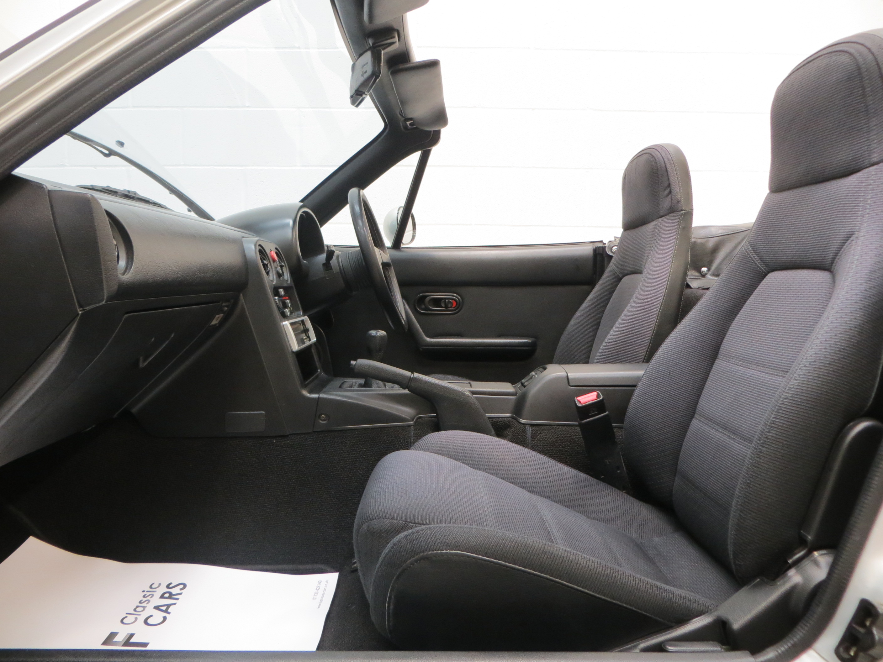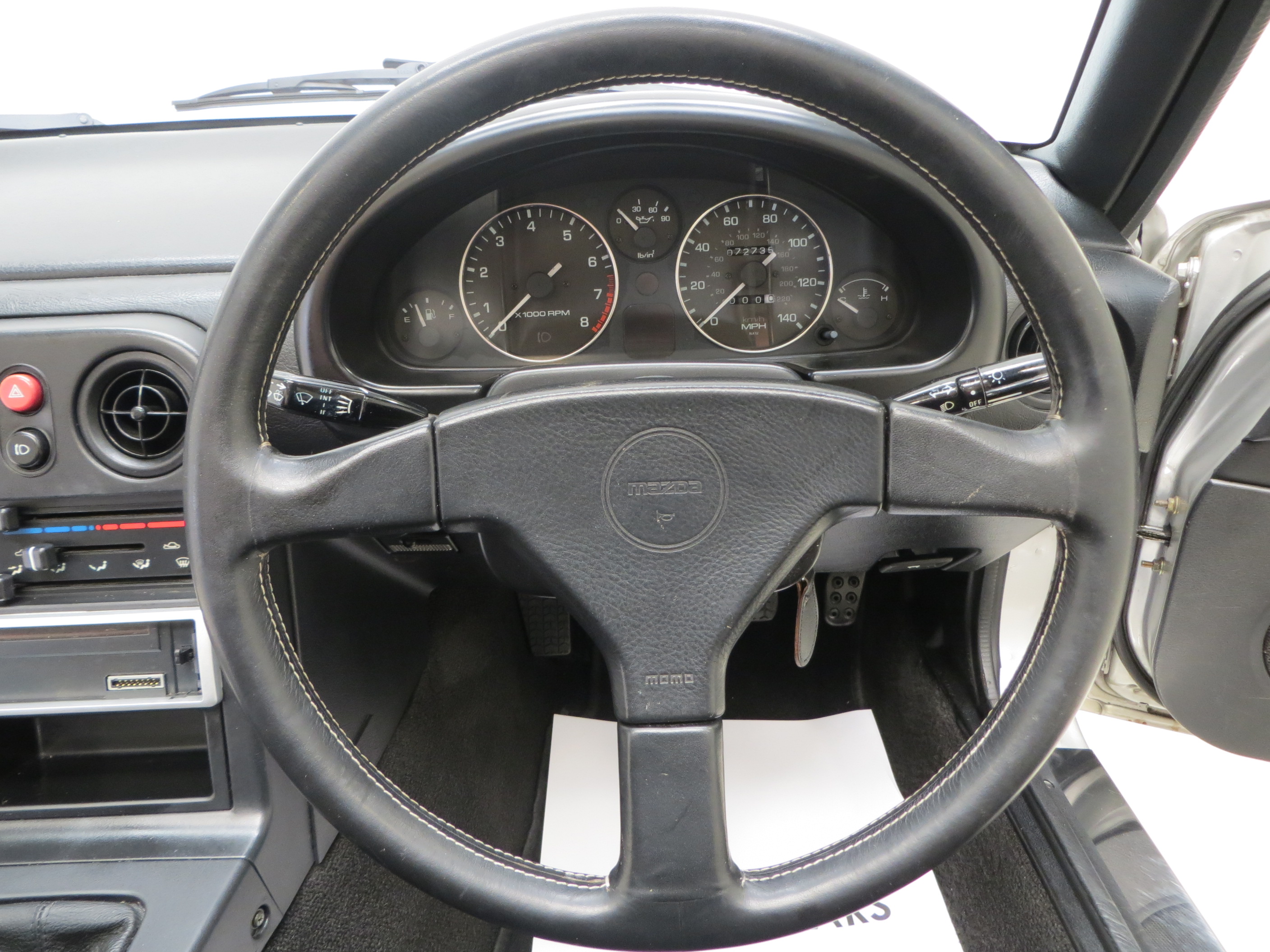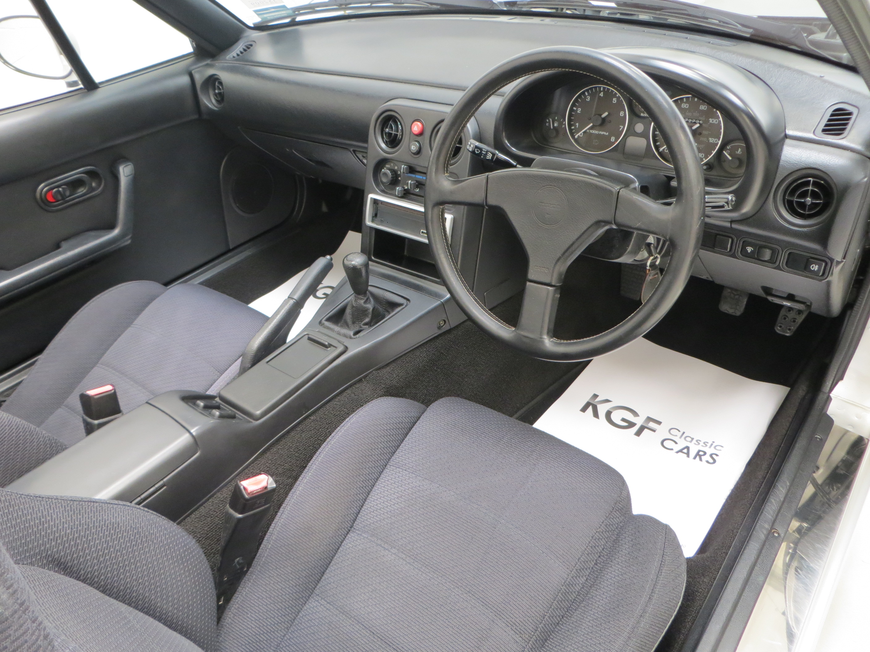 Trimmed in the standard Black Cloth upholstery this interior remains as Mazda intended, and everything is co-ordinated perfectly. The high backed seats offer maximum comfort and support, and show only light aging and minor thinning to the driver’s seat bolster. The classic sports dashboard houses a cluster of crystal clear instruments that function precisely, and the leather trimmed steering wheel with white stitching is fully intact. The tonneau cover and original wheel brace, jack and toolkit are all present and even the factory sticker remains attached to the boot carpet! The no frills driver focused concept perfected by Mazda is simply wonderful, and this example upholds that notion perfectly.