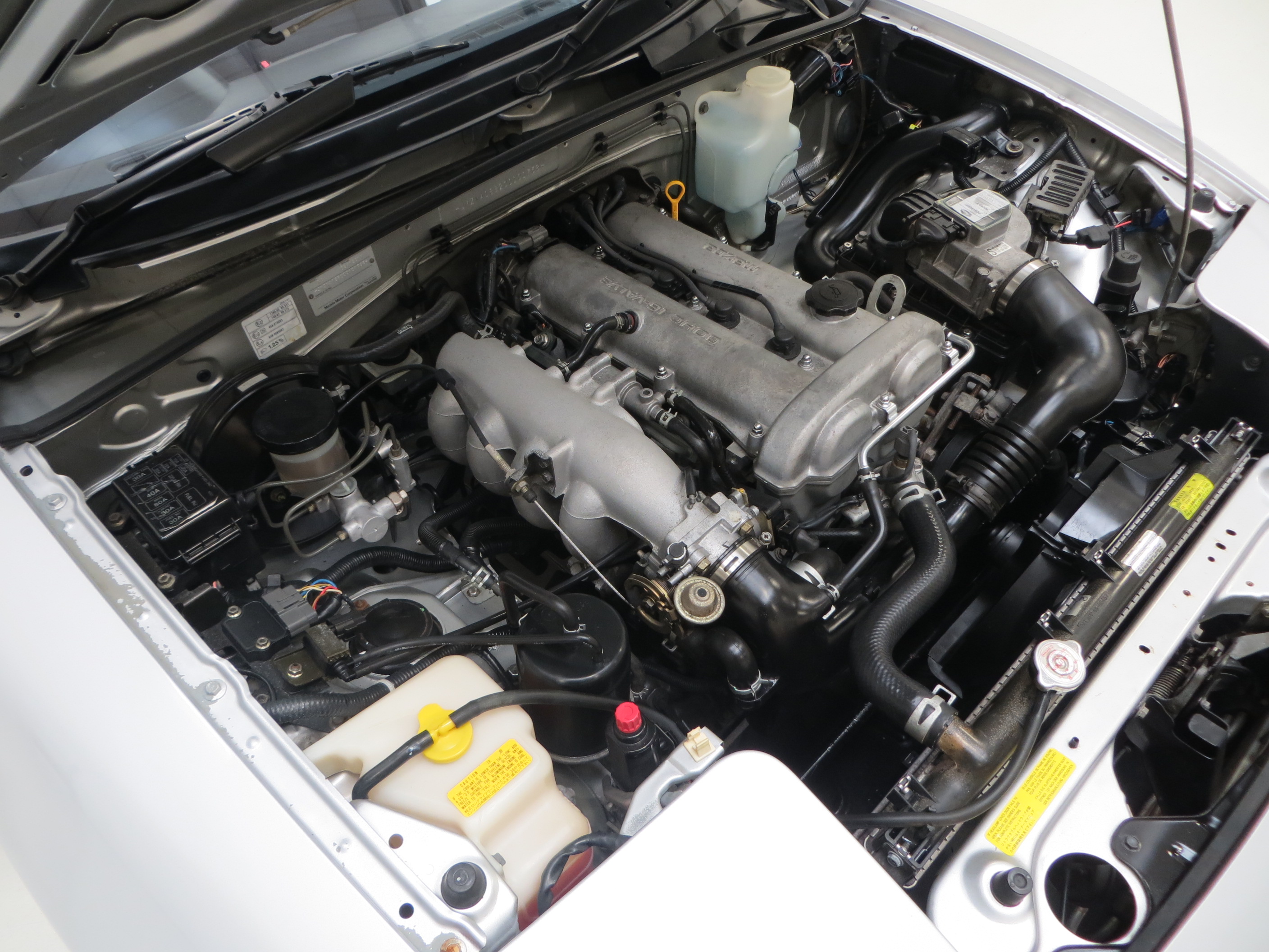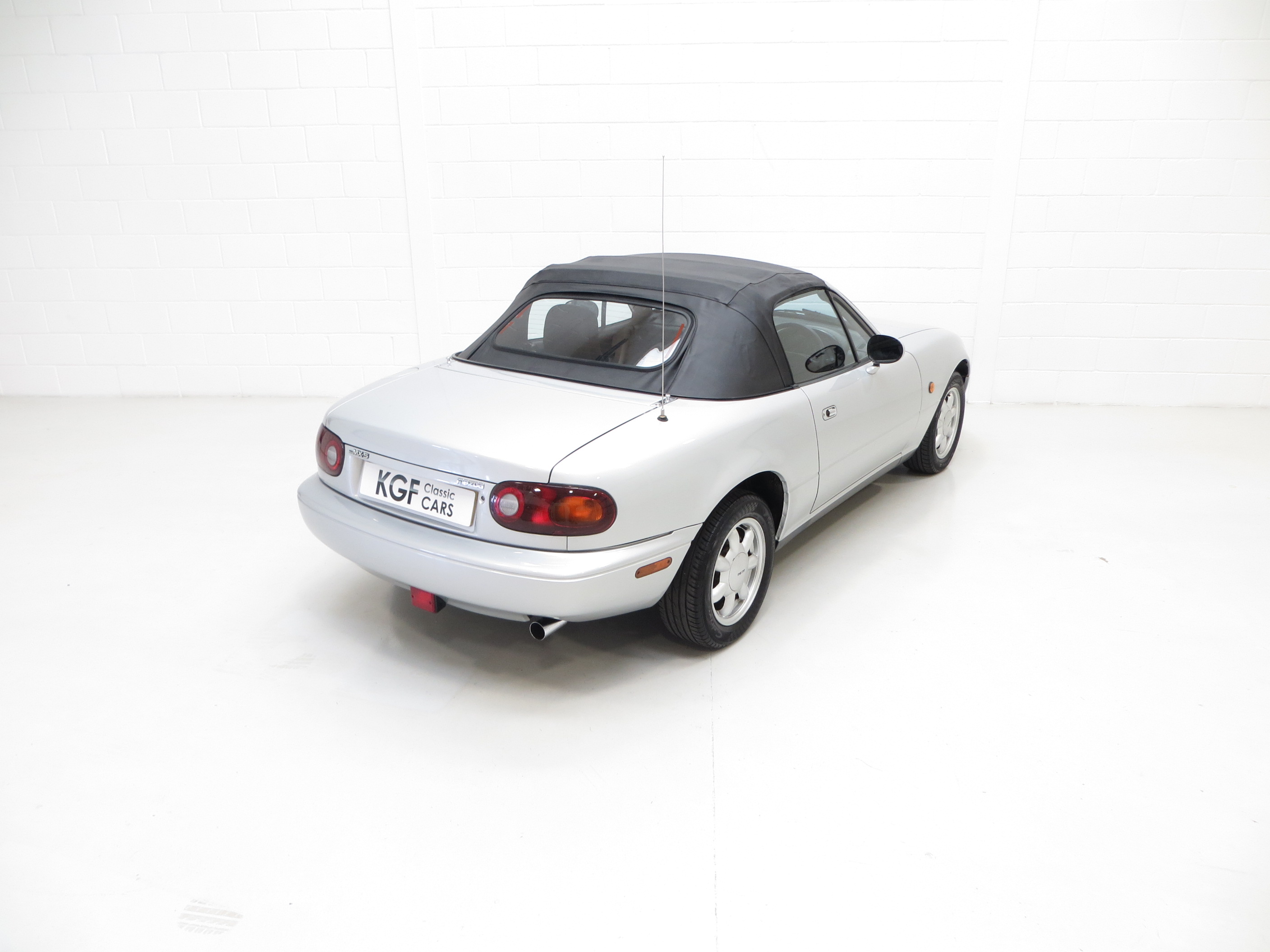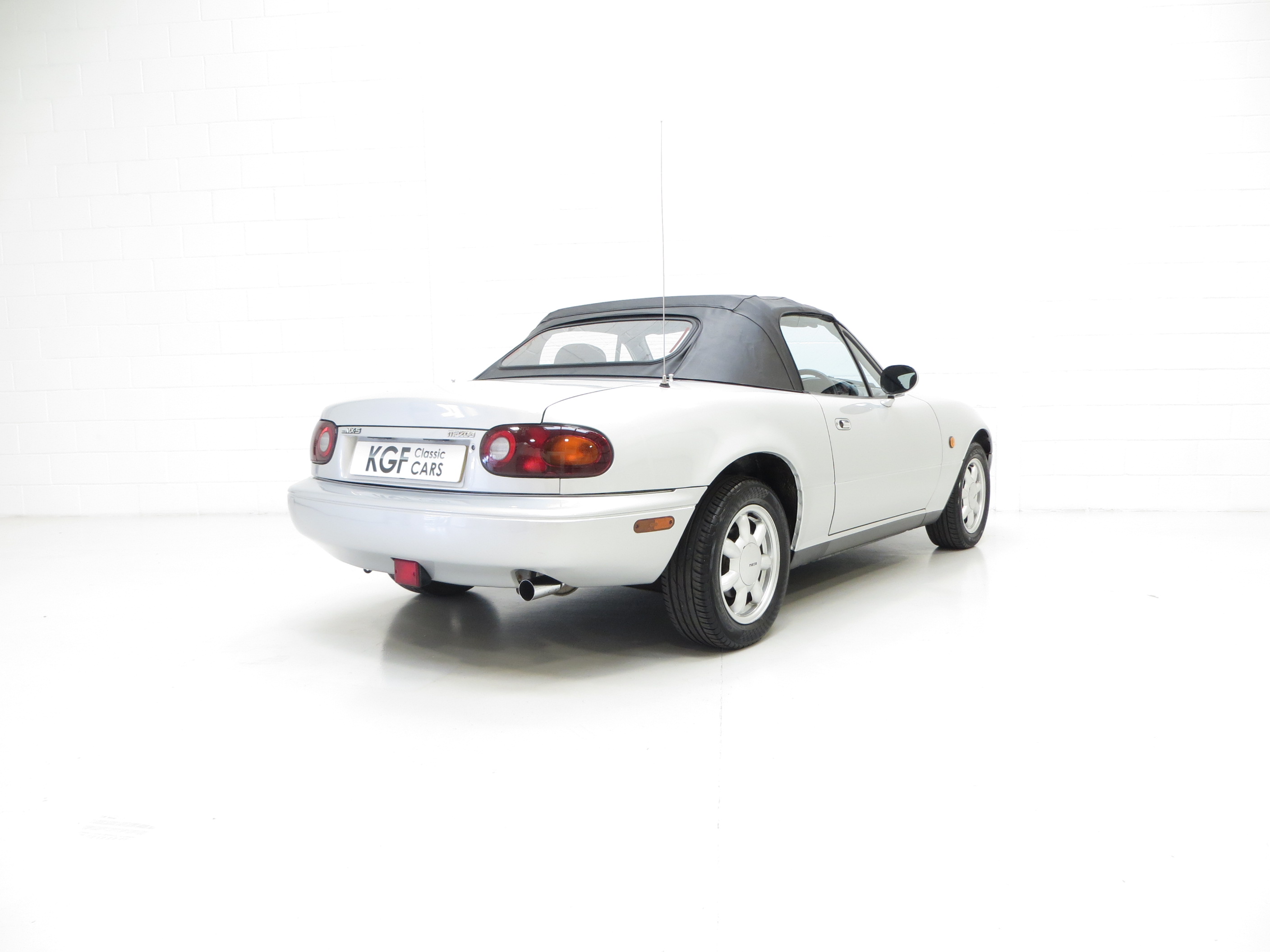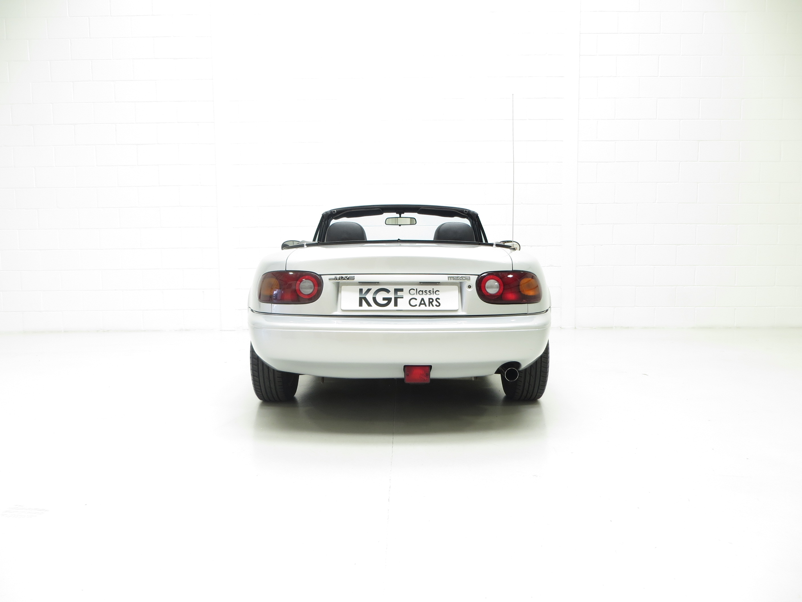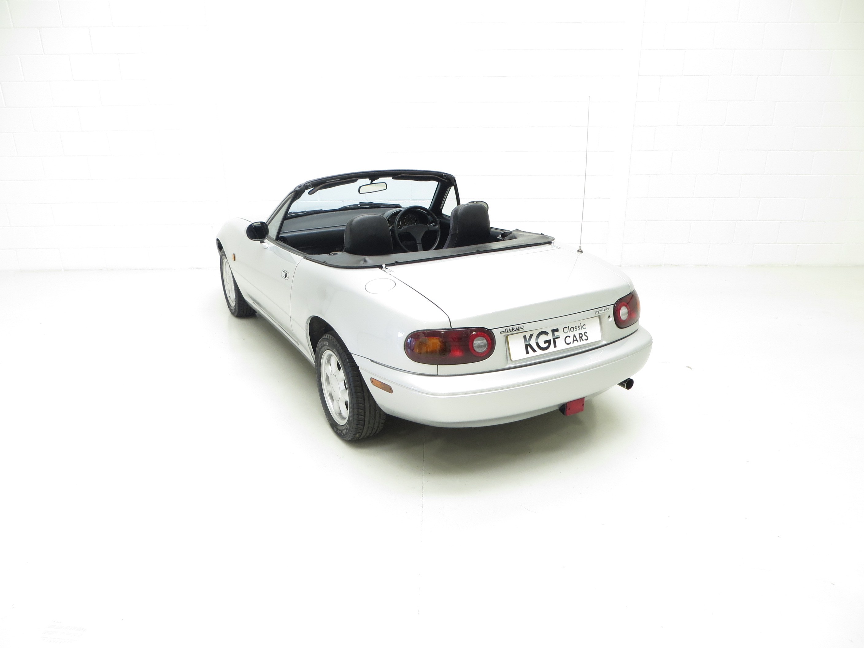 Trimmed in the standard Black Cloth upholstery this interior remains as Mazda intended, and everything is co-ordinated perfectly. The high backed seats offer maximum comfort and support, and show only light aging and minor thinning to the driver’s seat bolster. The classic sports dashboard houses a cluster of crystal clear instruments that function precisely, and the leather trimmed steering wheel with white stitching is fully intact. The tonneau cover and original wheel brace, jack and toolkit are all present and even the factory sticker remains attached to the boot carpet! The no frills driver focused concept perfected by Mazda is simply wonderful, and this example upholds that notion perfectly.