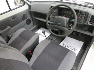 The interior is exactly as Ford intended and in perfect condition. The Tracer trim in Raven colour scheme, (Code LV), is no different now than when new in 1989! The colour-keyed velour carpet is truly immaculate and free from wear, and the perforated neutral tone headlining is flawless. All switchgear is functional and intact with a new feel, and the soft finish dashboard is perfect. The original Ford stereo radio (Model 2001) remains fitted. A spotlessly clean boot area reveals a pin straight uncut parcel shelf with the correct rubber hangers, and the lower boot storage areas have factory build stickers and foam insulation. An interior absolutely worthy of the often over used descriptive ‘time warp’, where even the 1980’s Ford scent has not been lost!