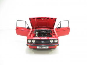 Polyurethane front end incorporating four Cibie quartz halogen headlamps, front air dam, rubberised tail spoiler, twin bodyside coachline, RS2000 decals, black door mirrors, laminated windscreen, hazard warning flashers, heated rear window, separate fuel, water temperature and oil pressure gauges, padded sun visors, two-speed heater, aeroflow ventilation with eye ball vents. RS Custom features; Recaro front seats with fishnet headrests, centre console, glovebox, quartz clock, remote control drivers door mirror, bronze tinted glass, full trimmed door cards, cut pile carpeting, vanity mirror, alloy road wheels. Accessories; Vinyl roof with Webasto sliding sunroof, Ford RST 21P cassette player.