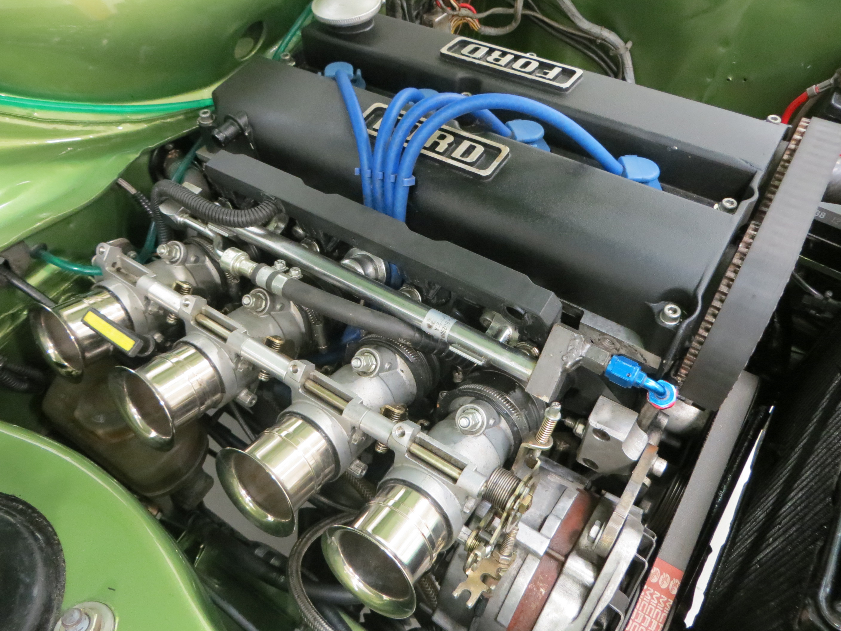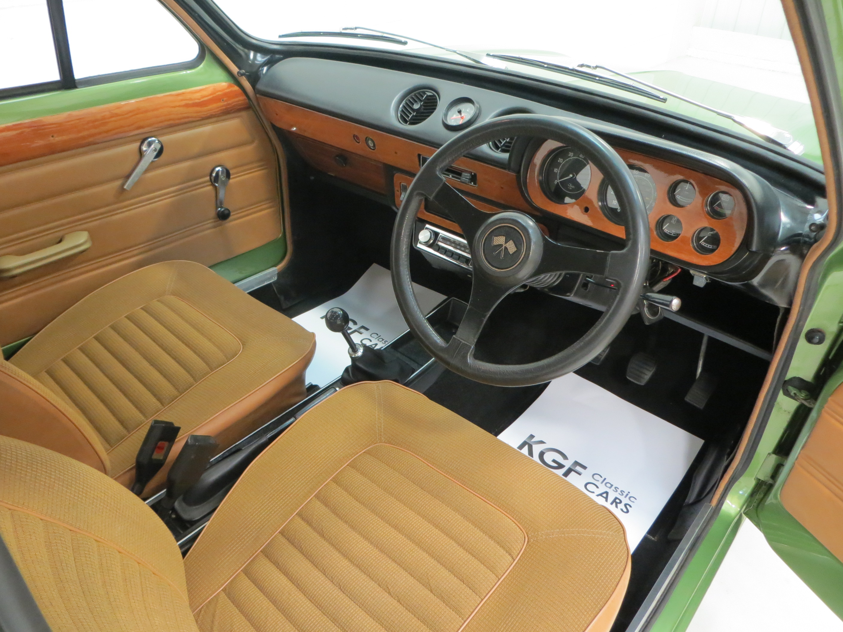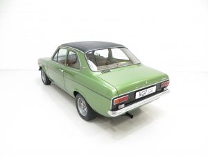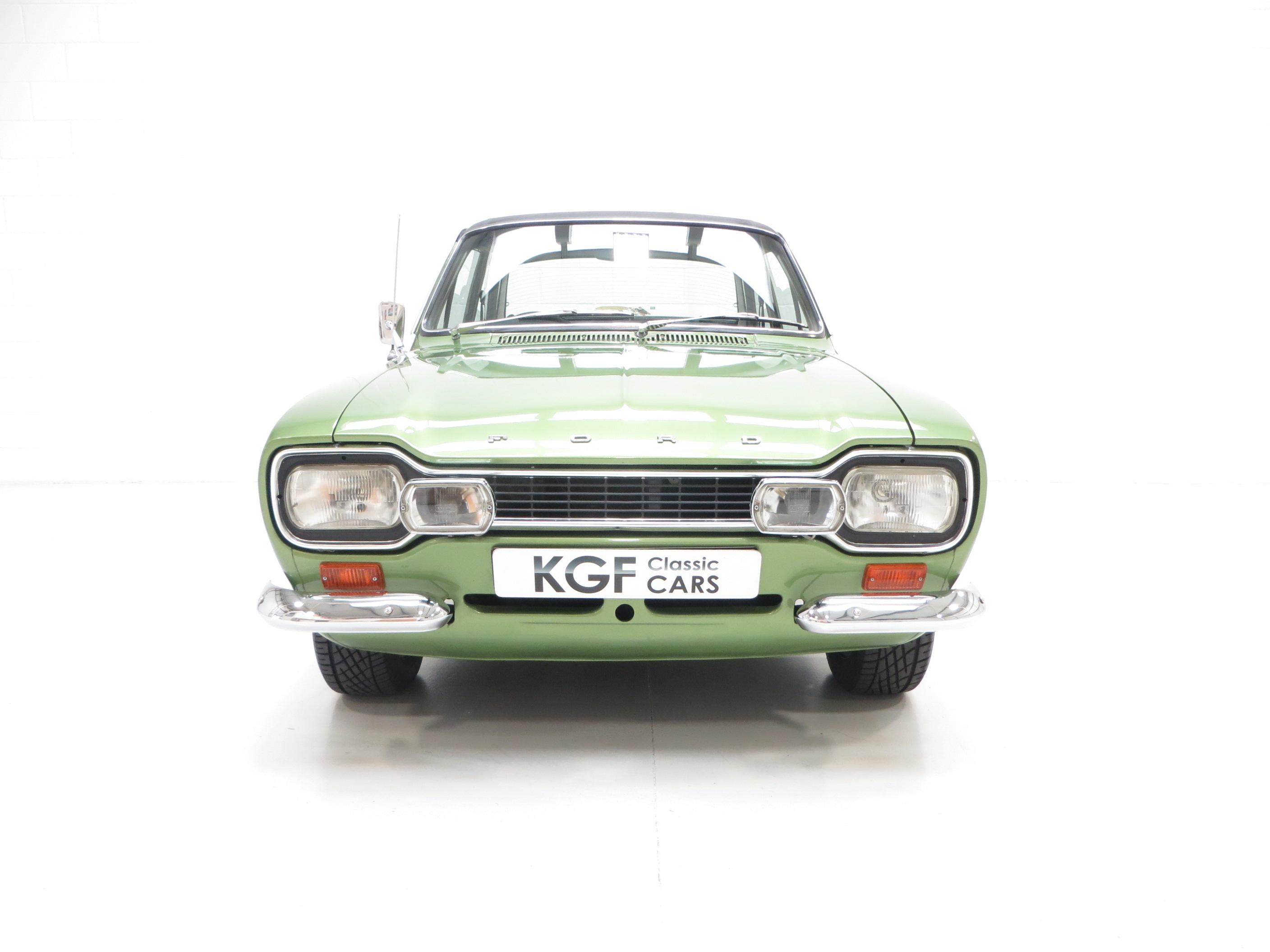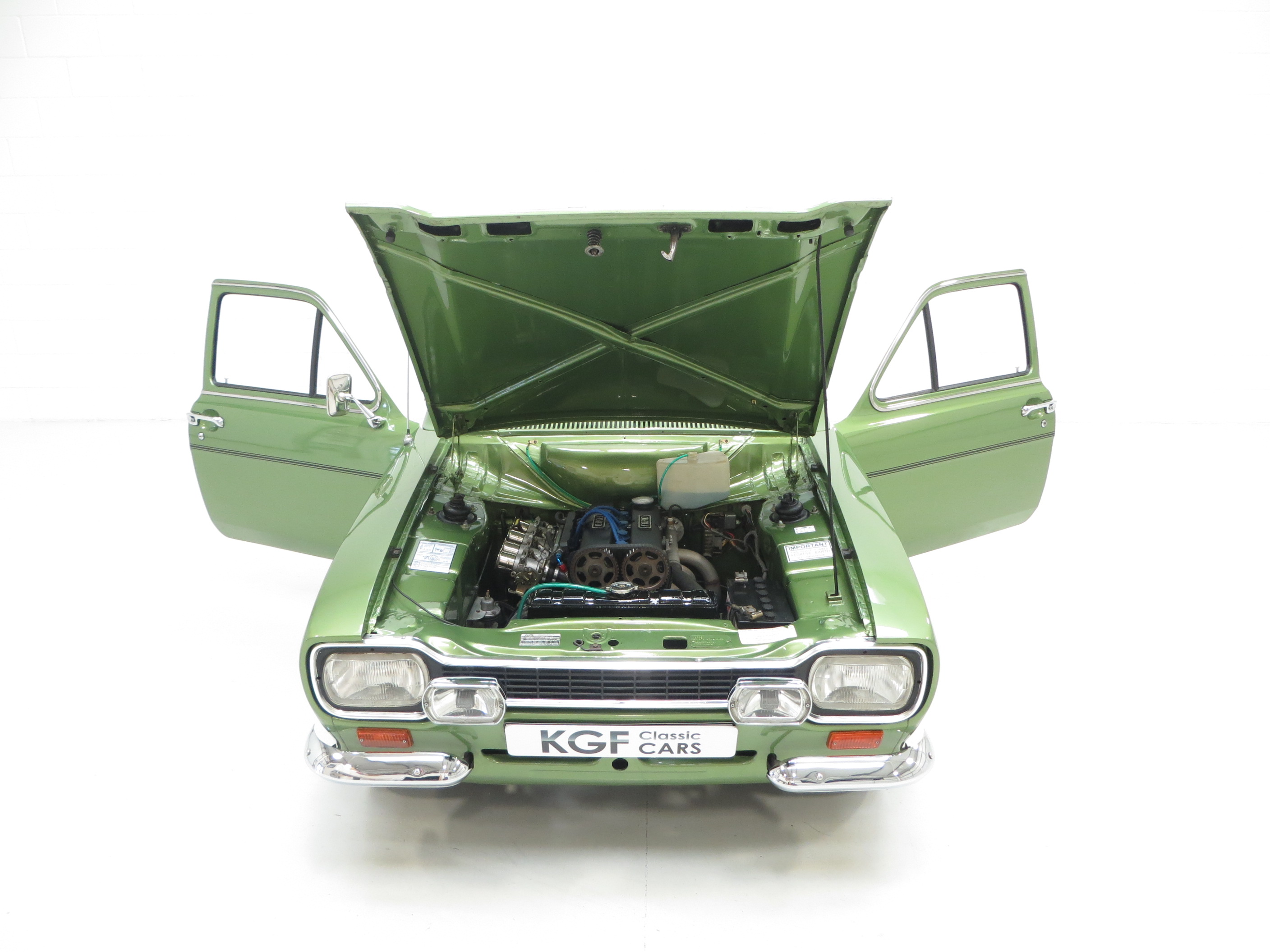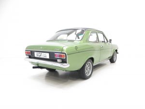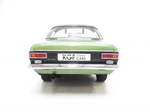 The 1300E was eventually available in 14 body colours, this Series Two car is immensely rare having been specified in metallic Special Order Oynx Green, (Code 54), confirmed by both the original sales invoice and body plate. The car wore the factory paint until 2007 when all glass, doors and trim was removed and a repaint commissioned. A fabulous gloss shine remains some 10 years later revealing the quality of workmanship. Connoisseurs of the model will note the unique side repeaters on the front wings along with the 1300E badges, Lucas LR8 driving lamps, door mounted mirror and satin black rear panel. Rare features such as the optional factory aerial with the base stamped Ford logo and colour-coded factory petrol cap remain fitted. Expensive and genuine Mexico front quarter bumpers and an early Twin Cam rear bumper without the number plate lamp notch have been re-chromed by Midland Plating in Northampton and add a sporting look to match the power within!