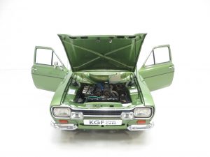 Black vinyl roof, chrome beading, halogen auxiliary lamps, flared front wheel arches, door mounted mirror, luggage compartment light, anti-burst door locks, six dial dash, ammeter, tachometer, oil pressure gauge, heated rear window. Factory Options: Push button radio, metallic paint, inertia reel seat belts, Ford fire extinguisher. Modifications in brief: Genuine Ford Mexico quarter bumpers and Twin Cam rear bumper, 2.0 ZETEC Silver-Top engine with throttle body fuel injection, Peter Lloyd Rallying twin silencer exhaust, Emerald programmable ECU with Innovate wideband lambda sensor controller – laptop and software included, RS2000 alloy bellhousing, Type 9 gearbox (5 speed) with quiet quick shift gear lever, RS2000 prop shaft, RS2000 3:54 rear differential, Bilstein suspension all around, high ratio steering rack (quick rack) with Group 4 steering joint and genuine Ford green track rod ends, remote central locking.