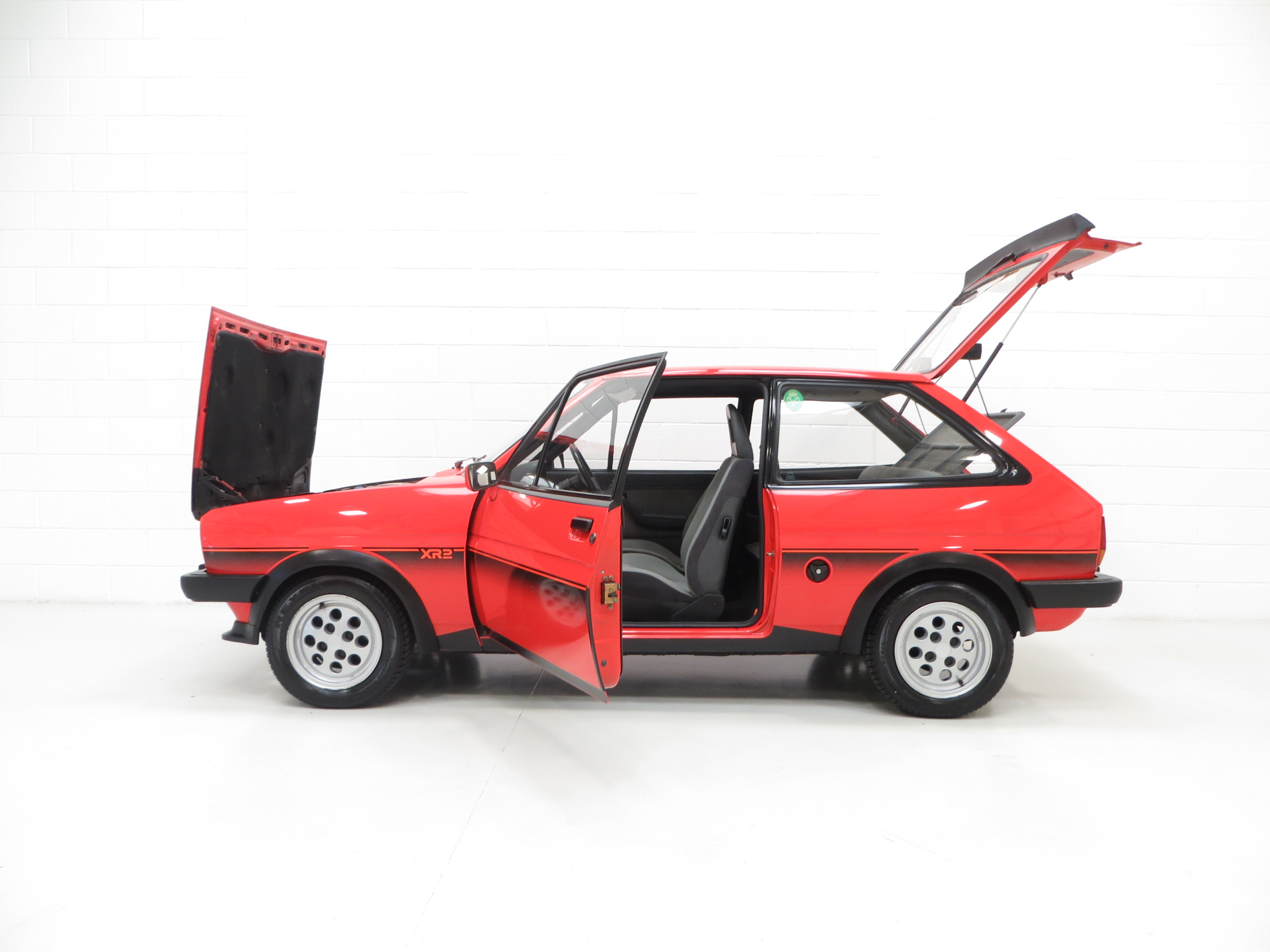 Louvred design radiator grille with aerofoil section, aerodynamic front and rear black spoilers, black wheelarch extensions, twin body coloured doors mirrors, special XR2 bodyside decal treatments, extended black window surround paint, storage compartment under rear-floor, laminated windscreen, Ford P21 push button stereo, two speed plus intermittent wipe, tailgate wash/wipe, heated rear window, tachometer, trip recorder, driving lamps, soft feel special steering wheel, perforated ‘Cool Black’ headlining, digital header mounted clock, loadspace carpet, cigar lighter, illuminated interior controls. Dealer options: Ziebart rust proofing treatment, Ford rubber floor mats.
