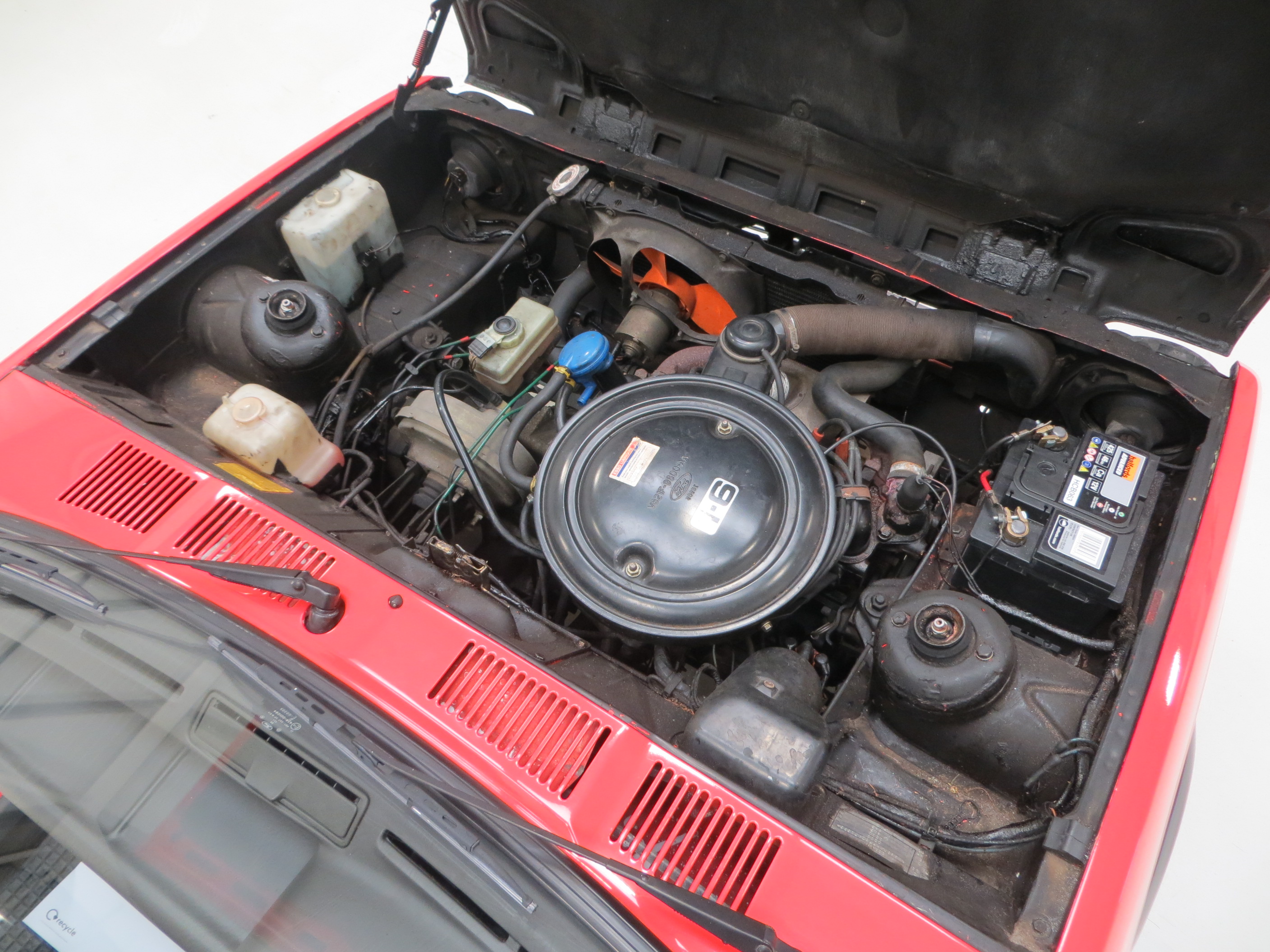Special ‘pepperpot’ 13” X 6” alloy wheels, as with the rest of the car, have never been refurbished and display prominent Ford emblems and manufacture raised markings. A few light markings are visible. The spare alloy wheel still wrapped in the original Pirelli P6 rubber sits in the boot wheel housing which incorporates the correct ‘bulged’ rear lower valance designed to accommodate the enlarged alloy wheel compared with lower Fiesta models. The dual line servo assisted brakes with ventilated 9.4” front discs and 7.0” rear drums bring the car up to a steady, straight and assured halt.