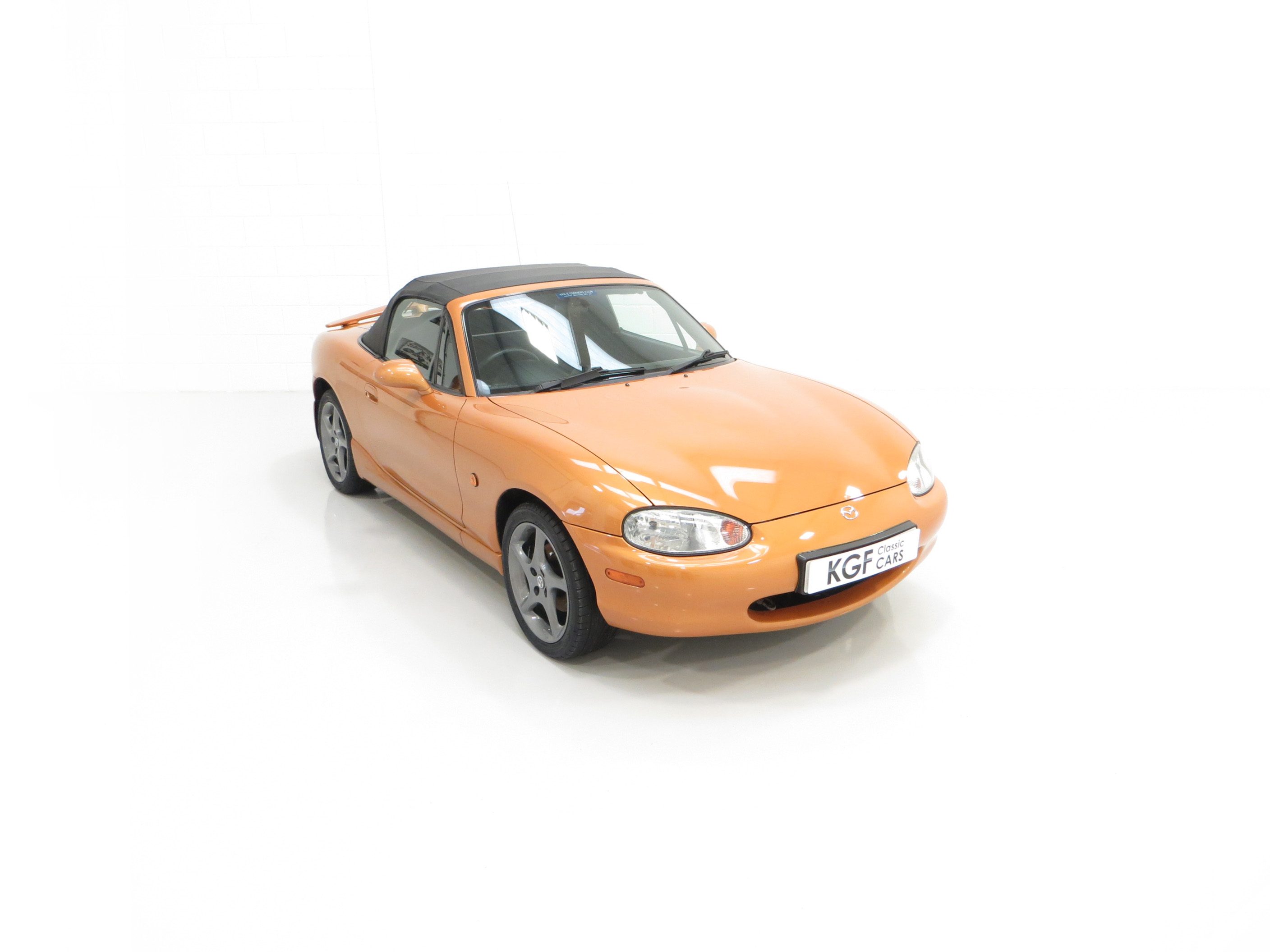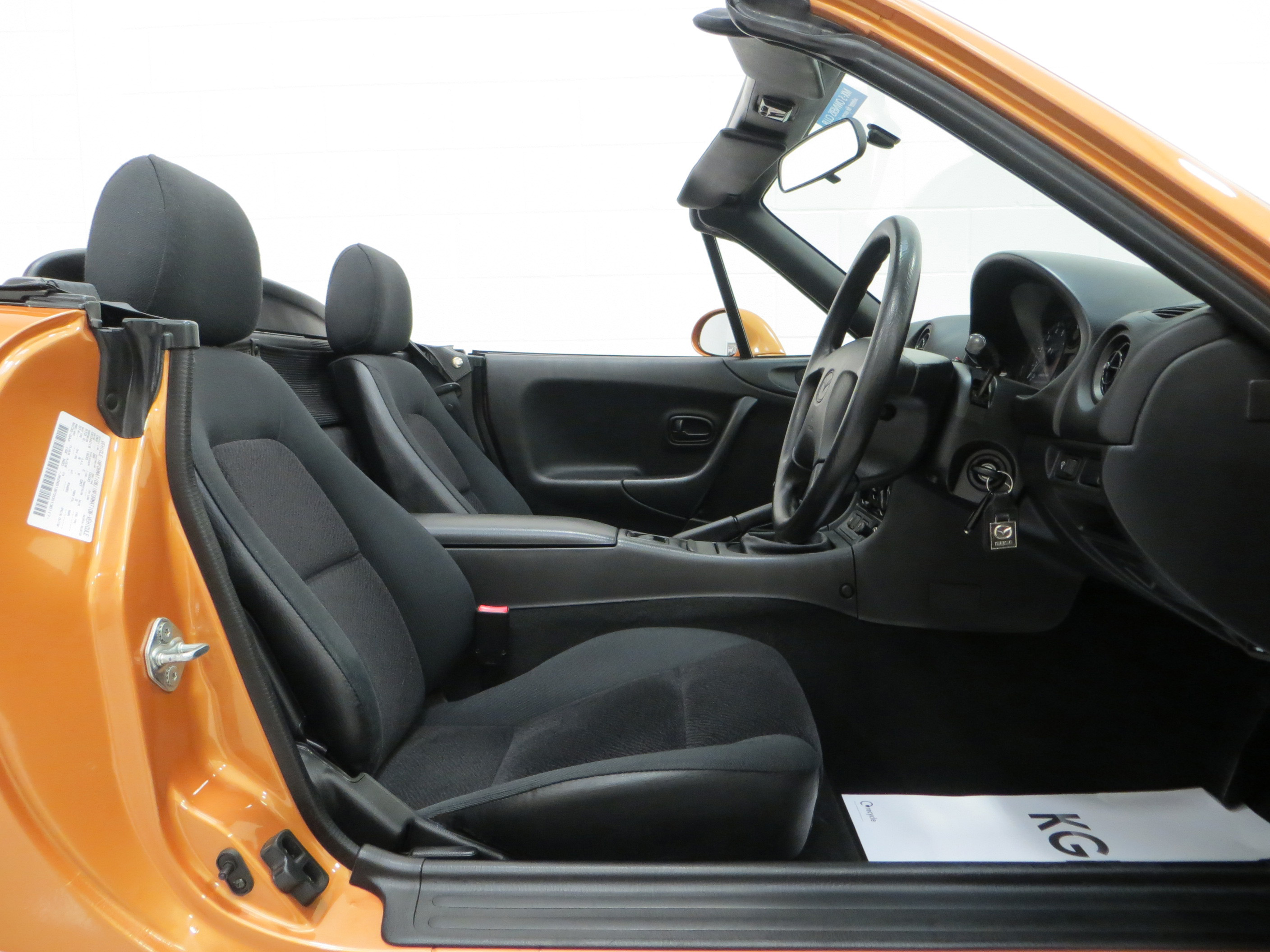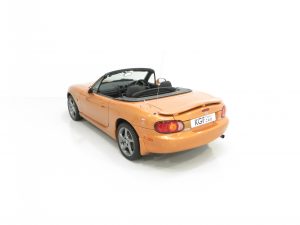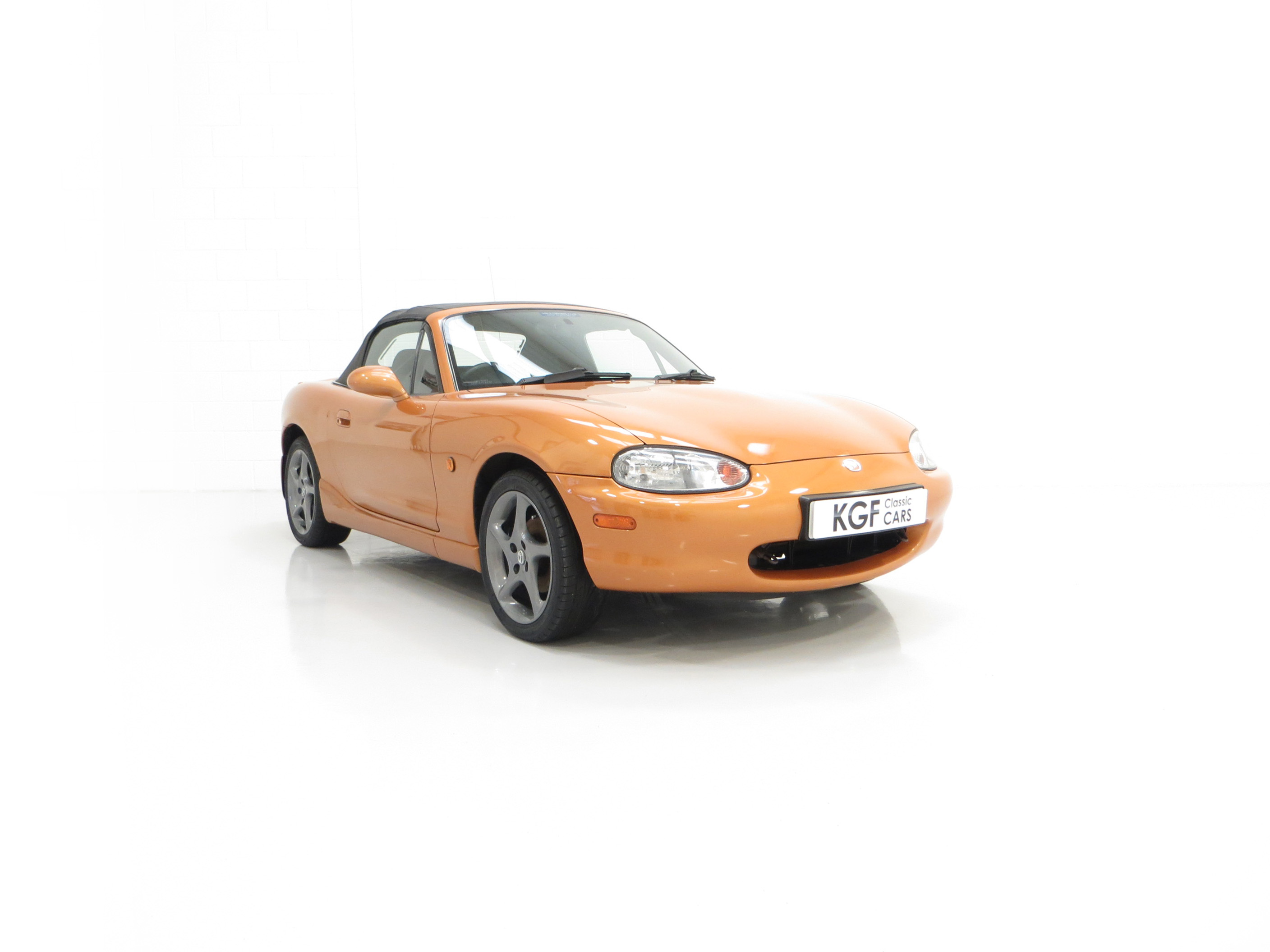 This truly exceptional Mazda MX-5 is finished in factory original Evolution Orange Mica/Metallic, (Code 18K), a cost option when ordered from new and the signature colour for the Mk2 upon its launch (sometimes also referred to as Racing Bronze). Having covered a remarkably low 19,571 miles from new, this garaged and cherished example is positively incomparable to most offerings. The stunning paintwork boasts a near impeccable finish will delight even the most meticulous scrutineer. A tiny touched in scratch to the bonnet edge and some miniscule dings to the driver’s door are barely even worthy of mention and all trim sections and bumpers are immaculate. The underside reflects the very minimal use and the wheel arch lips display the correct factory spot welds. The black canvas hood is in perfect order with a tight fit and the much-improved original glass rear screen is heated. Factory labels remain within the door shuts to further uphold the originality. The epitome of a modern classic sports car, preserved to the highest order.