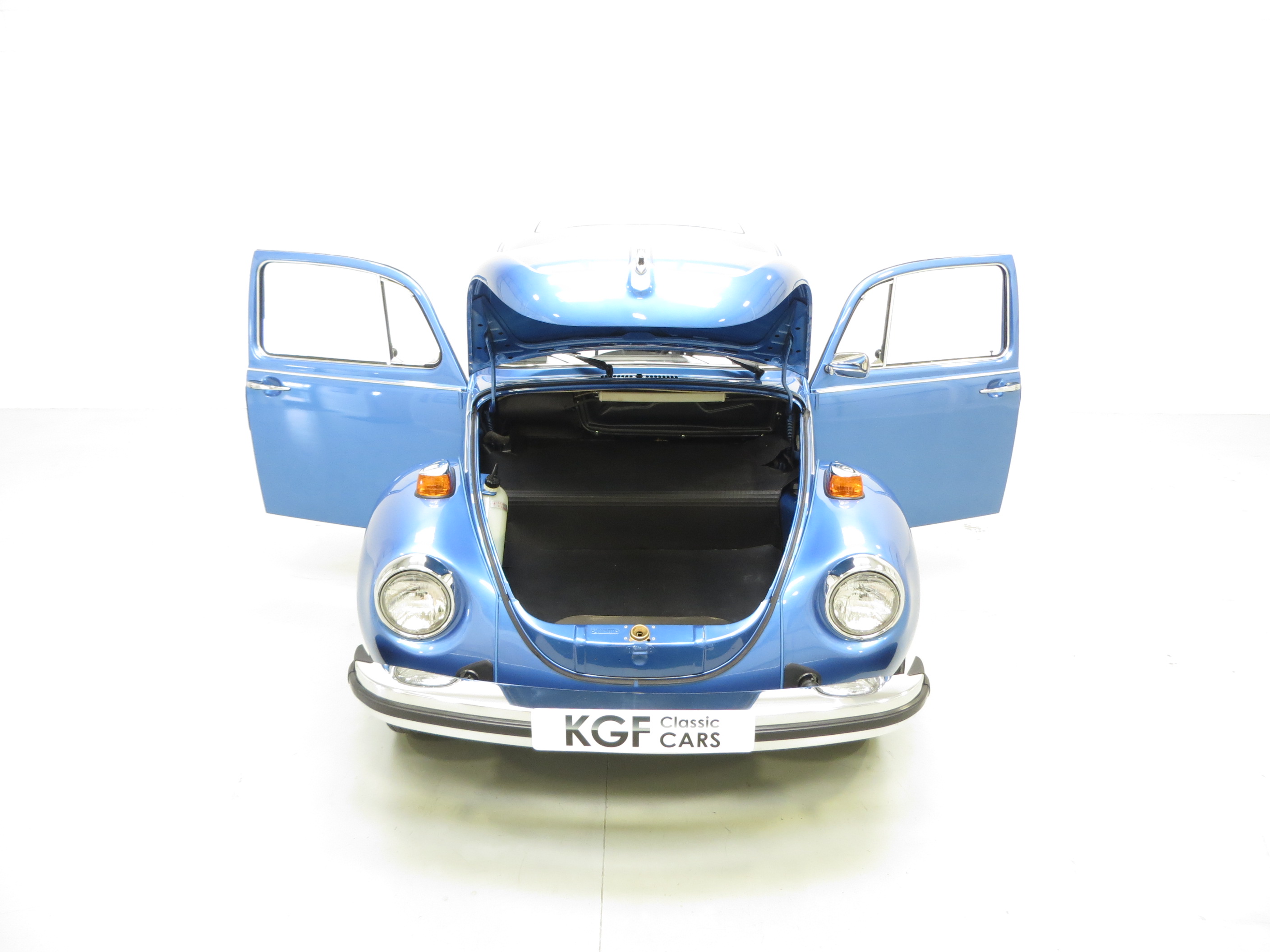 Simply magnificent this prized and collectable La Grande Bug is striking finished in one of only three limited edition colours available, Ancona Blue, (Code L97B). A rich, sparkling factory perfect metallic coat will astonish onlookers who will marvel at the impeccable condition and only in the professional concours arena will the tiniest of marks be noted. Such is the perfect originality of this vehicle that it was invited to stand amongst the Meguiars winners at the 2011 NEC Classic Motor Show, a true testament to the excellent condition this car is in. Perfectionists and VW purists will enjoy pointing out all the factory stickers, tags and labels often lost within the cars first few weeks of usage. Engine detail is factory fresh. A bold statement, but possibly the best Volkswagen Beetle available.