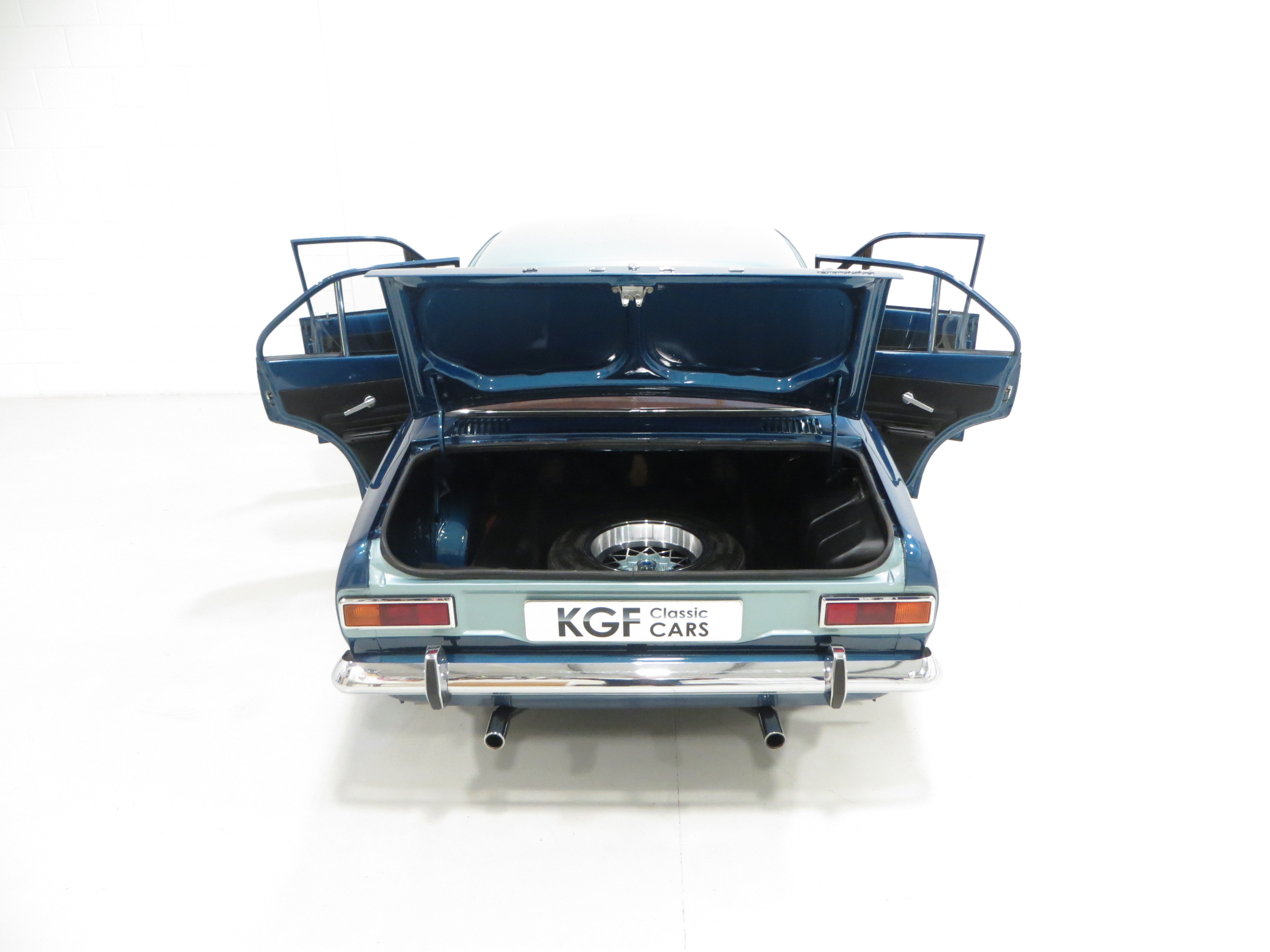 Flared front and rear wheel arches, bonnet bulge, chrome door mirrors, Super Speed badges, anti-burst door locks, six dial dash, ammeter, tachometer, oil pressure gauge, heated rear window, interior light, Ford RS three-spoke leather sports steering wheel, padded dash, Modifications in brief; Ford Essex 3.0 V6, Type 5 gearbox, Capri Mk1 Atlas rear axle, front Bilstein suspension with uprated springs, Twin-Cam anti-roll bar, rear Spax shock absorbers, rear anti-tramp bars, brake bias pedal box, Wilwood 4-pot calipers, ventilated brake discs, adjustable thermostat cooling fan, Alley Cat alloys.