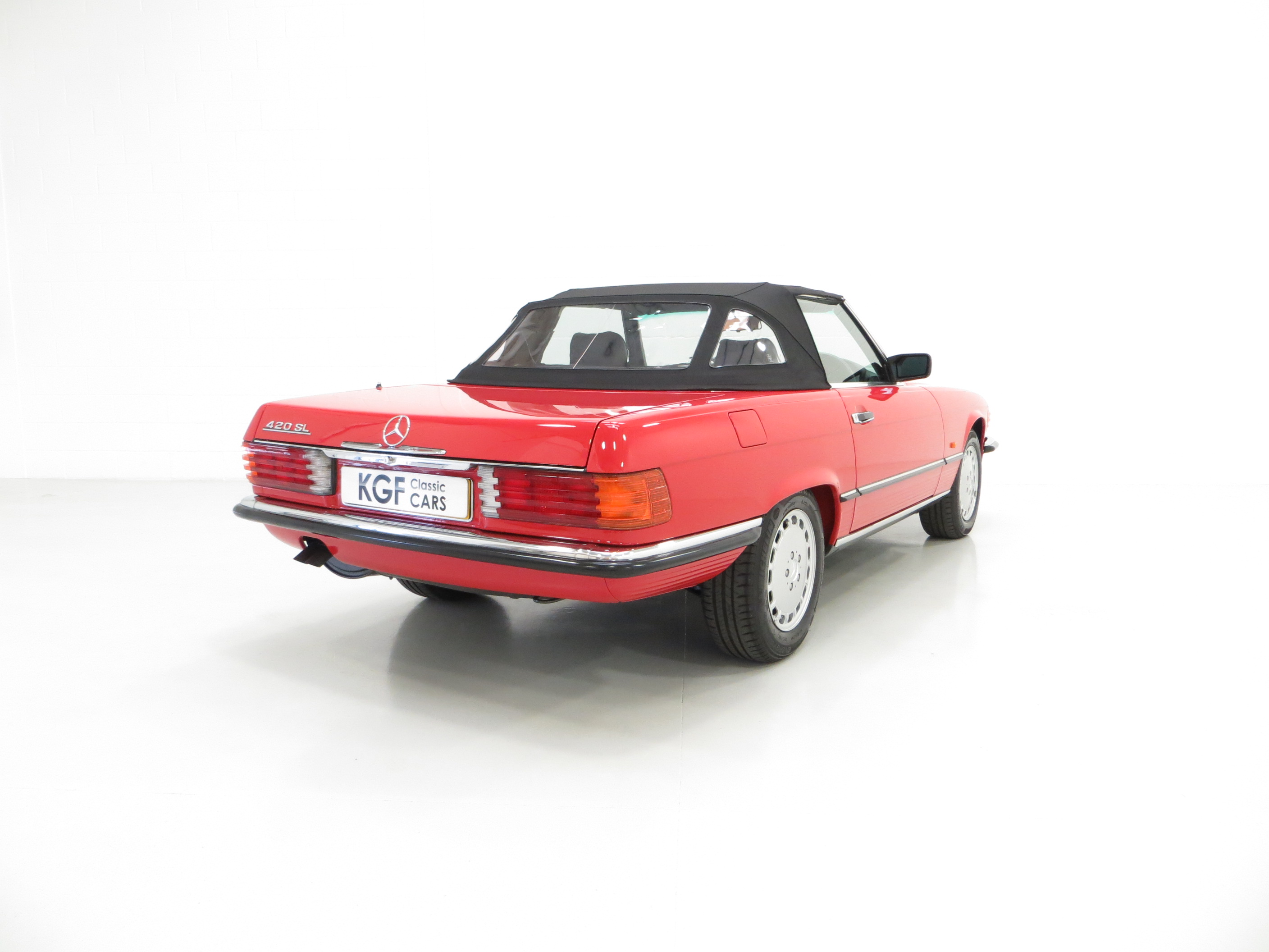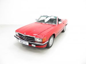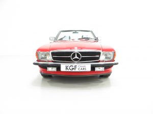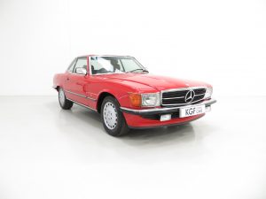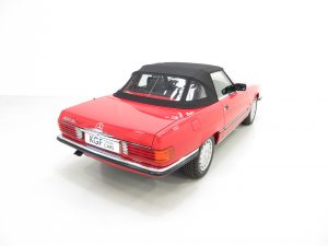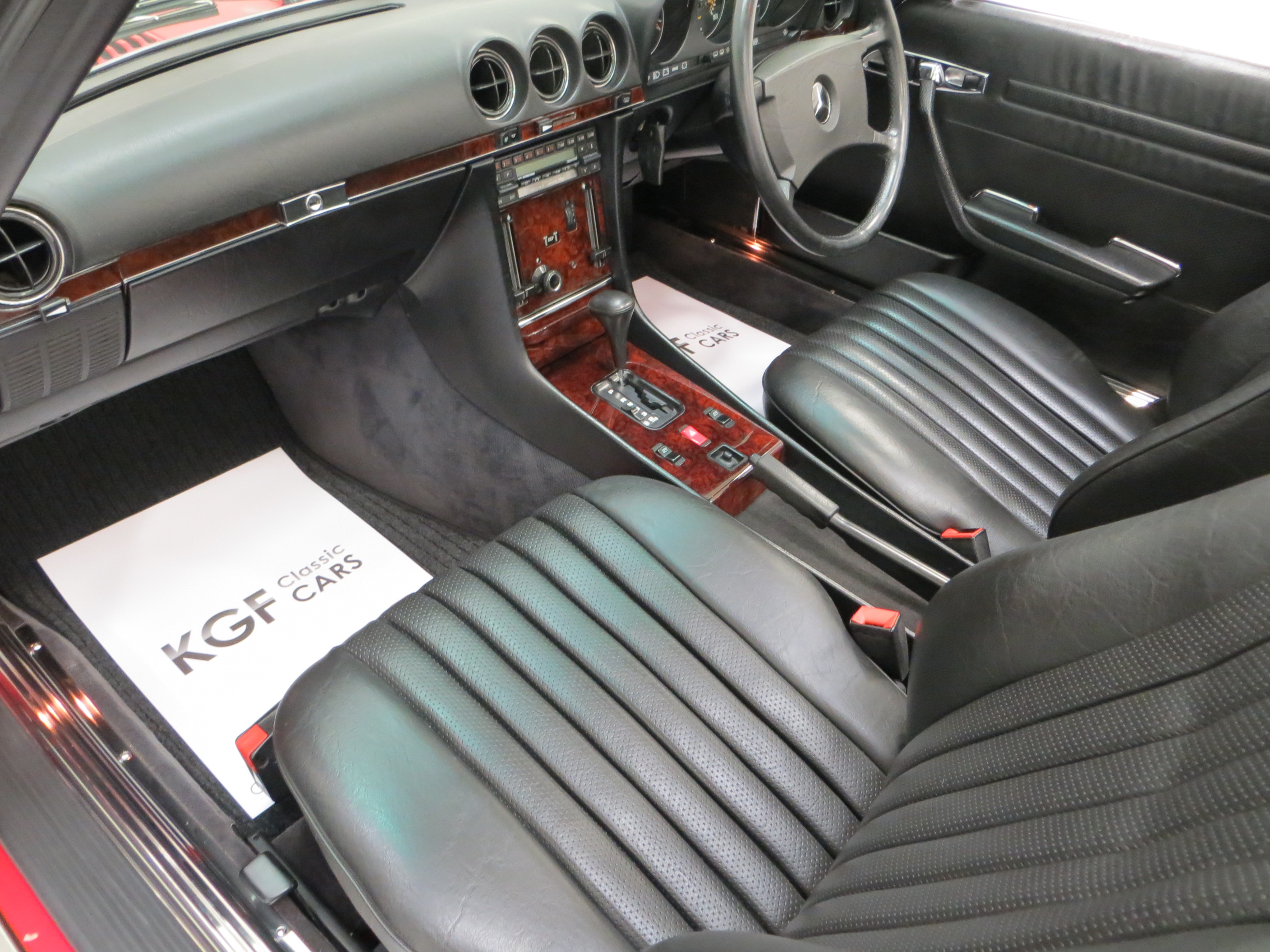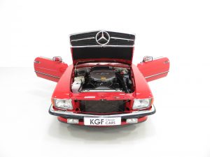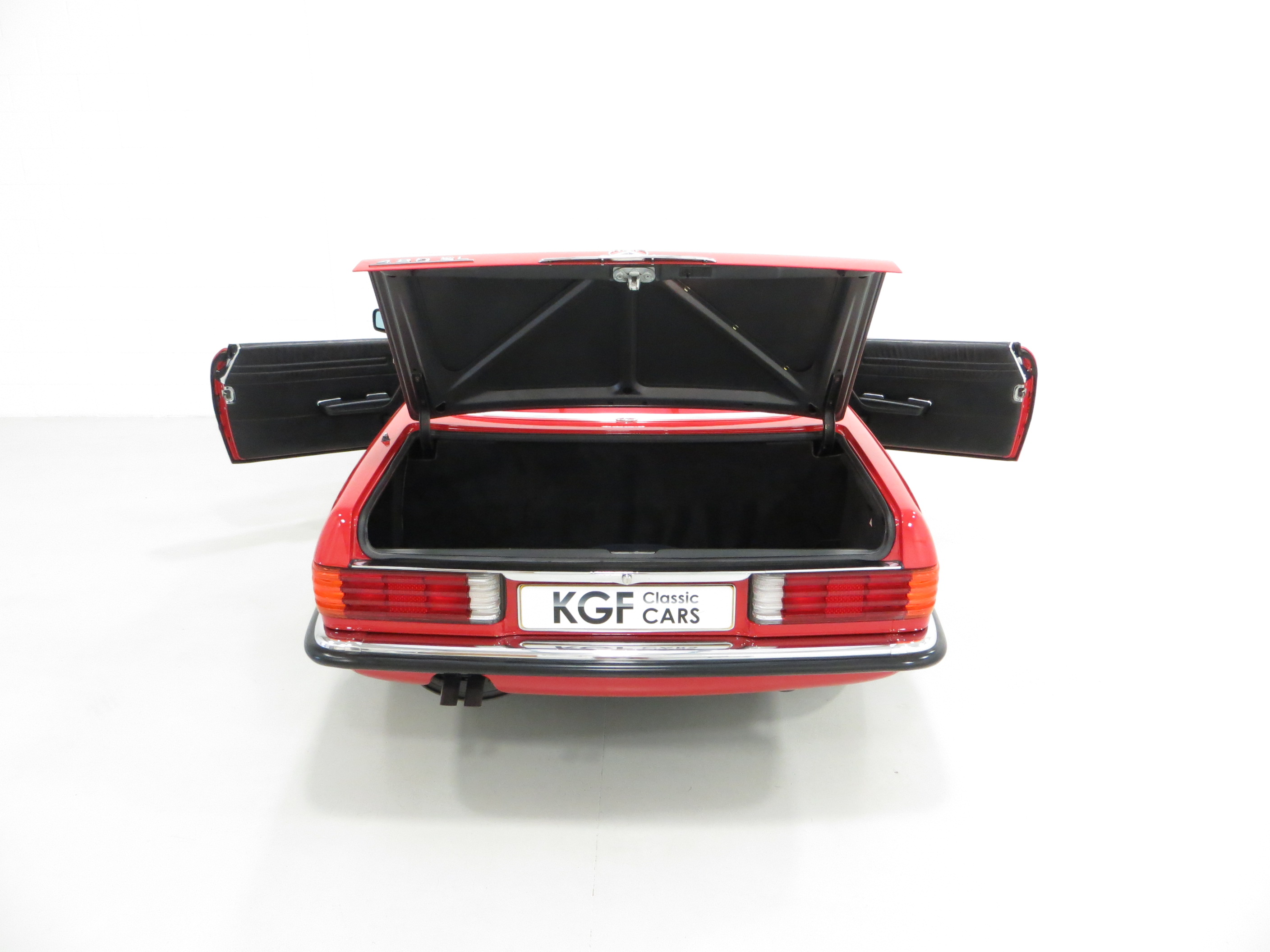 The product of a healthy obsession by the previous owner of over ten years, whose aim was to source an excellent well maintained R107 420SL, and embark on creating a nationally recognised award winner. Finished in the original colour of Signal Red, (Code 568), the paint finish is worthy of its high-profile trophy winning credentials and is virtually flawless. All panels are pin straight with no damage whatsoever, and the underside and wheel apertures have also received concours treatment being fully detailed with every nut, bolt and clip not only polished to perfection but retaining Mercedes-Benz parts only. The factory fitted Black hood and side and rear hood windows are perfect, as is the original colour coded hard top. Created to successfully win the notoriously strict MB Club Concours d’Elegance, to the extent where the car was once marked down a point due to a rainwater droplet sat on the slam panel. It is difficult to convey just how outstanding this car is.