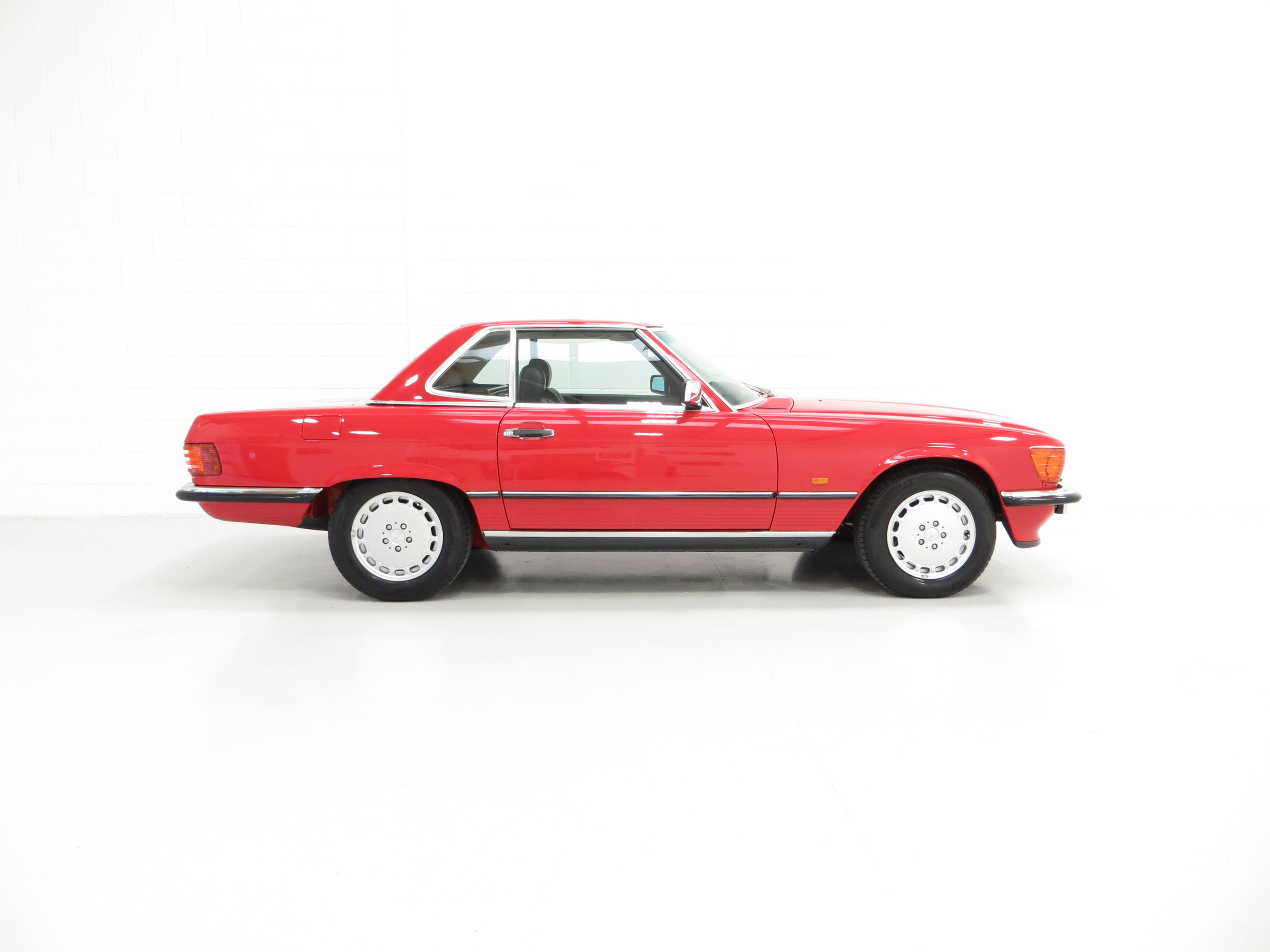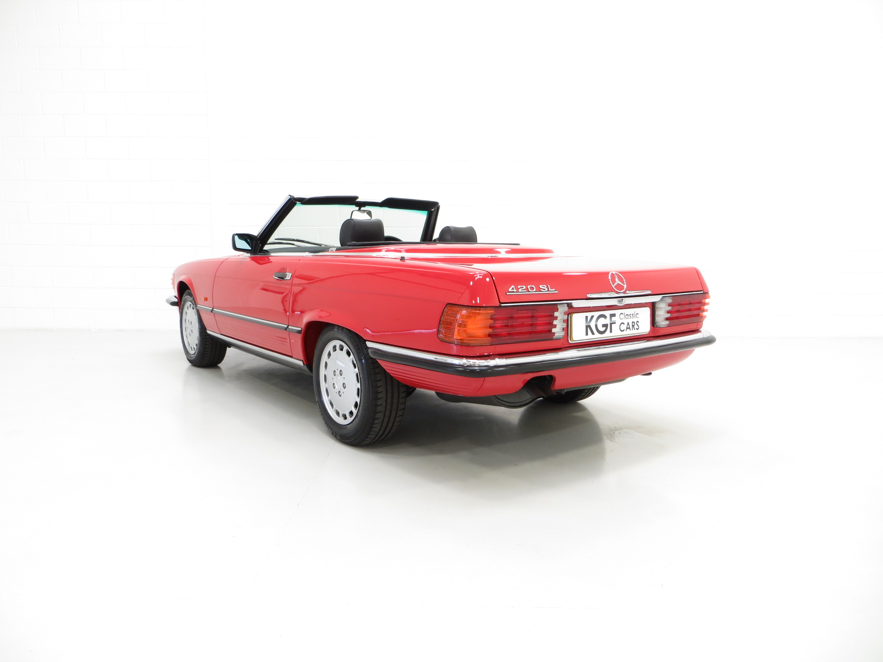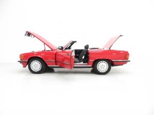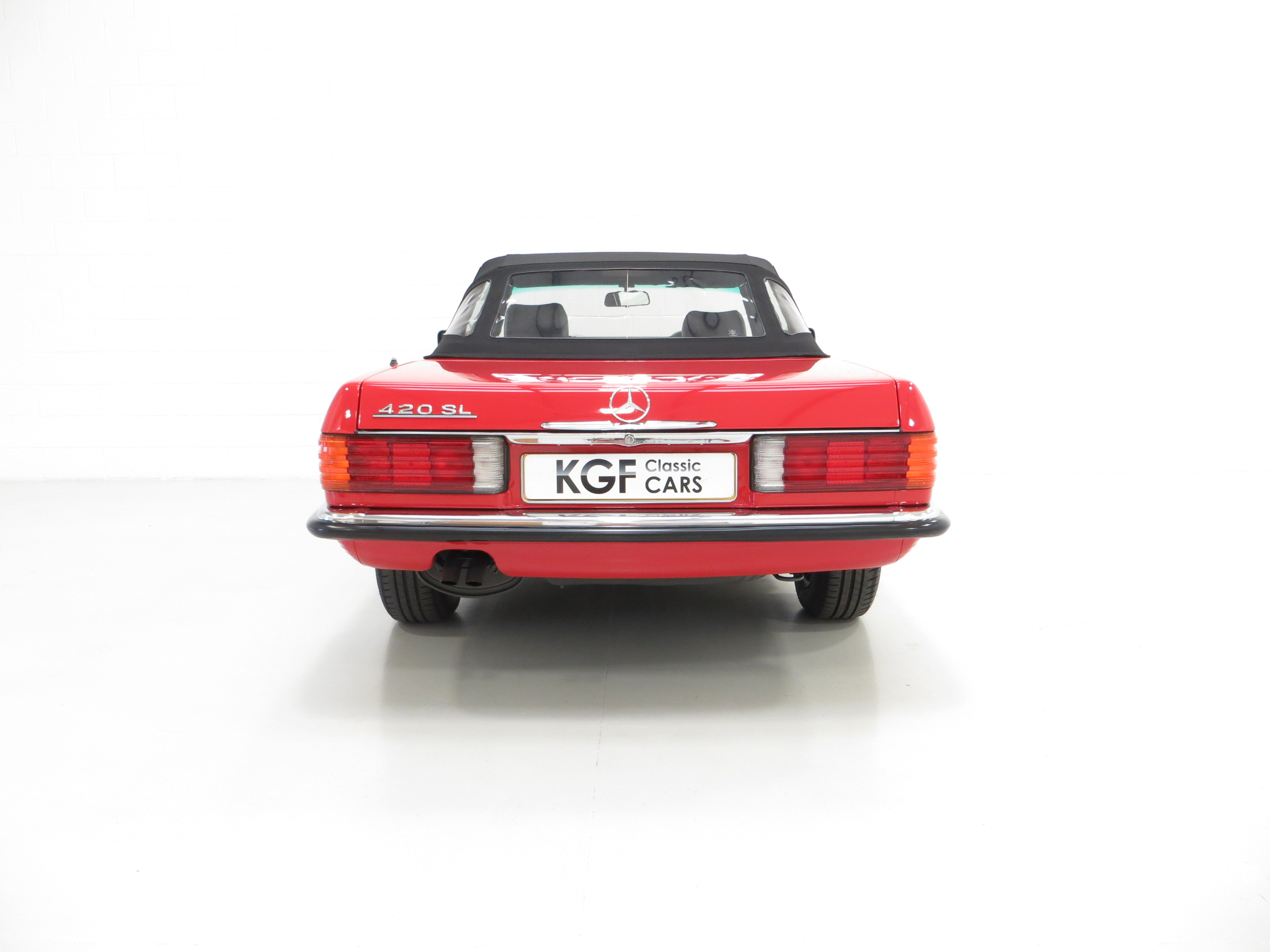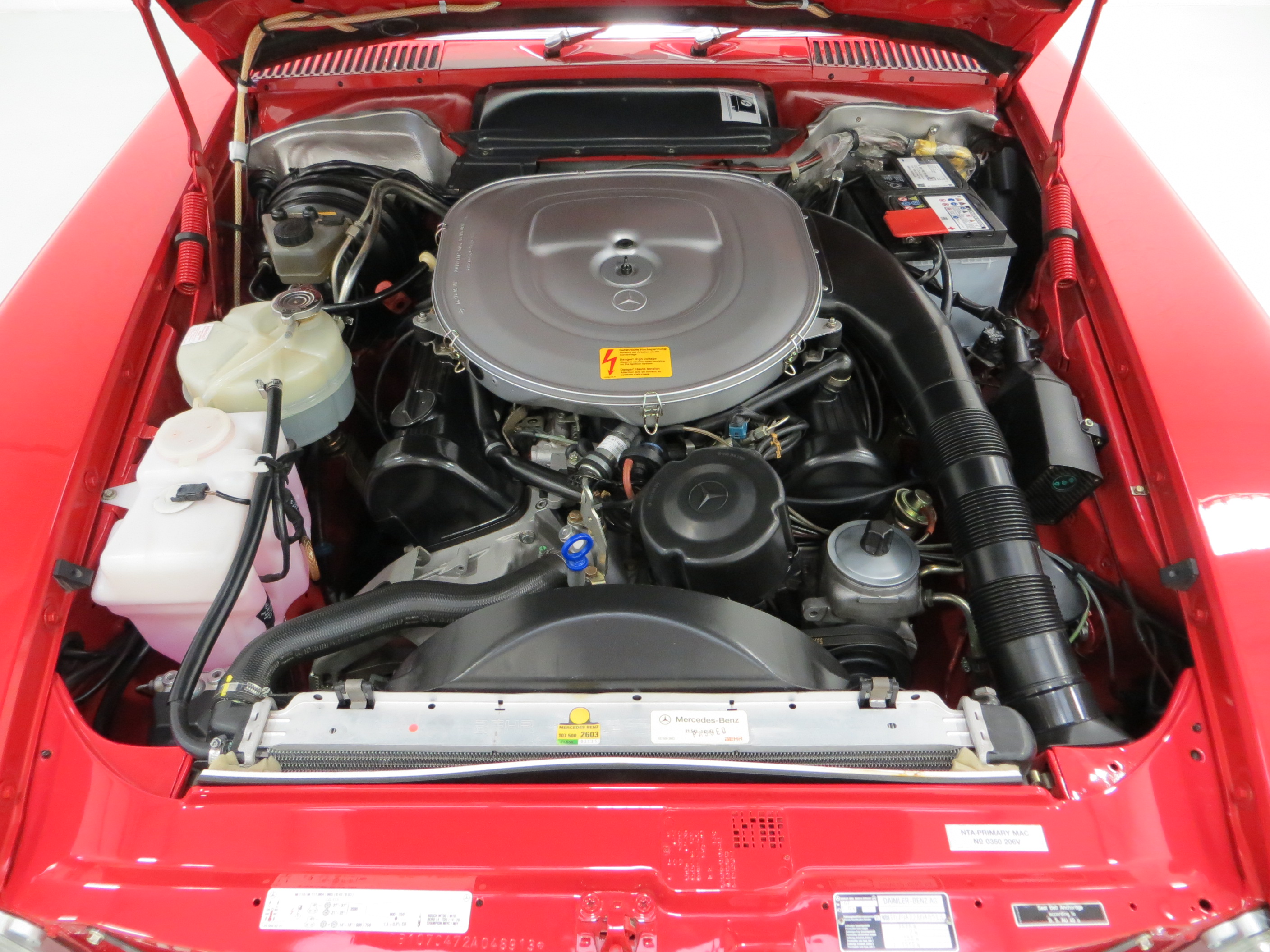 The product of a healthy obsession by the previous owner of over ten years, whose aim was to source an excellent well maintained R107 420SL, and embark on creating a nationally recognised award winner. Finished in the original colour of Signal Red, (Code 568), the paint finish is worthy of its high-profile trophy winning credentials and is virtually flawless. All panels are pin straight with no damage whatsoever, and the underside and wheel apertures have also received concours treatment being fully detailed with every nut, bolt and clip not only polished to perfection but retaining Mercedes-Benz parts only. The factory fitted Black hood and side and rear hood windows are perfect, as is the original colour coded hard top. Created to successfully win the notoriously strict MB Club Concours d’Elegance, to the extent where the car was once marked down a point due to a rainwater droplet sat on the slam panel. It is difficult to convey just how outstanding this car is.