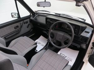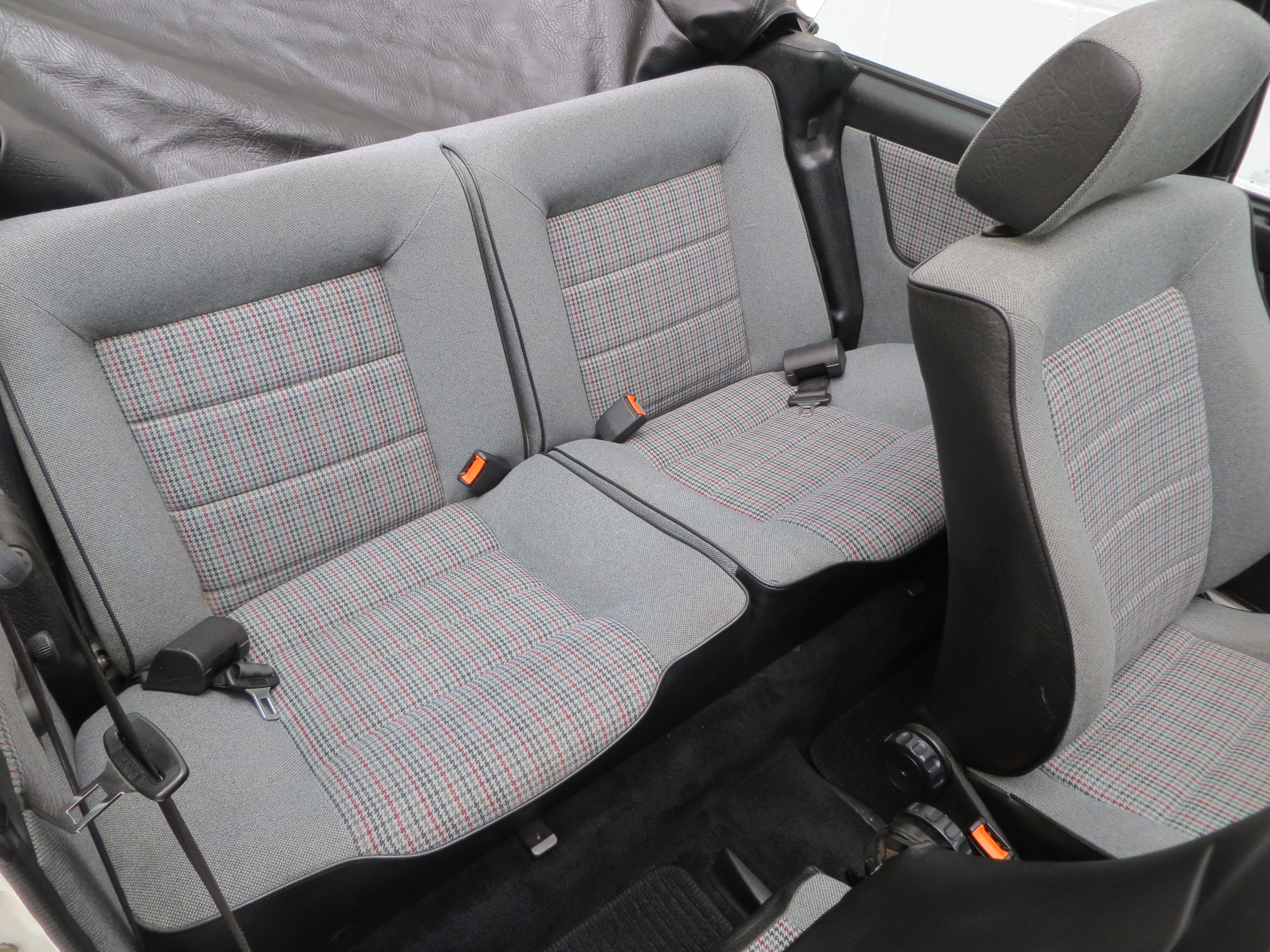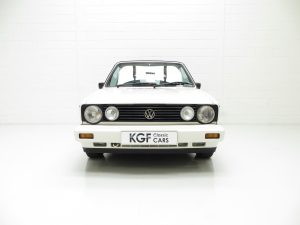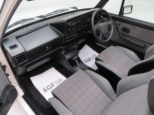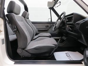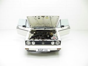 The interior of this Golf is in remarkable order with the sports seats finished in the Dove Grey (code CT) along with the matching unmarked cloth covered door and side panels. The seats are in beautiful wear free condition with only very mild discoloration to the light grey seat bolster on the driver’s side. The white headlining is fully intact and virtually mark free, and the carpets are still protected by the original VW over-mats. The original fascia and trim sections are perfect and all the controls work as they should, although the digital clock display has partially failed. The fully functional factory original digital stereo remains fitted. Representing everything that a low owner and low mileage pride and joy should. Wonderful.