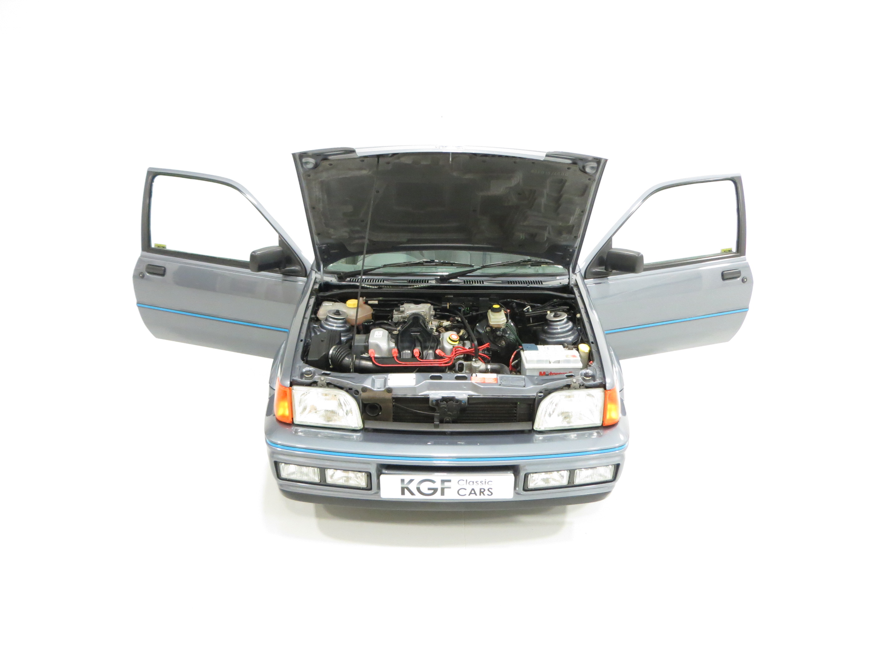 Finished in optional Ford Mercury Grey, (Code Q1), this fascinating example still retains its factory paint with an amazing deep gloss shine born from fastidious care, low mileage and presence on the concours scene. The factory panels are pin straight with uniform gaps and only very minor stone chips to the bonnet and a barely detectable ding to the front offside arch extension are worthy of mention. All the trim, rubbers, glass and lens covers are as new and the decals and blue insert remain in pristine condition. The engine bay still has all the Ford labels on the leads and Ford stamps on the hoses, and the underside is very clean. Reproduction dealer number plates, rear screen sticker and tax disc holder further demonstrate attention to detail. A unconditionally preserved example of this iconic hot hatch Ford.