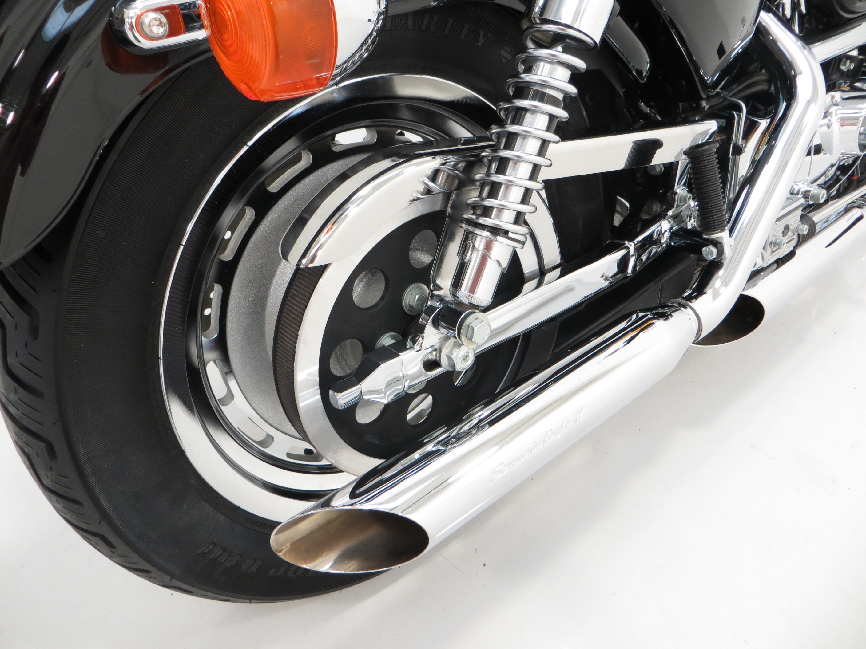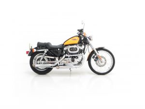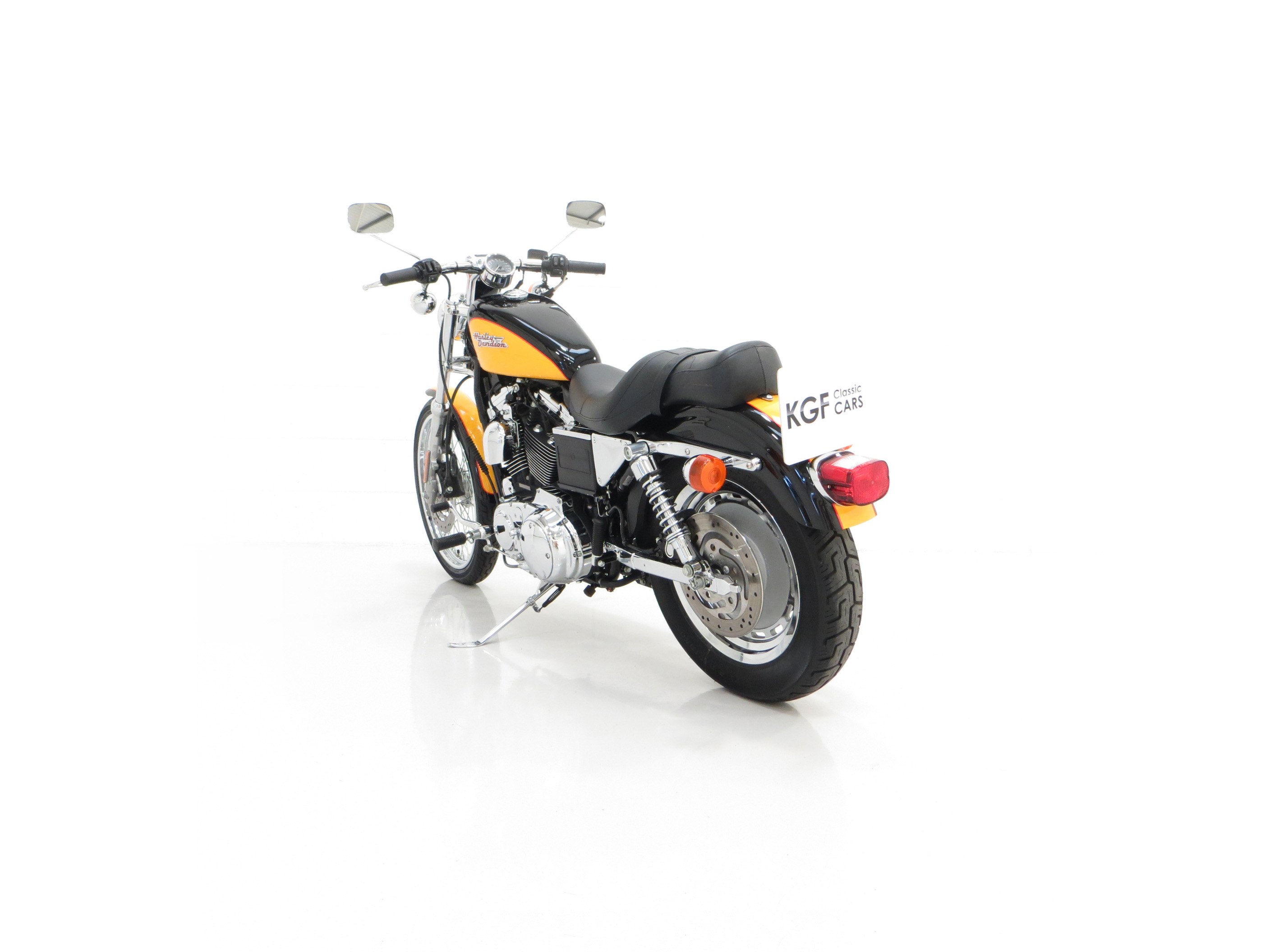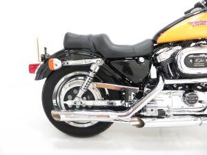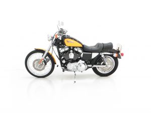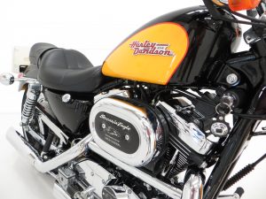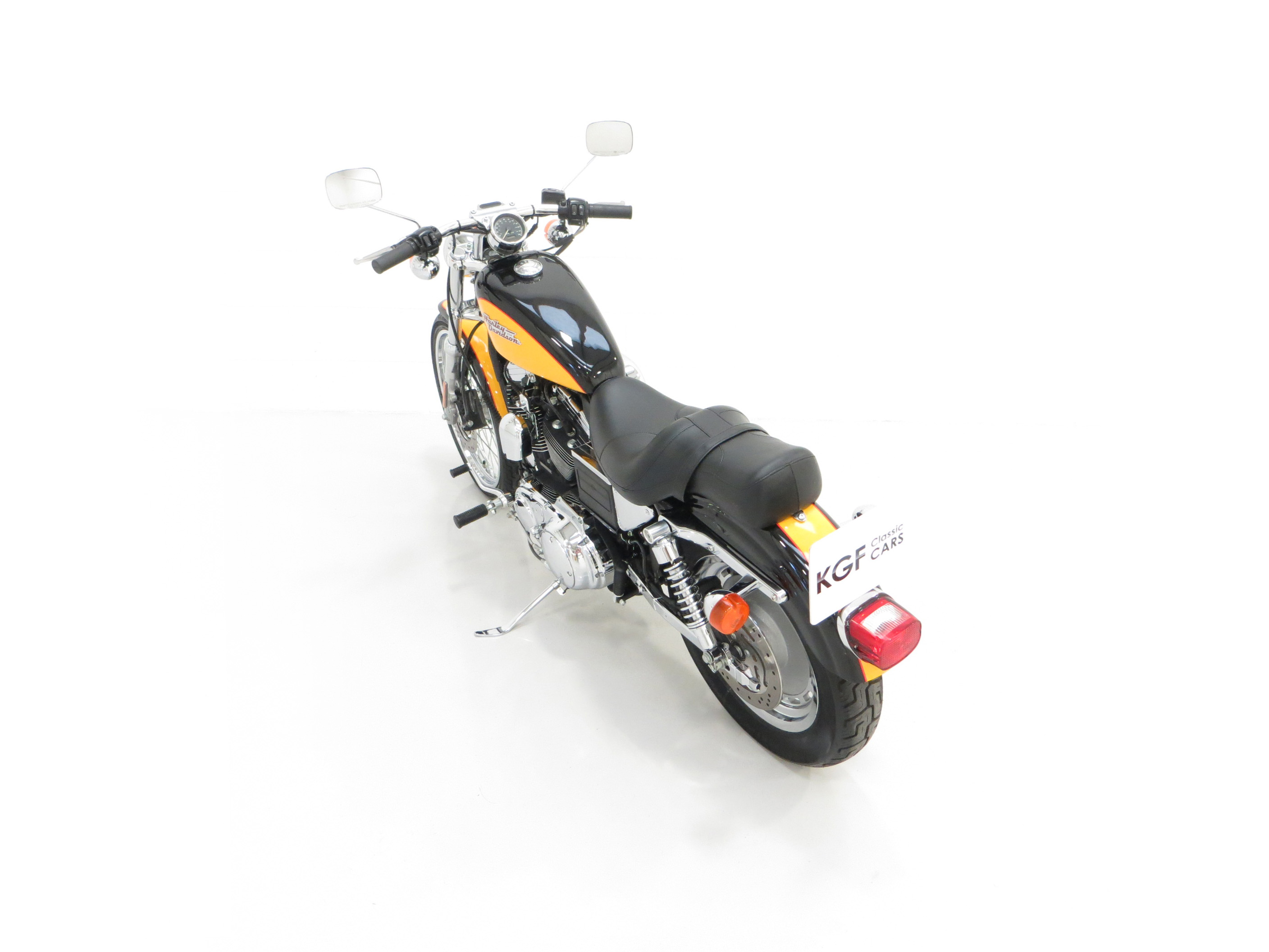 T21 x 2.15 TLA Laced front wheel, T16 x 3.00 DOT Disc rear wheel, carburettor enrichener knob, 12.5 litre fuel tank, electric start, run cut off switch, chrome-bezelled black-faced speedometer, chrome surround single headlamp, twin chromed rear-view mirrors, forward foot controls, pillion seat and foot pegs, front fork reflectors, chrome battery cover, chrome horn cover, fork lock, chrome jiffy stand. Harley Davidson genuine Sportster accessories; Chrome plated swingarm for Sportster, Sportster chrome belt guard, chrome exhaust bracket kit, chrome Pyramid axle adjuster. Screamin’ Eagle Sportster accessories; Screamin’ Eagle II slip-fit mufflers – Baloney Cut, Sportster high-flow air cleaner kit, black oval air cleaner insert, black timer cover with logo.