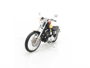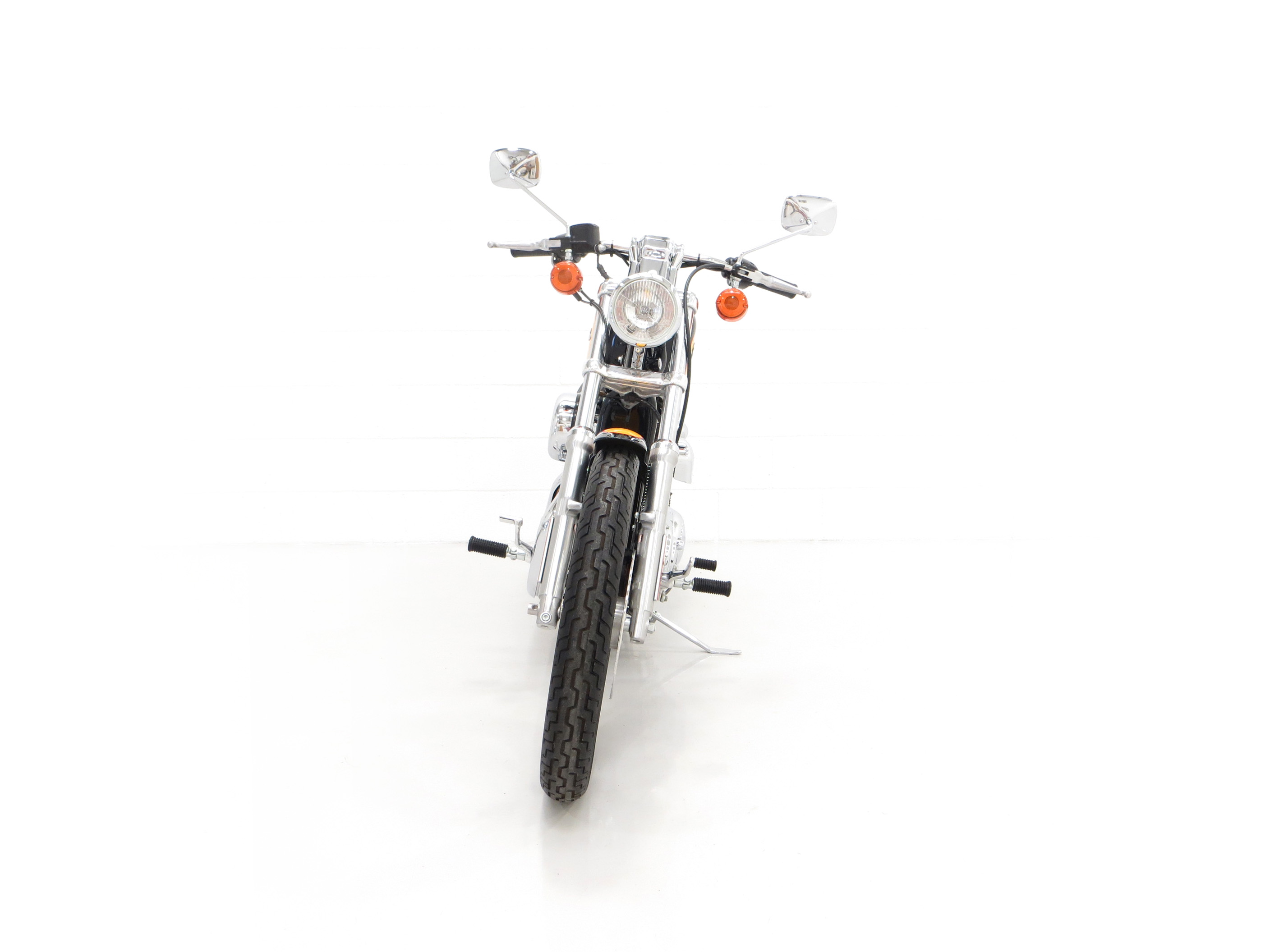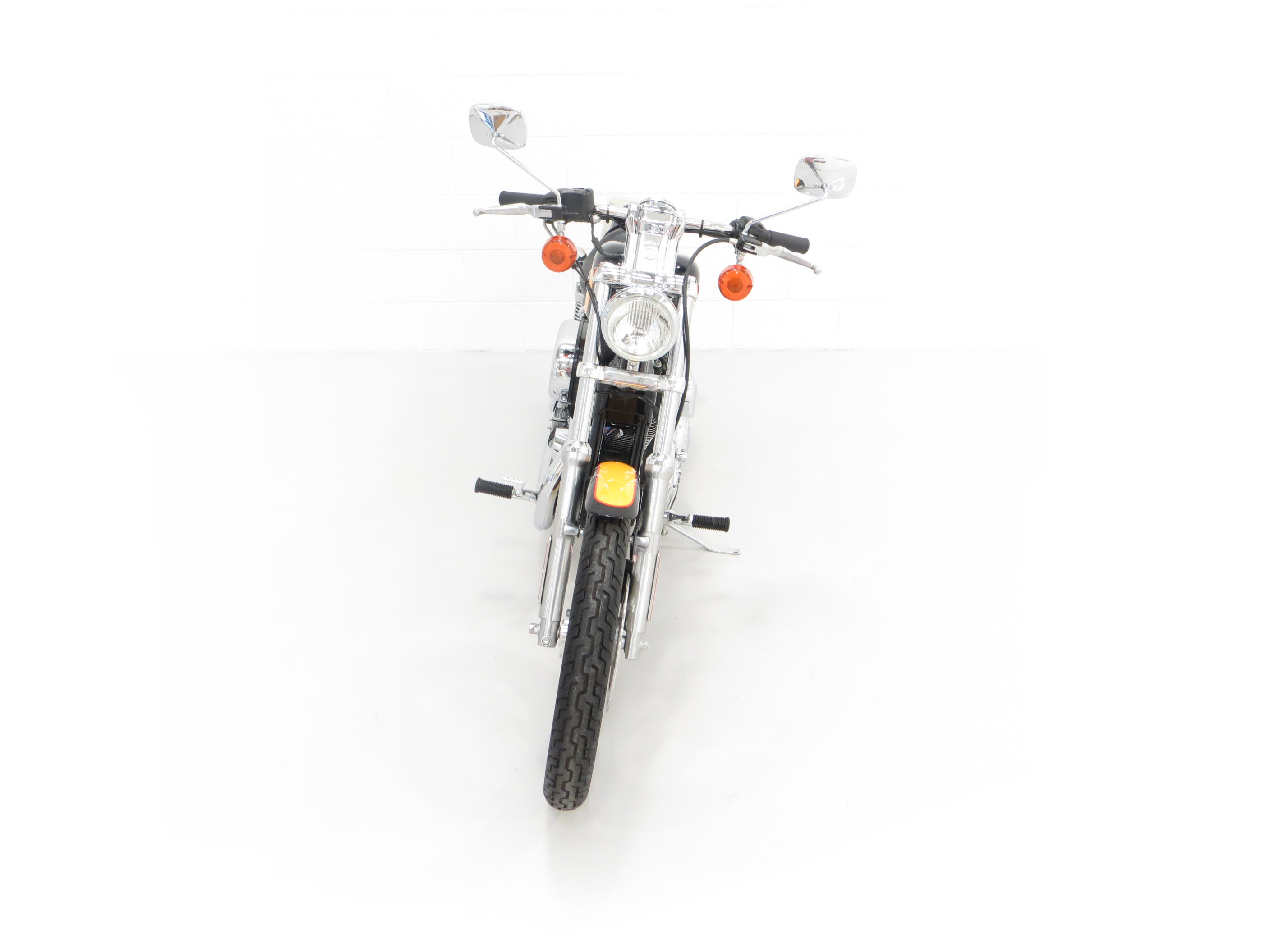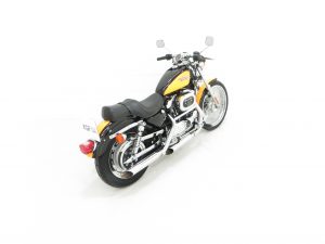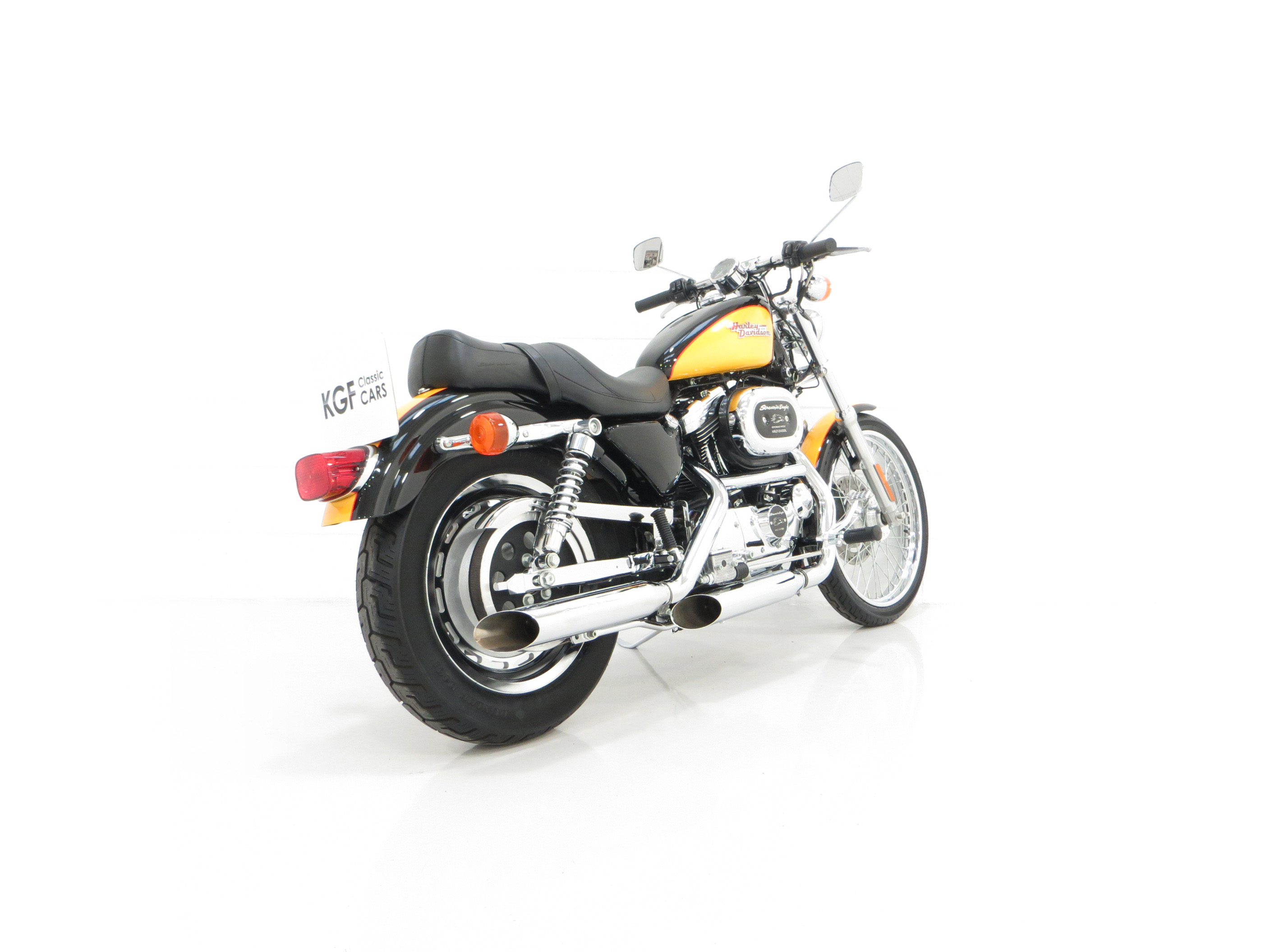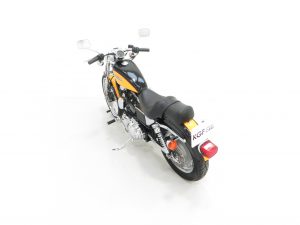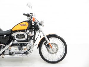 T21 x 2.15 TLA Laced front wheel, T16 x 3.00 DOT Disc rear wheel, carburettor enrichener knob, 12.5 litre fuel tank, electric start, run cut off switch, chrome-bezelled black-faced speedometer, chrome surround single headlamp, twin chromed rear-view mirrors, forward foot controls, pillion seat and foot pegs, front fork reflectors, chrome battery cover, chrome horn cover, fork lock, chrome jiffy stand. Harley Davidson genuine Sportster accessories; Chrome plated swingarm for Sportster, Sportster chrome belt guard, chrome exhaust bracket kit, chrome Pyramid axle adjuster. Screamin’ Eagle Sportster accessories; Screamin’ Eagle II slip-fit mufflers – Baloney Cut, Sportster high-flow air cleaner kit, black oval air cleaner insert, black timer cover with logo.