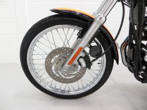 The ornate Laced front wheel and DOT Disc rear wheel are unmarked with a gorgeous bright and original finish. The factory fitted premium brand Dunlop Harley Davidson D402F MH/90-21 front and D401 130/90 B16 rear tyres have masses of tread remaining. Disc brakes of size 292mm front and rear with two-piston callipers take care of stopping superbly.