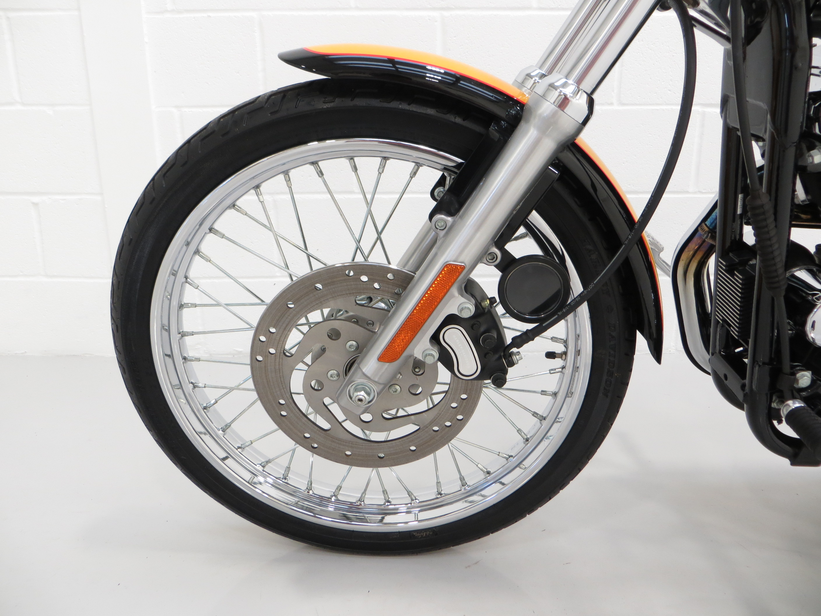 At the heart of the machine lays the trusted 1199cc OHC V Evolution engine with electric start and stock carburettor enrichener knob. Engine torque figures are quoted as 87Nm at 3000rpm but a genuine Screamin Eagle high-flow air cleaner kit will see an improvement to this. As you would expect from such a low mileage and cosseted machine, the engine is a piece of ornamental beauty, proudly on display with masses of highly polished chrome, a detailer’s paradise! Firing instantly on the electric start, the bike performs perfectly and has just been to a Harley Davidson main dealer for a service. The transmission with constant mesh works through each of the five gears effortlessly. Exhilarating Baloney cut Screamin’ Eagle II slip-fit mufflers were specified when the bike was new with the factory original mufflers kept should the next owner wish to revert back to stock and a slightly quieter experience!