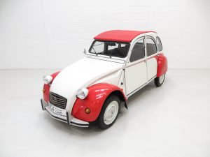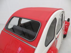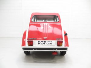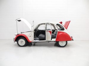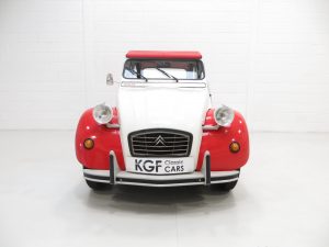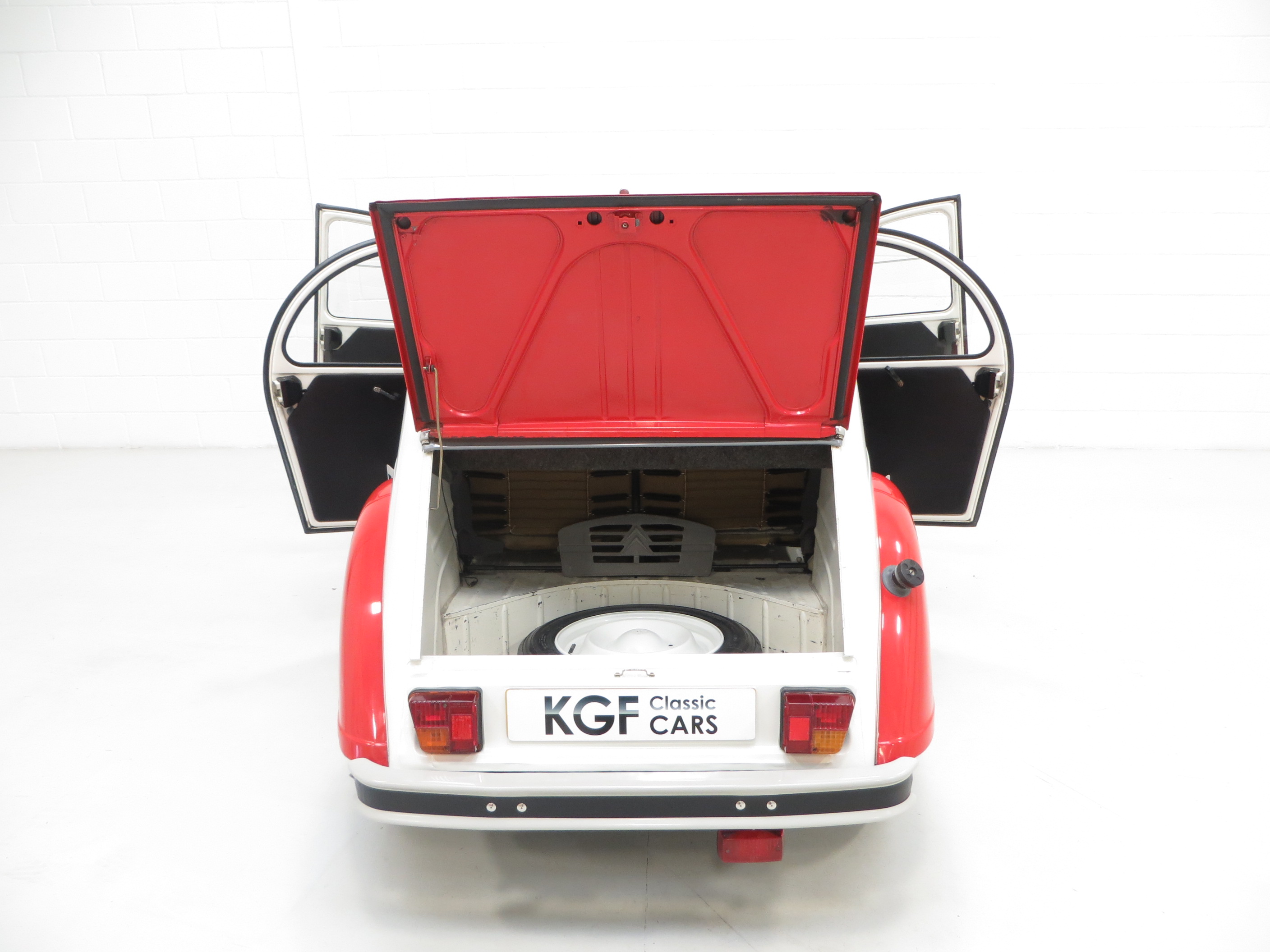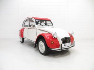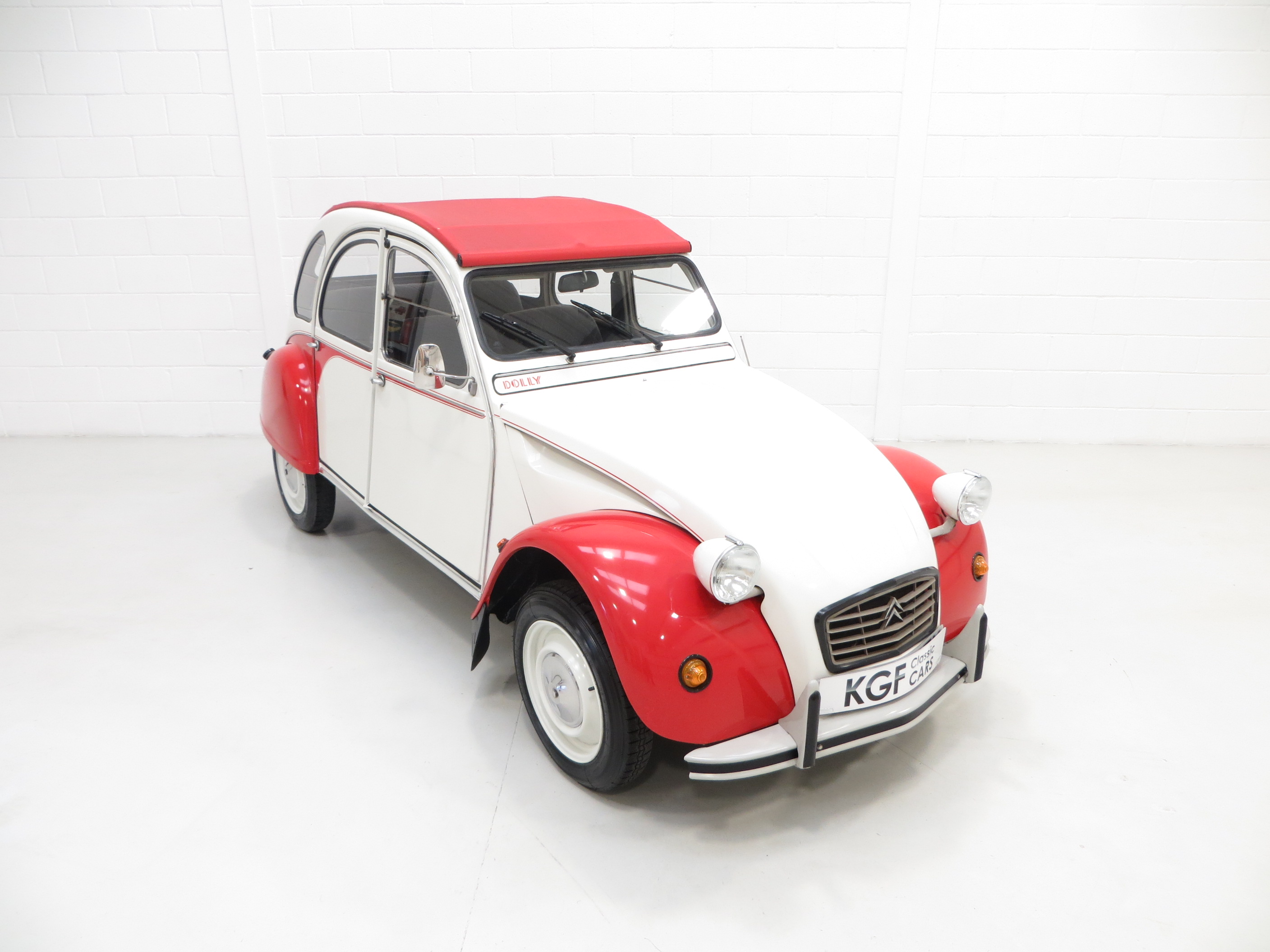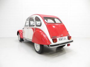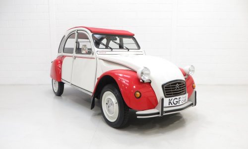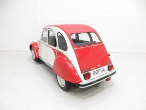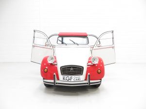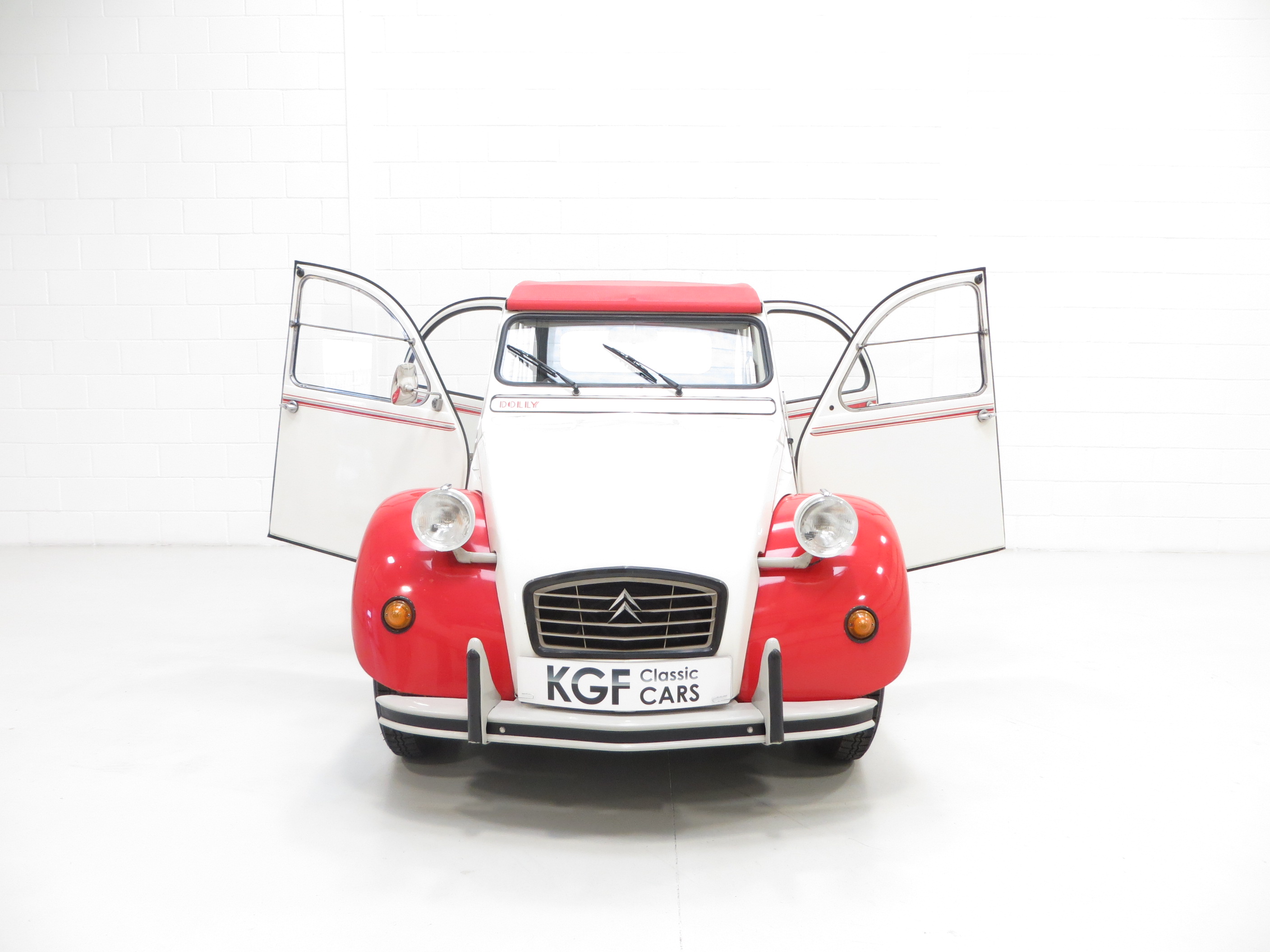 This wonderful 2CV6 Special is the characterful and desirable ‘Dolly’ edition, finished in the original colour combination unique to the Dolly model of Rouge Vallelunga/Blanc Meije, (Code EKB/EWT). With a vibrant red shine to contrast the bright white, this unspoilt example even wears the supplying Citroen Main Dealer number plates. Minor age-related markings and shallow undulations to the lightweight bonnet and lower rear wheel arches can be seen, but certainly do not spoil the car. All the correct Dolly decals and badges are present and the glass is window etched with the original factory fit items. Even the winter muff grille is present, designed to restrict air flow in colder temperatures to help the engine warm up! The cloth backed vinyl hood is finished in matching colour scheme and remains in excellent condition. An irresistible peculiar classic!