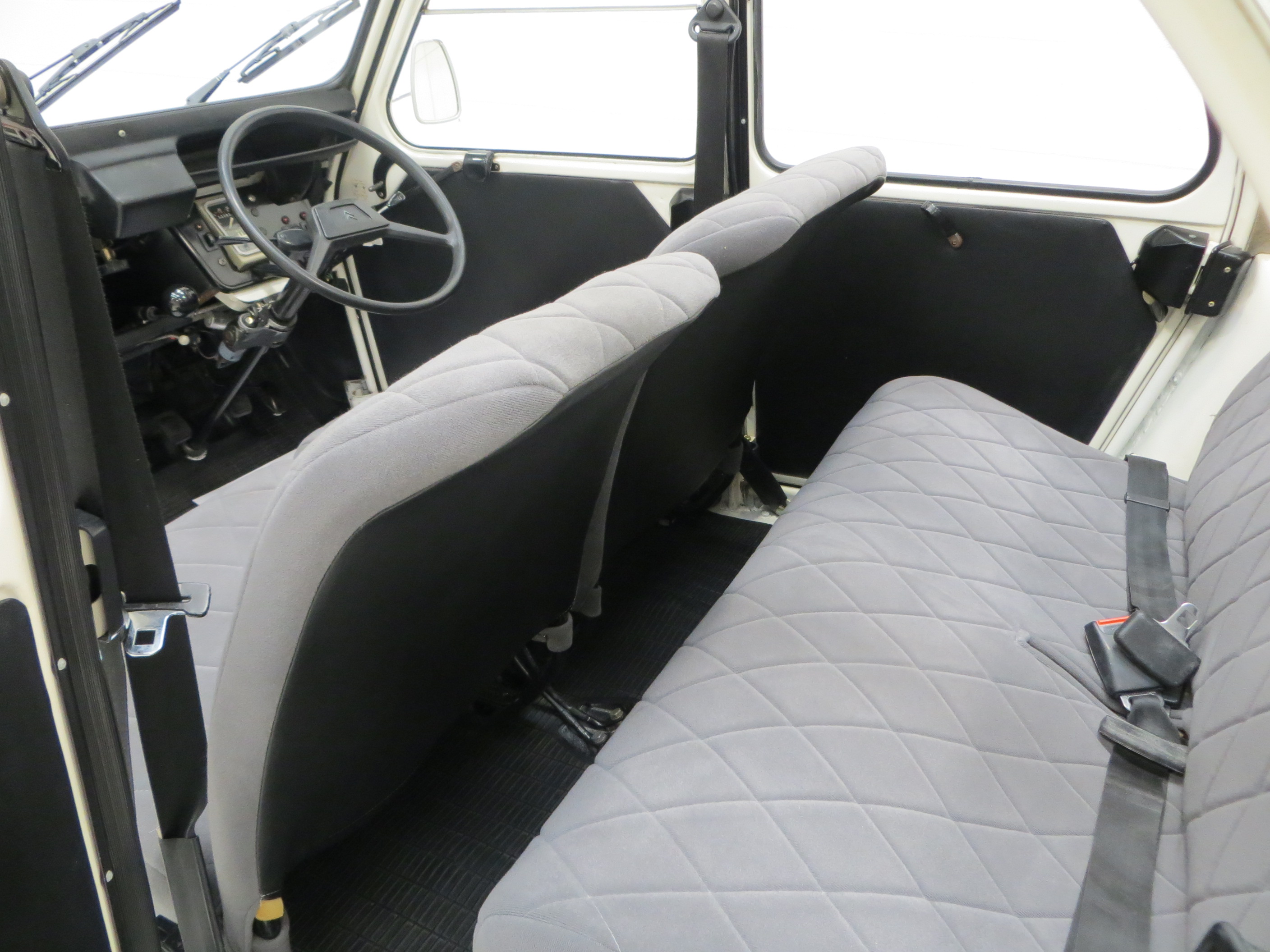 Headlamp adjustment control knob, check-button for brake level warning lamp, hazard warning switch, ashtray, windscreen/floor air distribution control, rear fog lamp, choke control with warning lamp, oil pressure warning lamp, battery charge indicator, folding rear bench seat, complete and half opening hood, interior lamp. Dealer accessories; Rear seat belts.