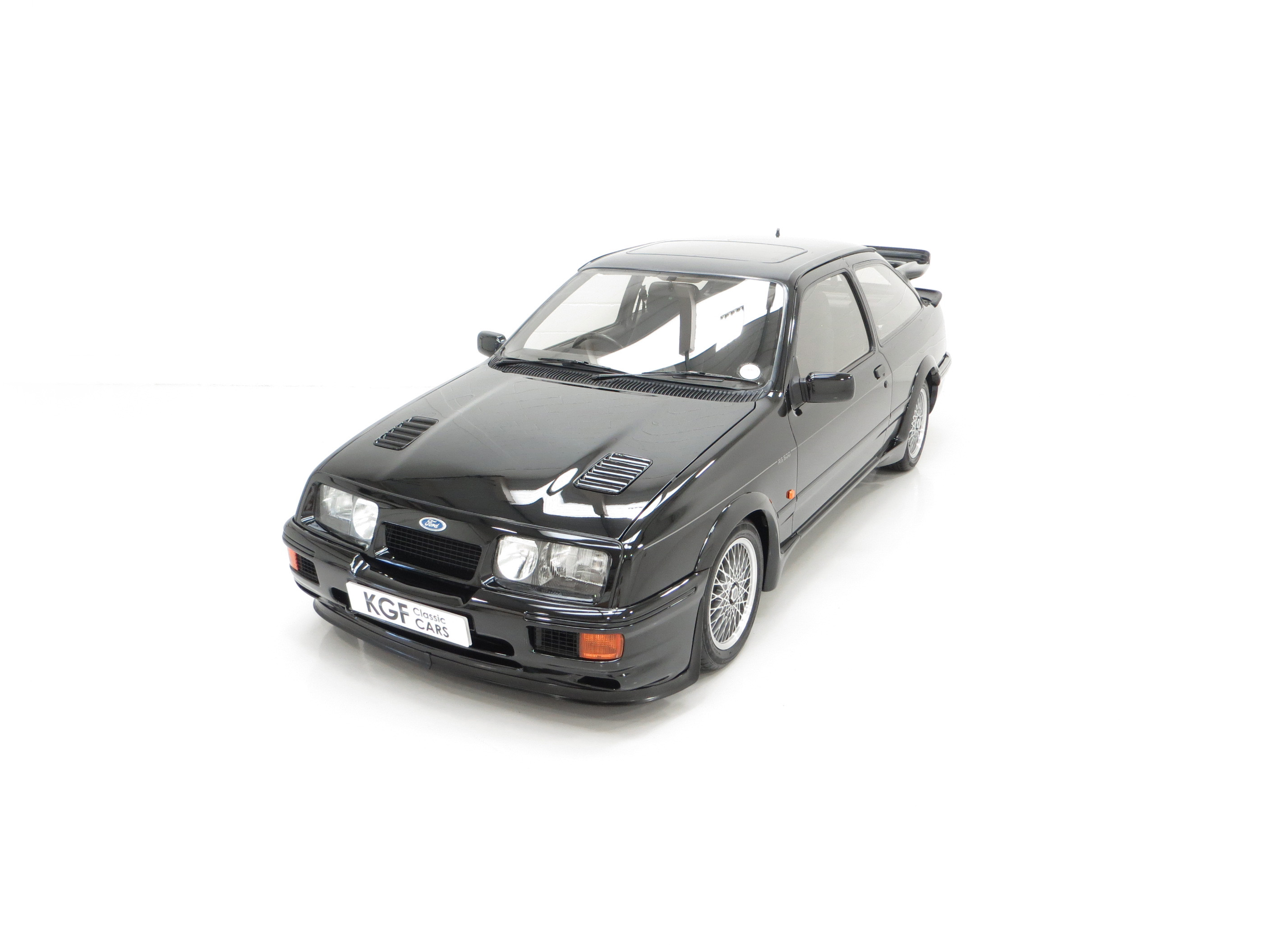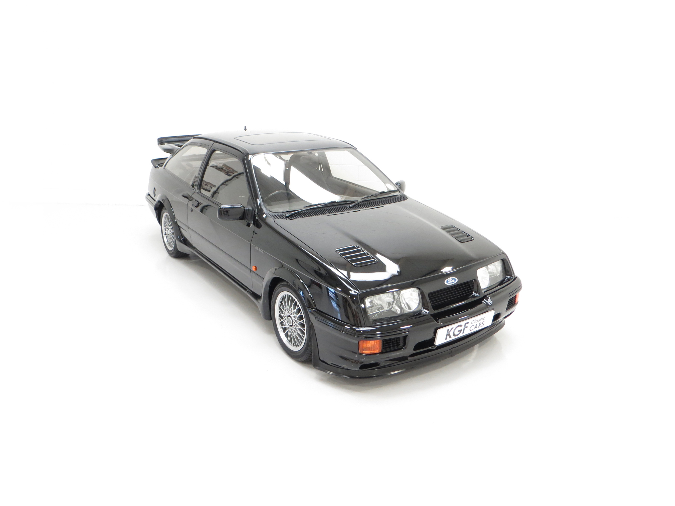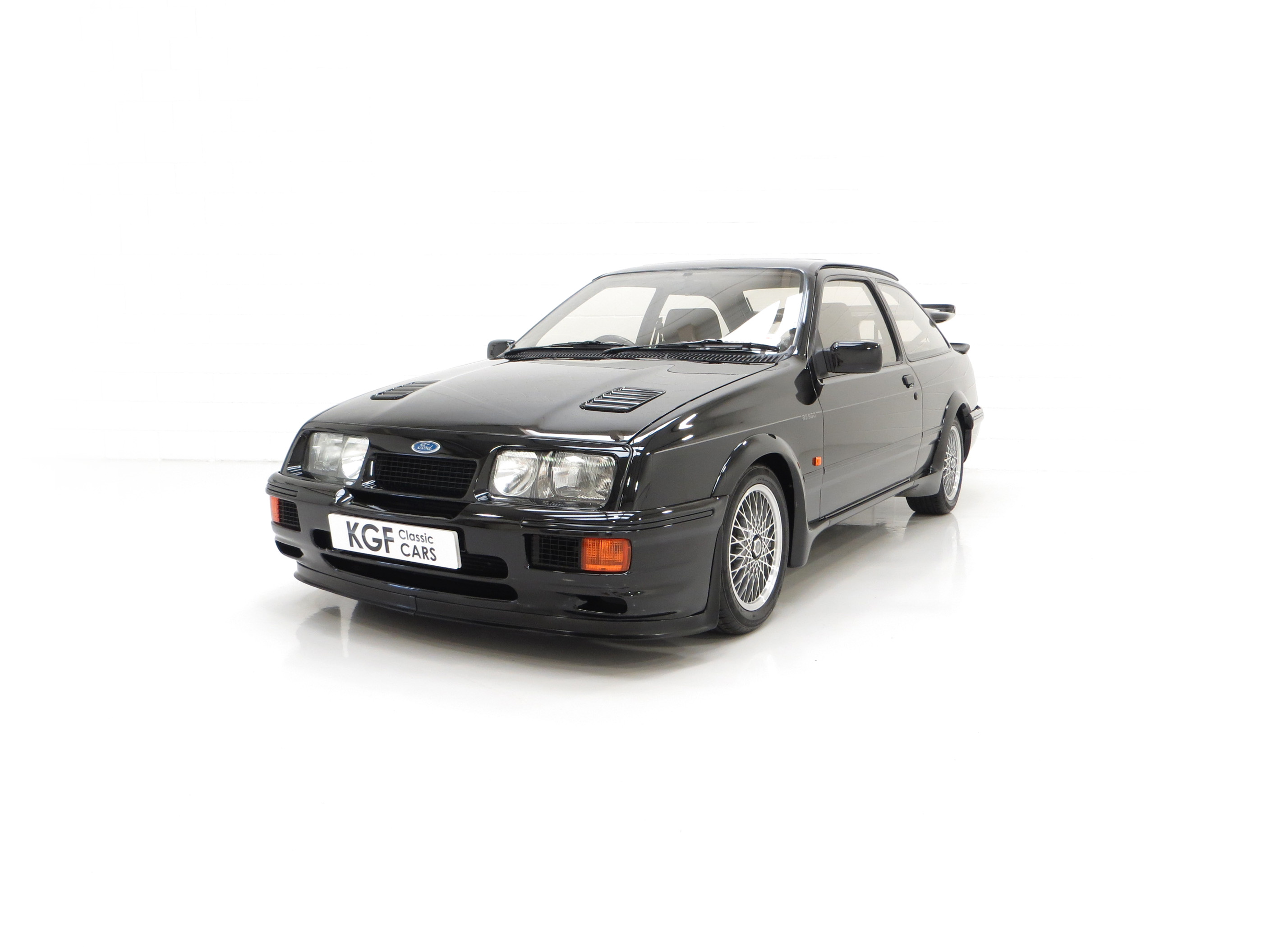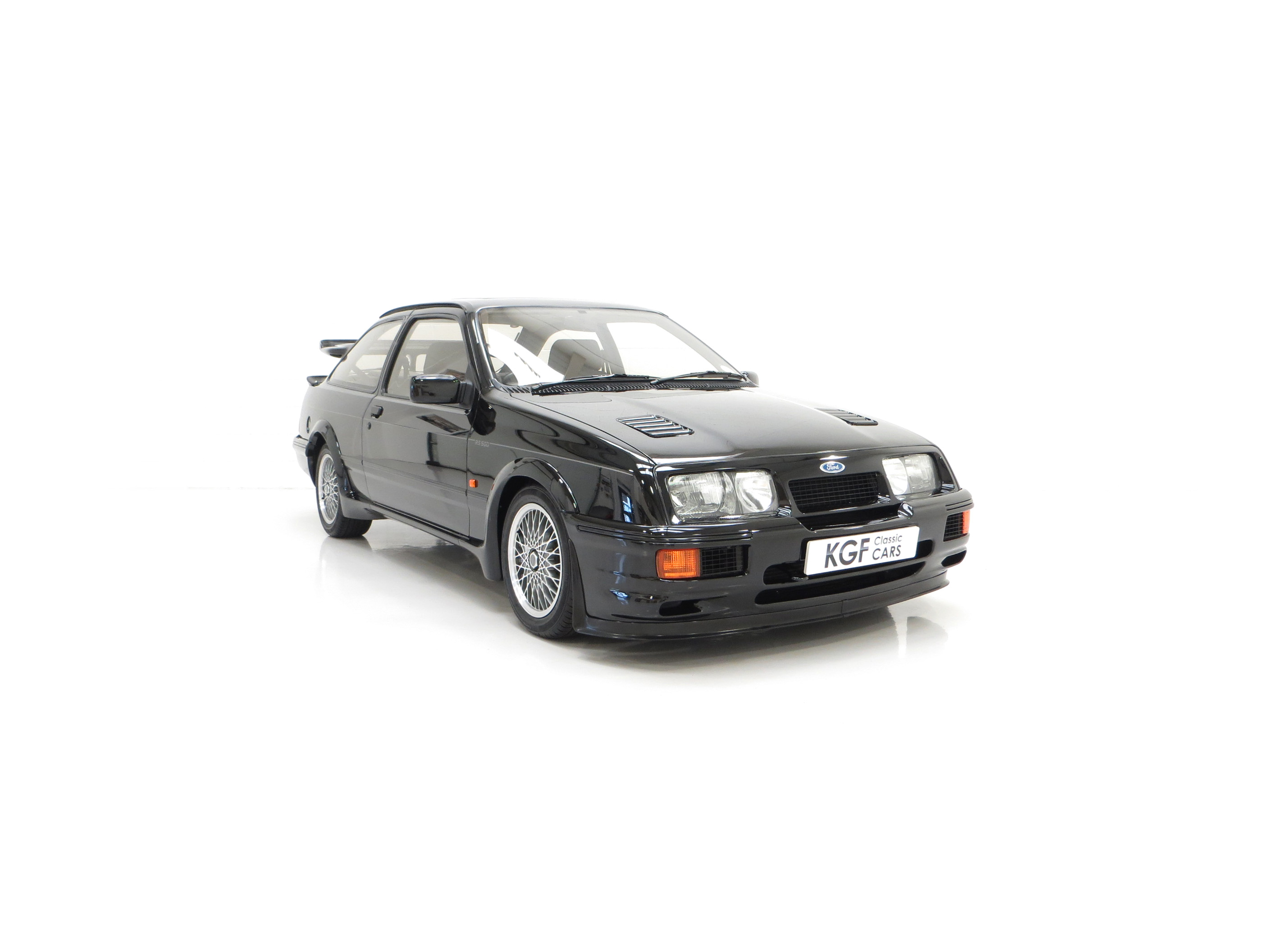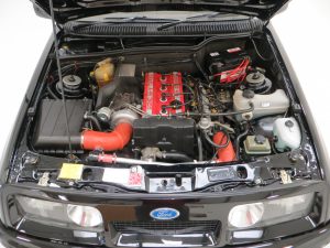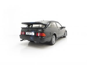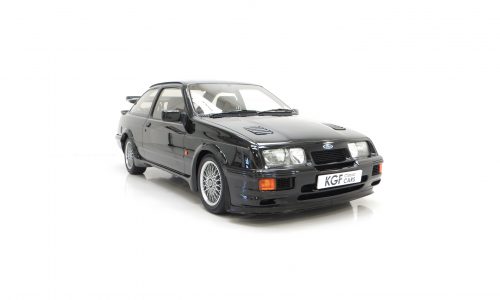 Five hundred extra special examples of the 150 mph Ford Sierra RS Cosworth went on sale in Britain on August 1st 1987. This more powerful ‘evolution’ model was introduced to allow Ford to develop the original limited production run of 5,000 needed to allow the car to be homologated for International Touring Car Racing in Group A. Aston Martin at Tickford were assigned with converting the 500 cars and in addition to the more powerful 224bhp YBD engine, (with the potential to exceed 400bhp in race trim), numerous aerodynamic features were incorporated in the bodywork. These include a 30mm lip spoiler applied directly to the rear edge of the tailgate to increase rear downforce. New and larger cooling ducts were included in the design of the front bumper for the intercooler and the front brakes, as well as an aerodynamic splitter. Ford’s intention was for every RS500 to be finished in Black but limited stock of the regular Cosworths resulted in 56 Diamond White and 52 Moonstone Blue being converted. The vehicle was only available through 90 specialist Ford RS (Rally-Sport) dealers in Britain at a cost of £19,950, a £4,000 premium over a standard RS Cosworth. (Source Ford News Release 87/76). This example is build number 140/500.