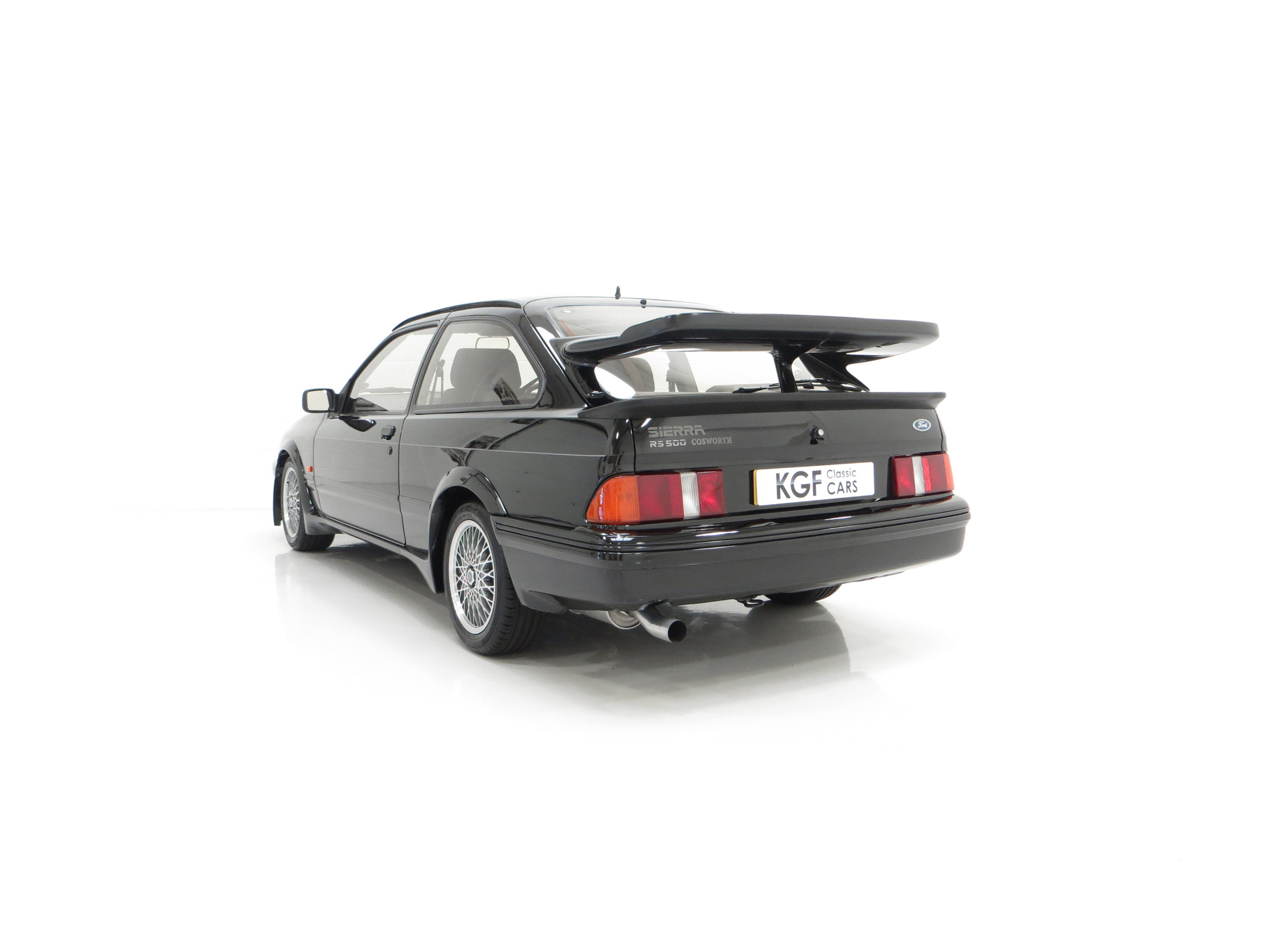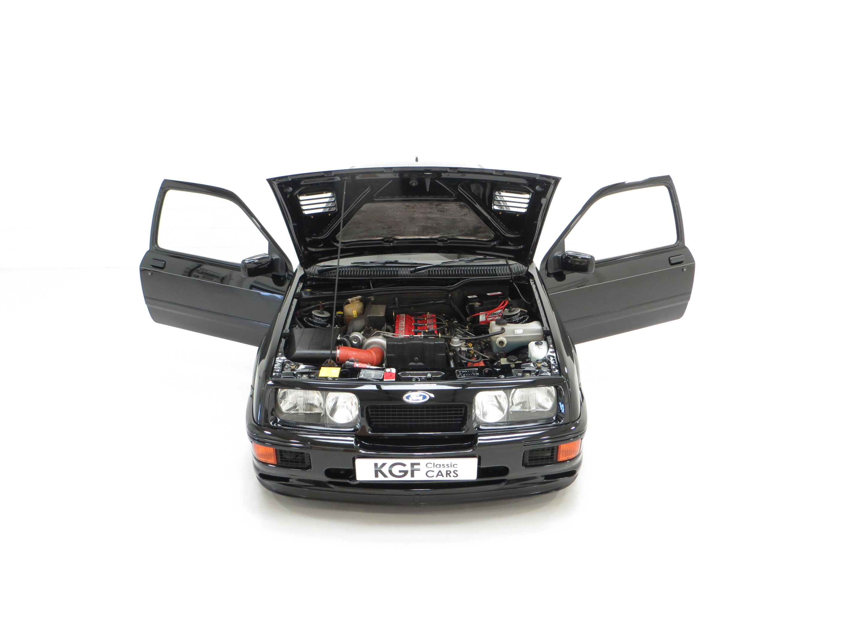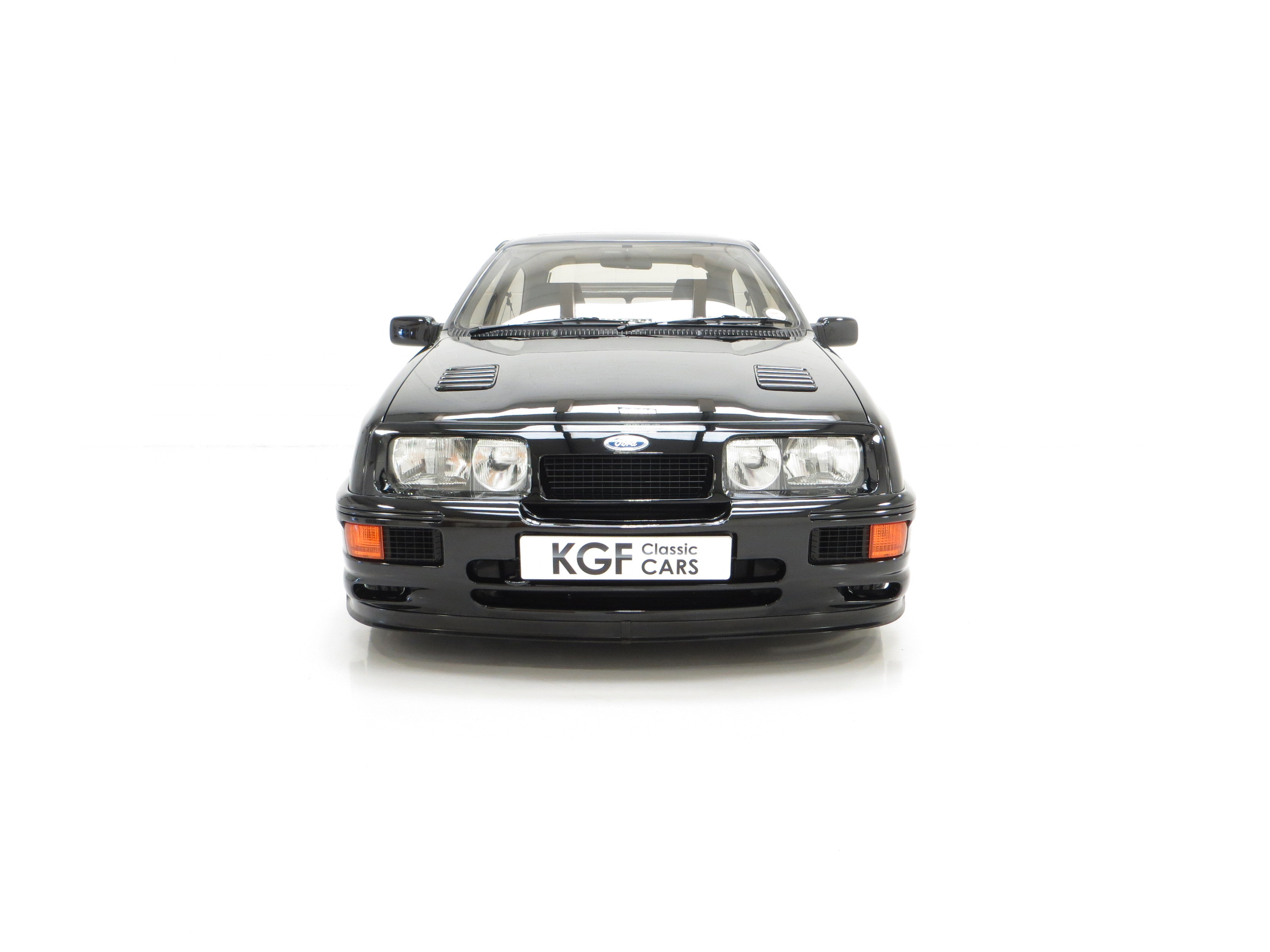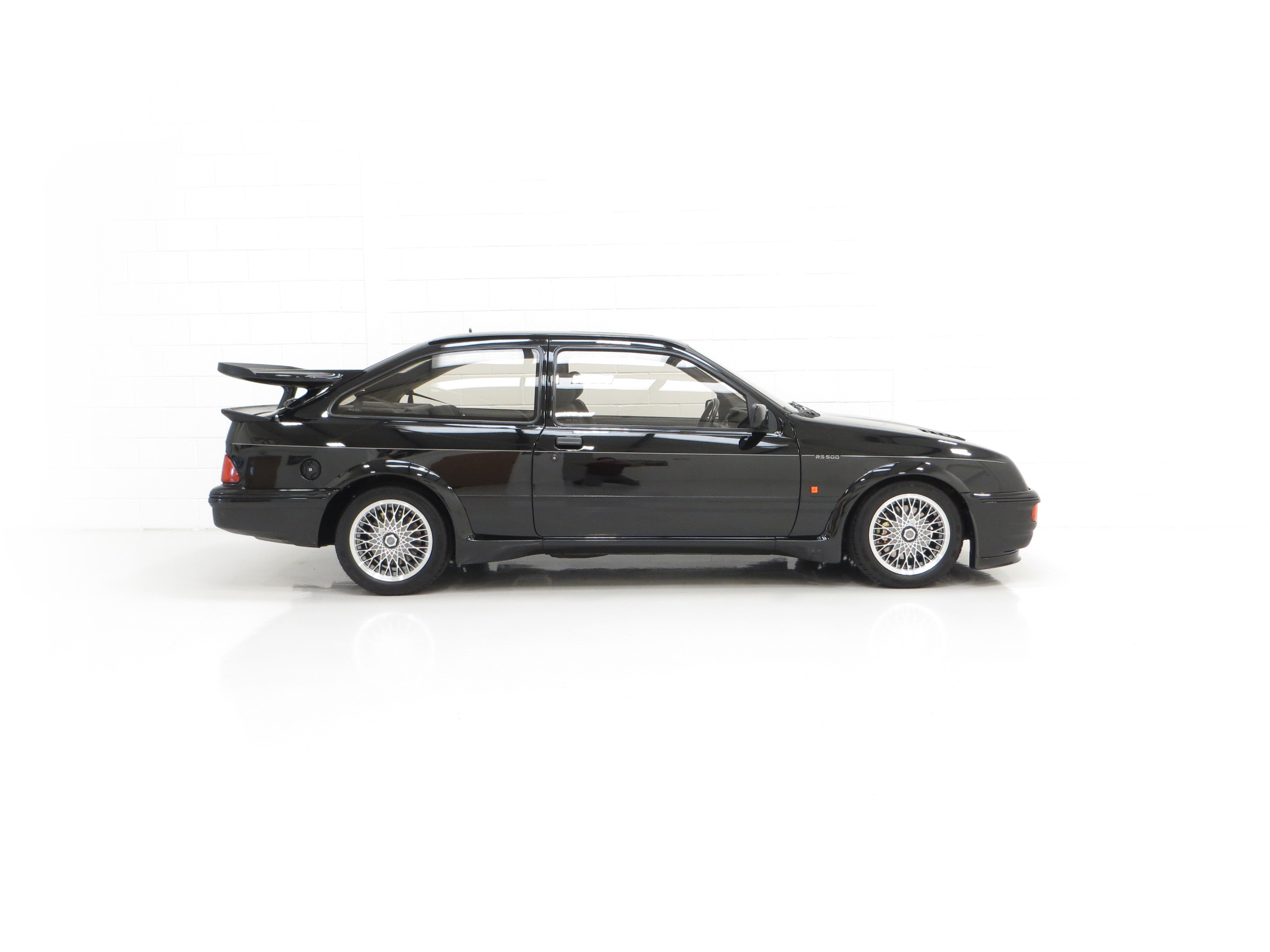 Five hundred extra special examples of the 150 mph Ford Sierra RS Cosworth went on sale in Britain on August 1st 1987. This more powerful ‘evolution’ model was introduced to allow Ford to develop the original limited production run of 5,000 needed to allow the car to be homologated for International Touring Car Racing in Group A. Aston Martin at Tickford were assigned with converting the 500 cars and in addition to the more powerful 224bhp YBD engine, (with the potential to exceed 400bhp in race trim), numerous aerodynamic features were incorporated in the bodywork. These include a 30mm lip spoiler applied directly to the rear edge of the tailgate to increase rear downforce. New and larger cooling ducts were included in the design of the front bumper for the intercooler and the front brakes, as well as an aerodynamic splitter. Ford’s intention was for every RS500 to be finished in Black but limited stock of the regular Cosworths resulted in 56 Diamond White and 52 Moonstone Blue being converted. The vehicle was only available through 90 specialist Ford RS (Rally-Sport) dealers in Britain at a cost of £19,950, a £4,000 premium over a standard RS Cosworth. (Source Ford News Release 87/76). This example is build number 140/500.