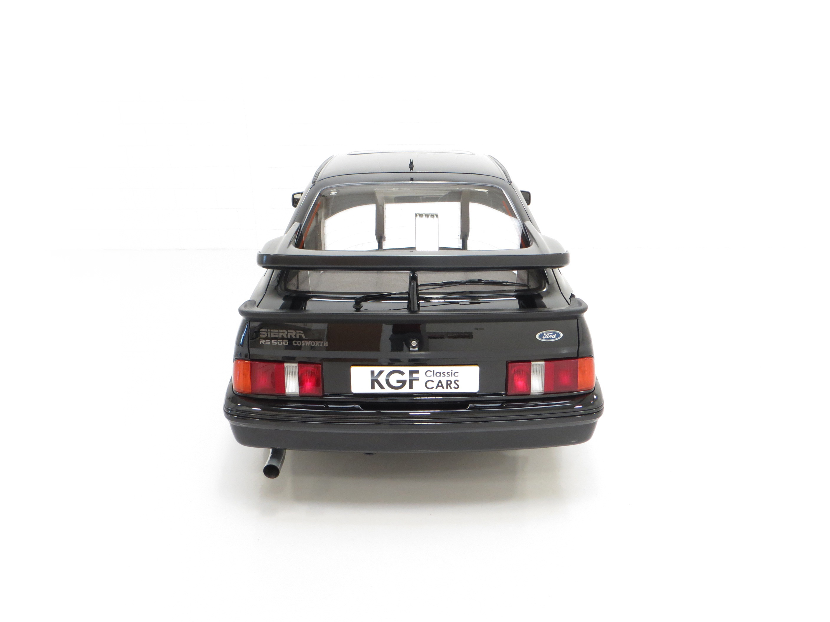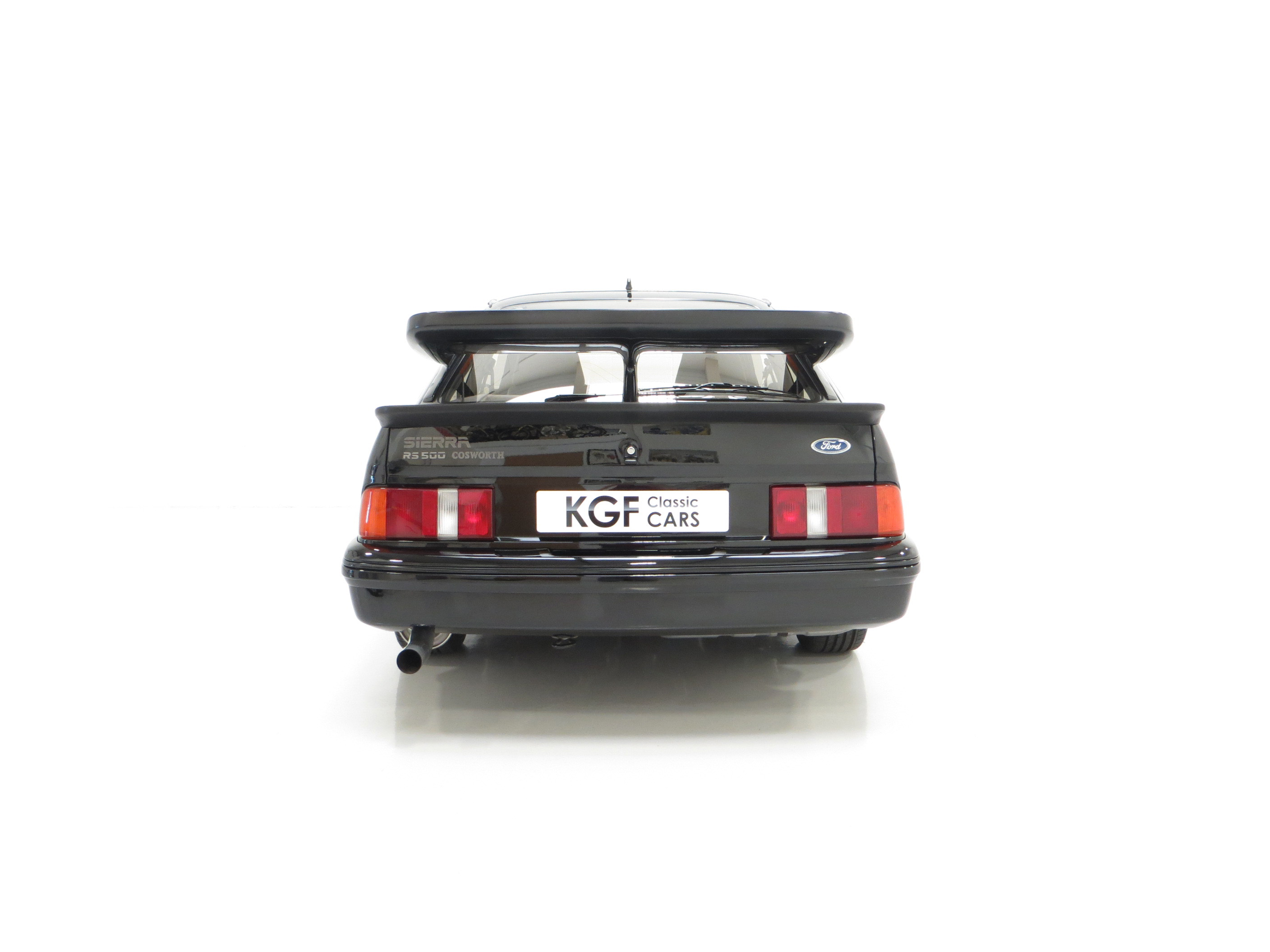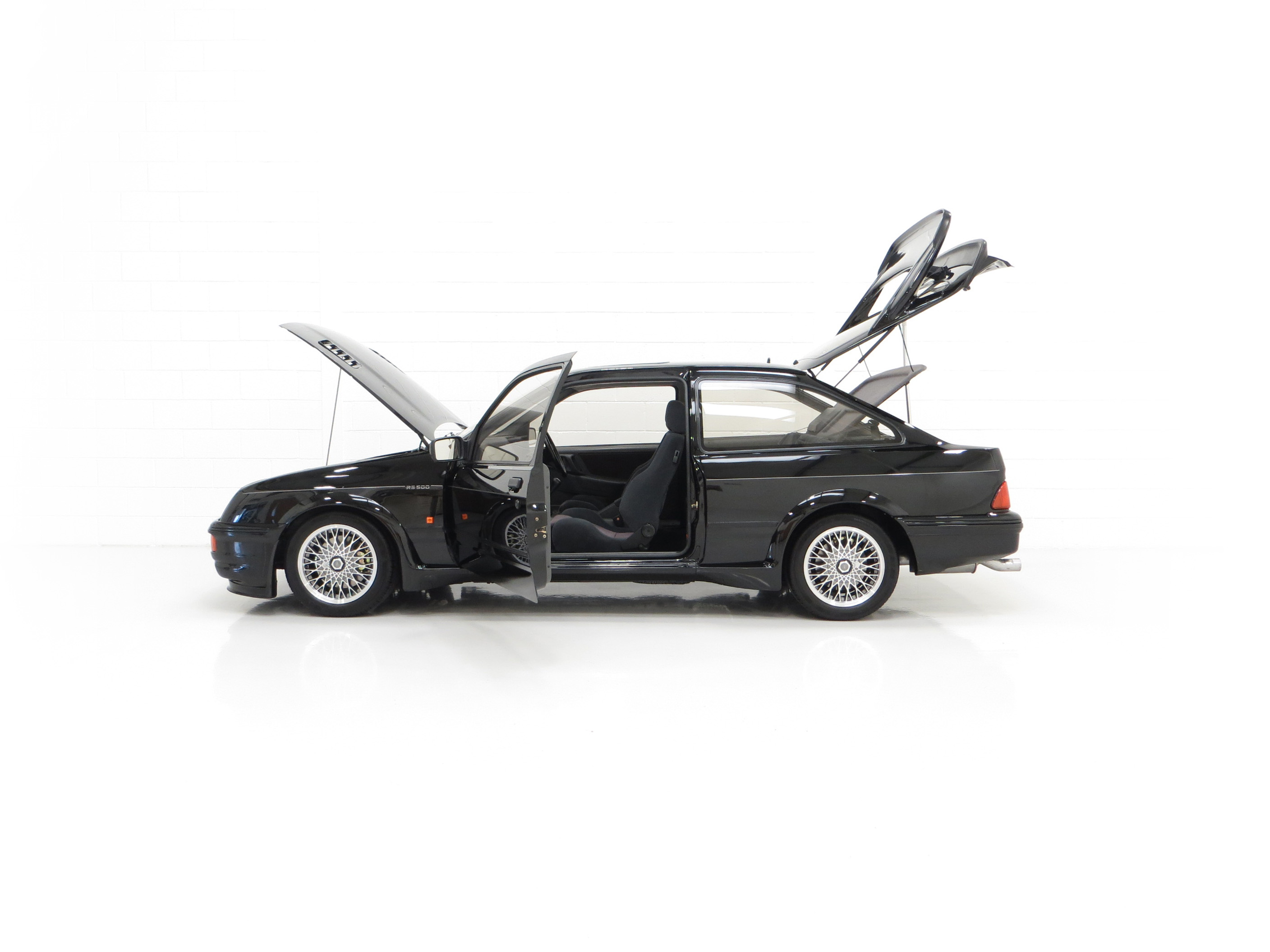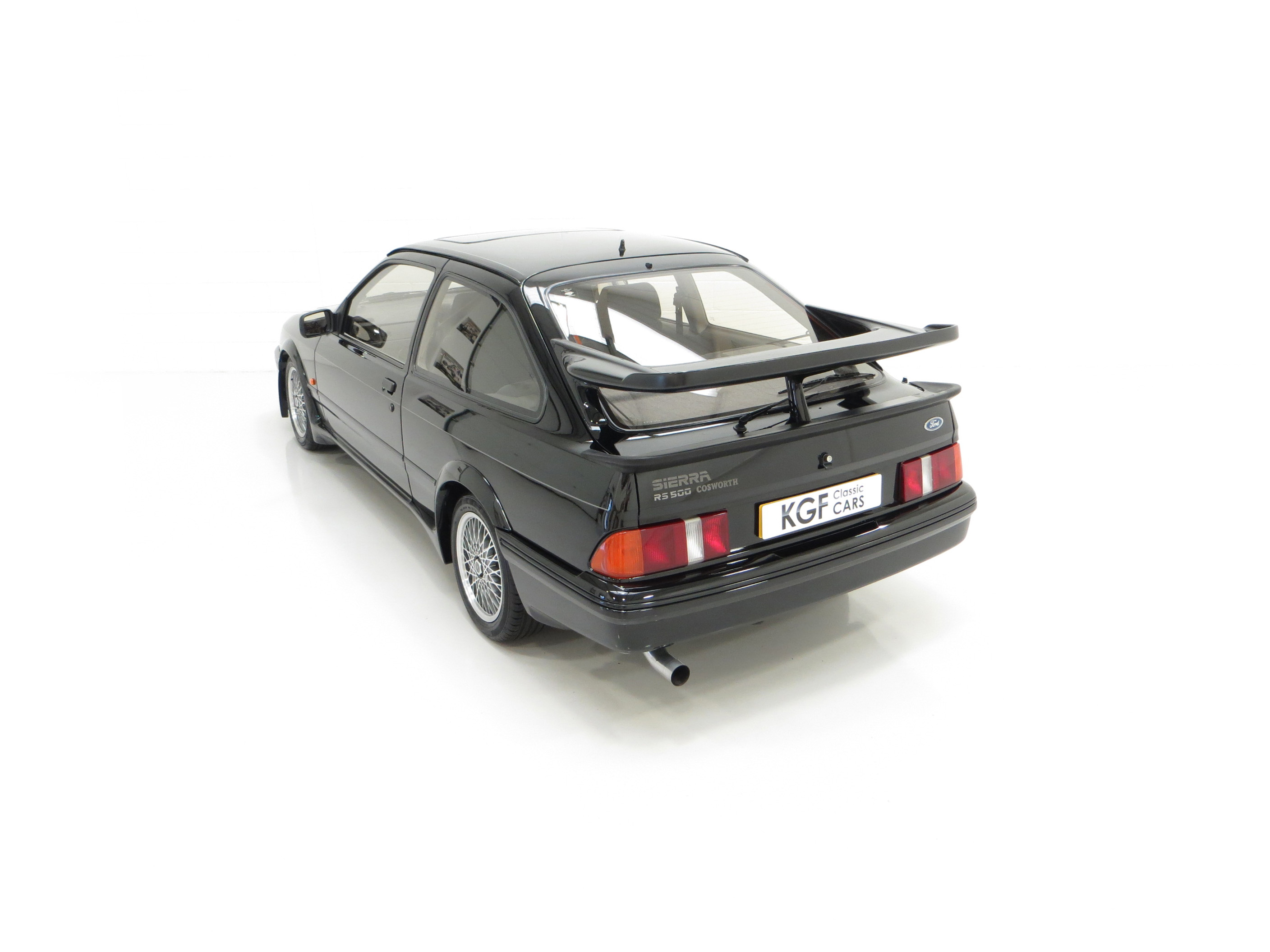 Five hundred extra special examples of the 150 mph Ford Sierra RS Cosworth went on sale in Britain on August 1st 1987. This more powerful ‘evolution’ model was introduced to allow Ford to develop the original limited production run of 5,000 needed to allow the car to be homologated for International Touring Car Racing in Group A. Aston Martin at Tickford were assigned with converting the 500 cars and in addition to the more powerful 224bhp YBD engine, (with the potential to exceed 400bhp in race trim), numerous aerodynamic features were incorporated in the bodywork. These include a 30mm lip spoiler applied directly to the rear edge of the tailgate to increase rear downforce. New and larger cooling ducts were included in the design of the front bumper for the intercooler and the front brakes, as well as an aerodynamic splitter. Ford’s intention was for every RS500 to be finished in Black but limited stock of the regular Cosworths resulted in 56 Diamond White and 52 Moonstone Blue being converted. The vehicle was only available through 90 specialist Ford RS (Rally-Sport) dealers in Britain at a cost of £19,950, a £4,000 premium over a standard RS Cosworth. (Source Ford News Release 87/76). This example is build number 140/500.