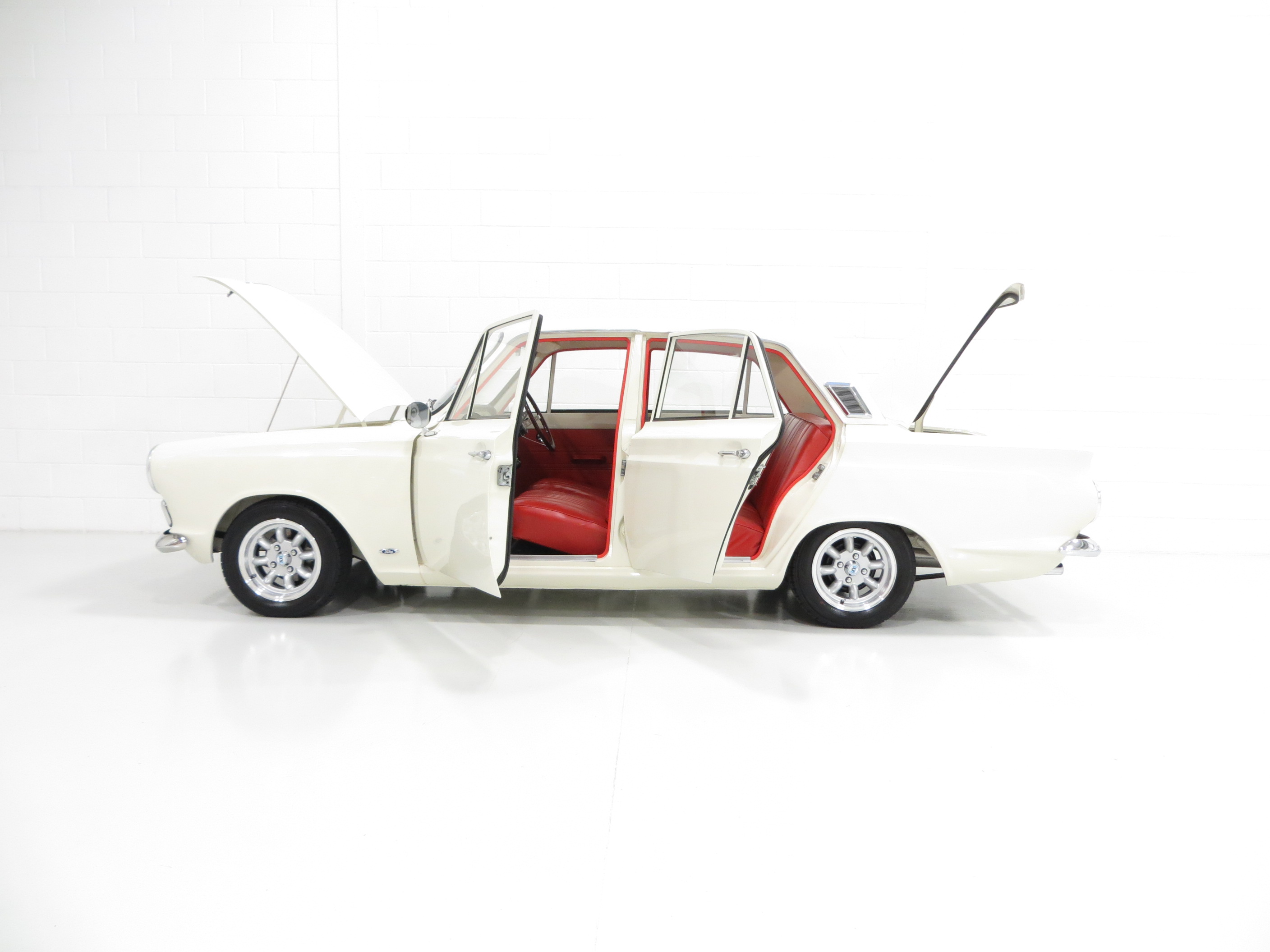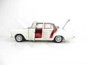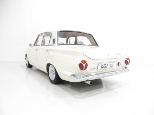 The iconic Mk1 Ford Cortina is instantly recognisable and draws much attention and affection from onlookers. Being no exception, the exterior finish of this incredible example is simply breath taking. A fully documented 2007 bare metal re-spray in the original colour of Ford Ermine White (code BA) was carried out as part of a full restoration program and was to include underside paint detailing. A four door vehicle was intentionally chosen as an alternative to the majority two door cars, and the common Lotus Cortina recreation was avoided. The paintwork is close to flawless with imperfections traceable only upon the most fastidious scrutiny, namely a hairline crack to the paint on the seam joining each front wing to the windscreen scuttle, utterly insignificant. Huge expense and countless hours of devotion are clearly evident with the resulting finish scarcely bettered. The chrome bumpers, brightwork and rubber trim sections are perfect and the original bonnet and rear badges display only the faintest natural patina. A spotless detailed engine bay upholds the condition of the exterior and features expensive re-plating and refurbishment of all components. A stunning Mk1 worthy of much admiration and pride.