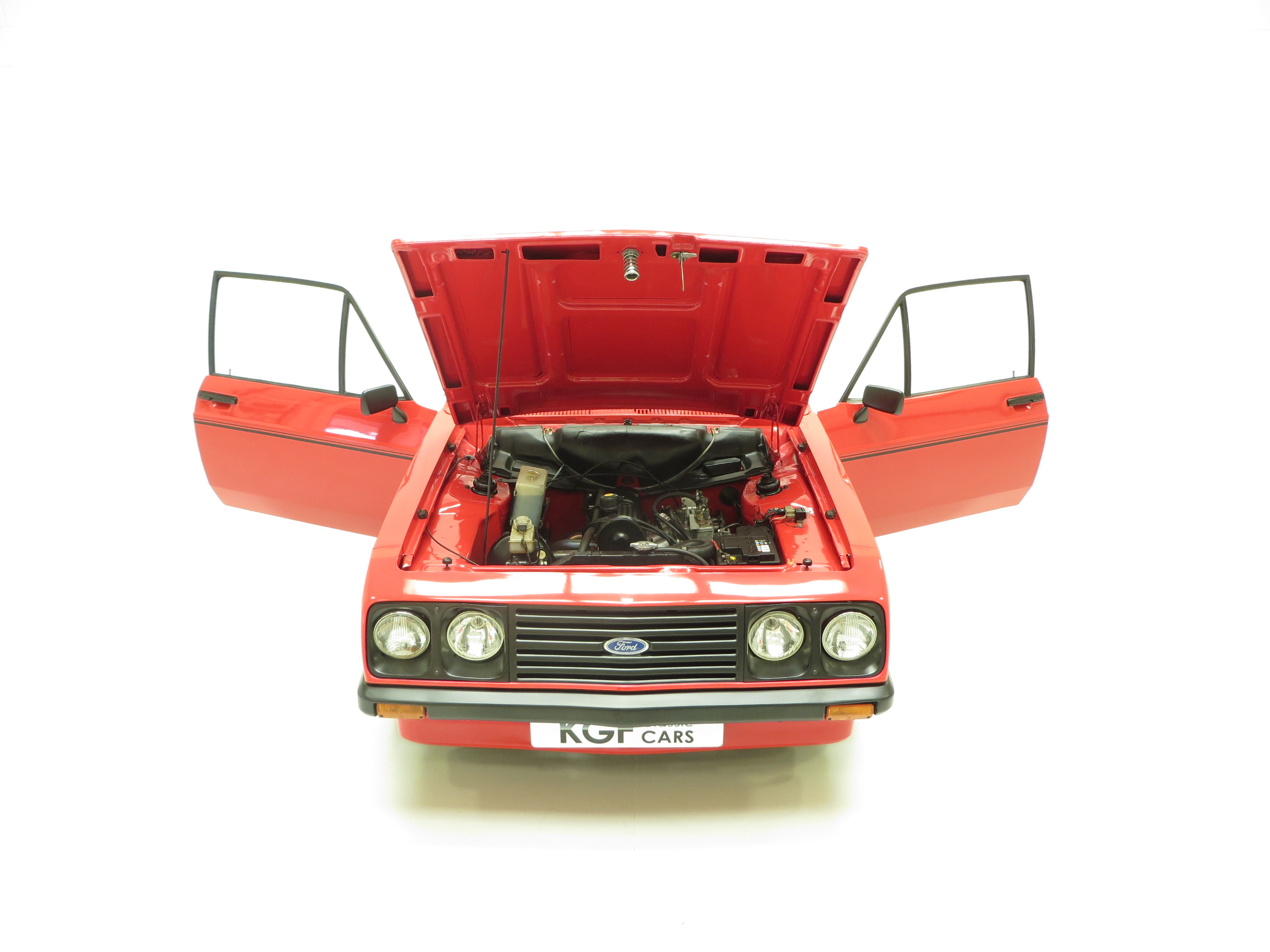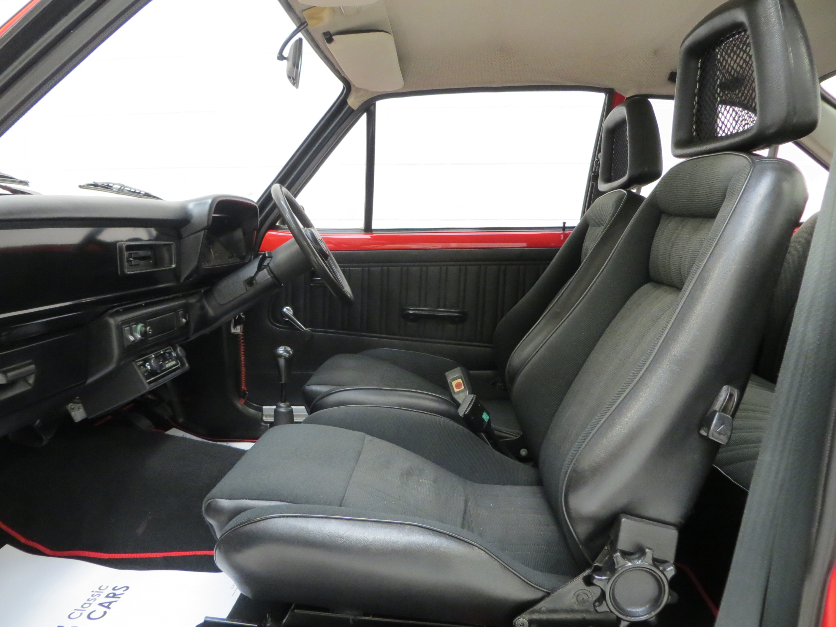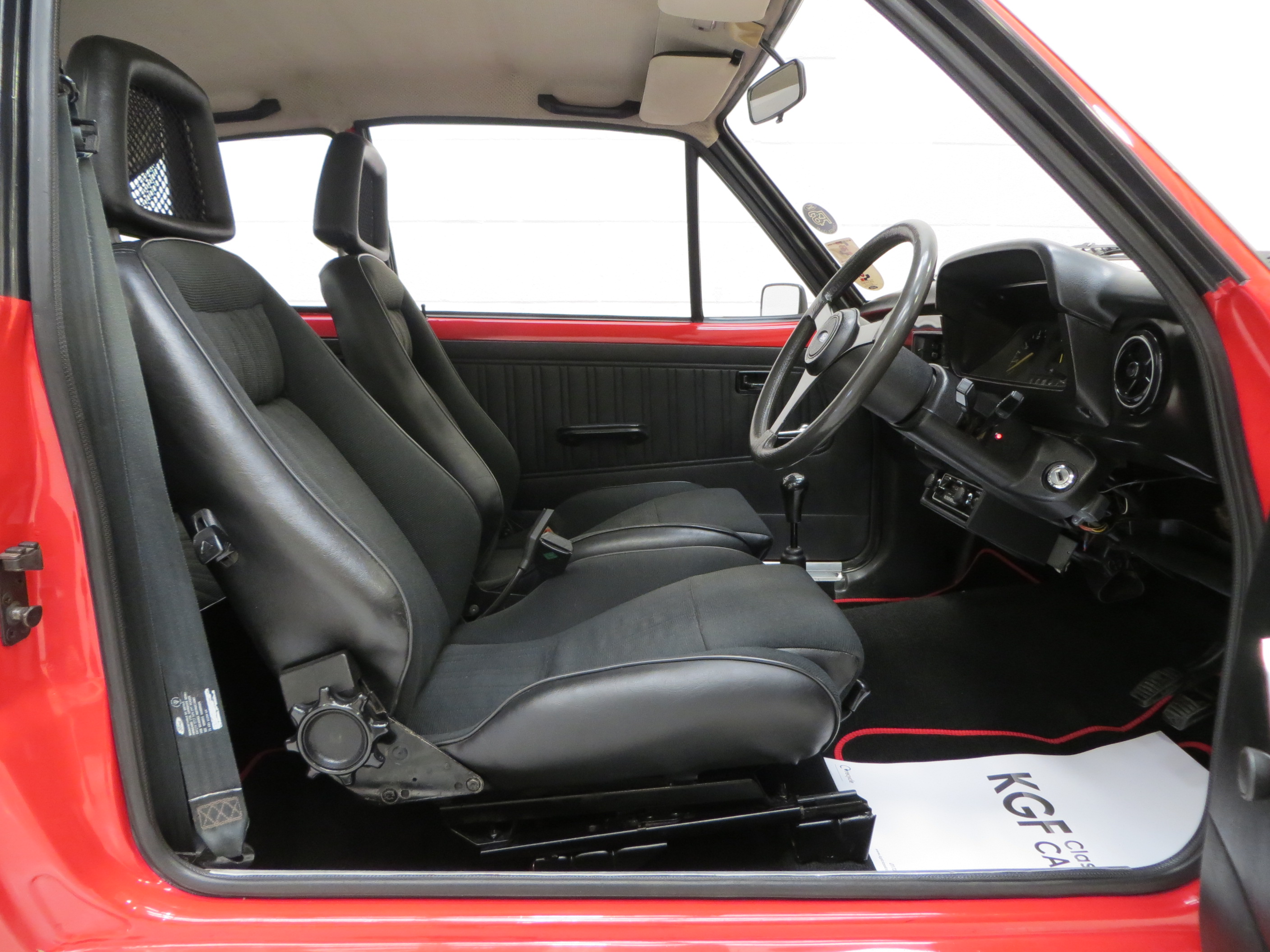 This superb RS2000 Base example is finished in vibrant Venetian Red (code R6). A bright polished finish is pleasing to onlookers and worthy of pride on the show scene. The rear pane around the lamp clusters and number plate remains body coloured and the windows are non-tinted, true to the Base specification. Minor blemishes to the paintwork are visible and the nose cone does have some colour fade. All trim sections and RS decals and badges remain intact and in excellent order, and a very clean engine bay is ready for bonnet up exhibiting. Replica Ford Main Dealer rear screen sticker and number plates are fitted to the car. Altogether a very clean and usable example of Ford’s iconic RS2000, ready for enjoyment!