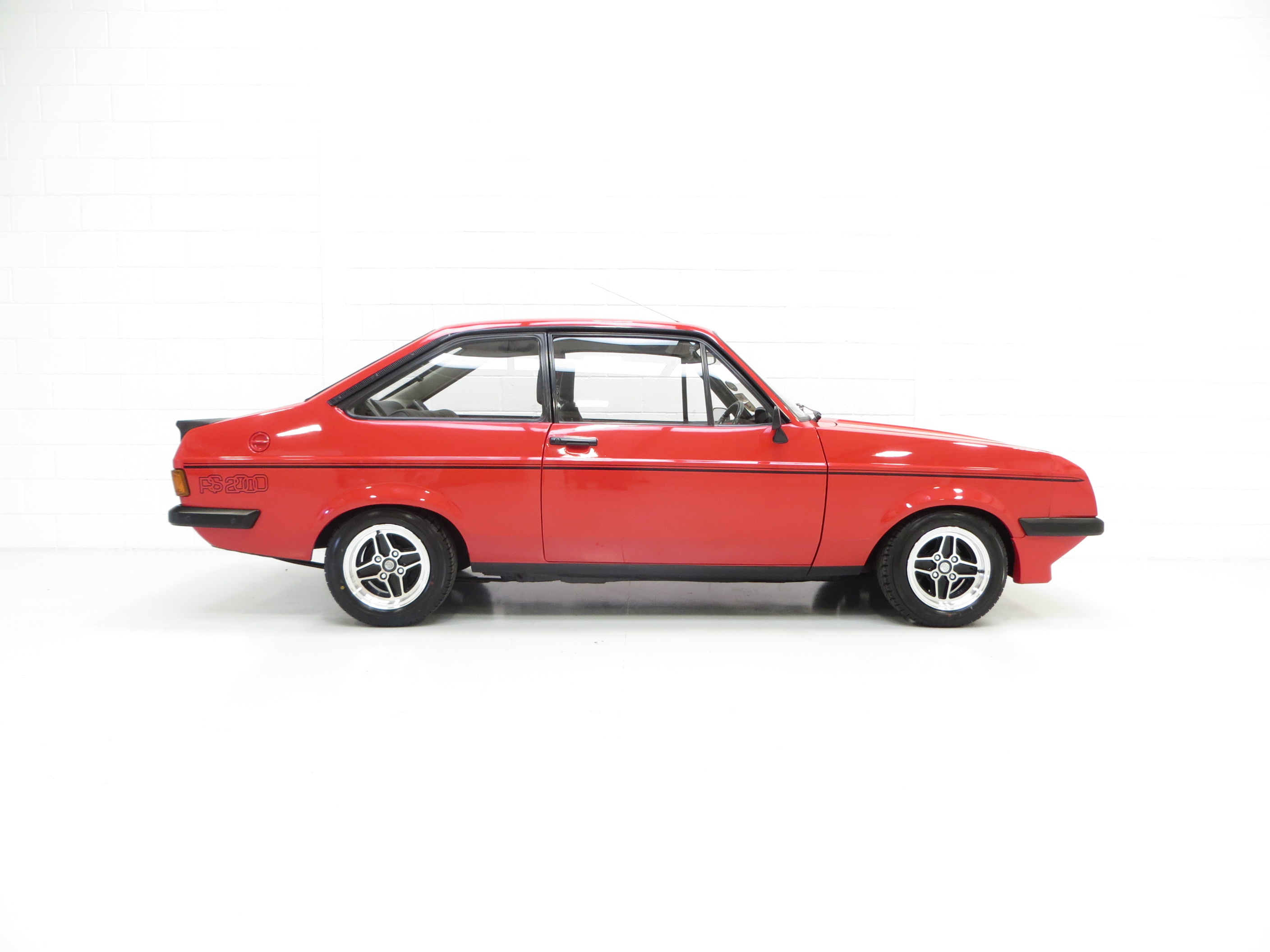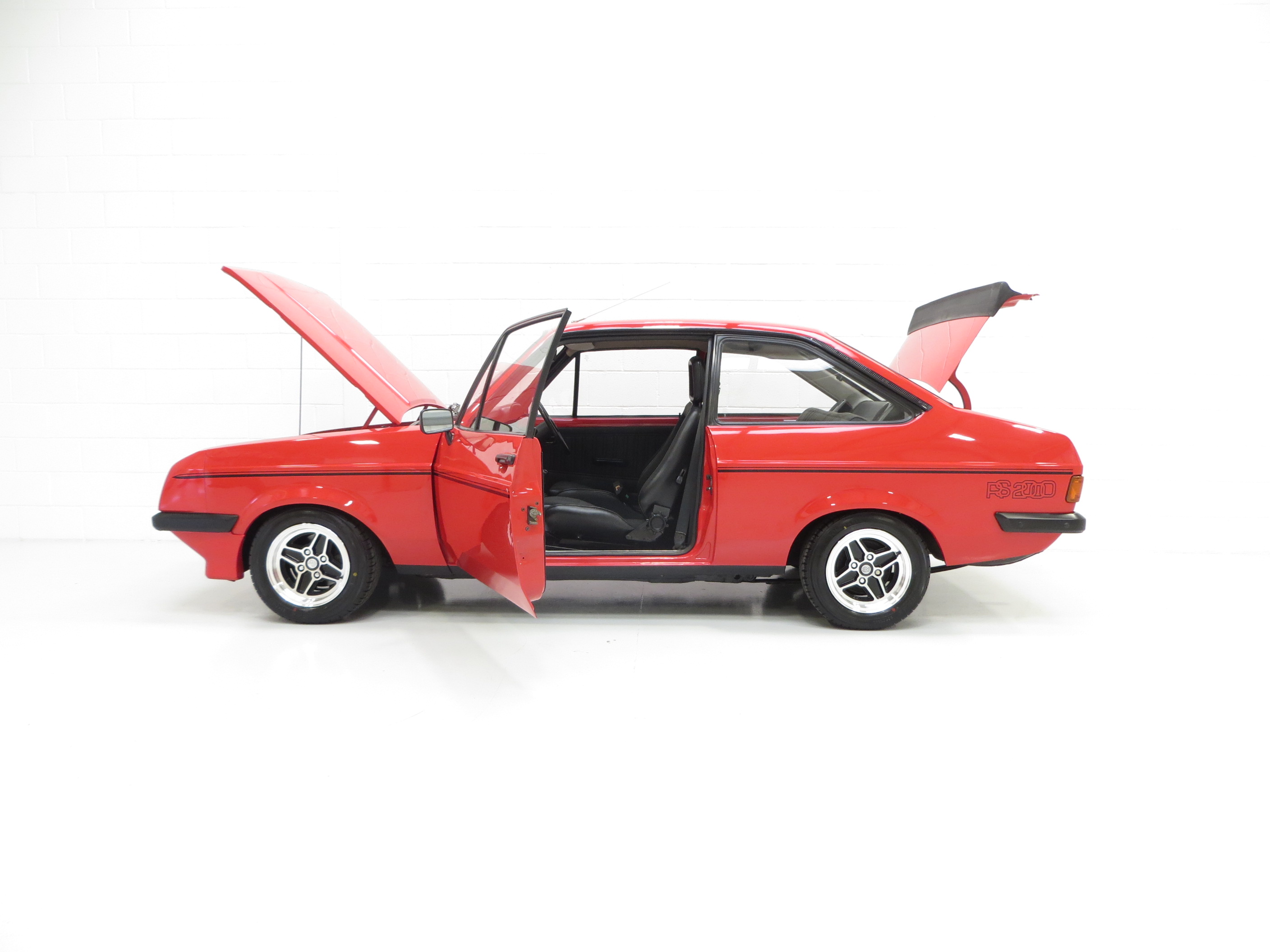 Polyurethane front end incorporating four Cibie quartz halogen headlamps, front air dam, rubberised tail spoiler, twin bodyside coachline, RS2000 decals, black door mirrors, laminated windscreen, hazard warning flashers, heated rear window, separate fuel, water temperature and oil pressure gauges, padded sun visors, two-speed heater, aeroflow ventilation with eye ball vents. RS Custom options; Fishnet headrests, glovebox.