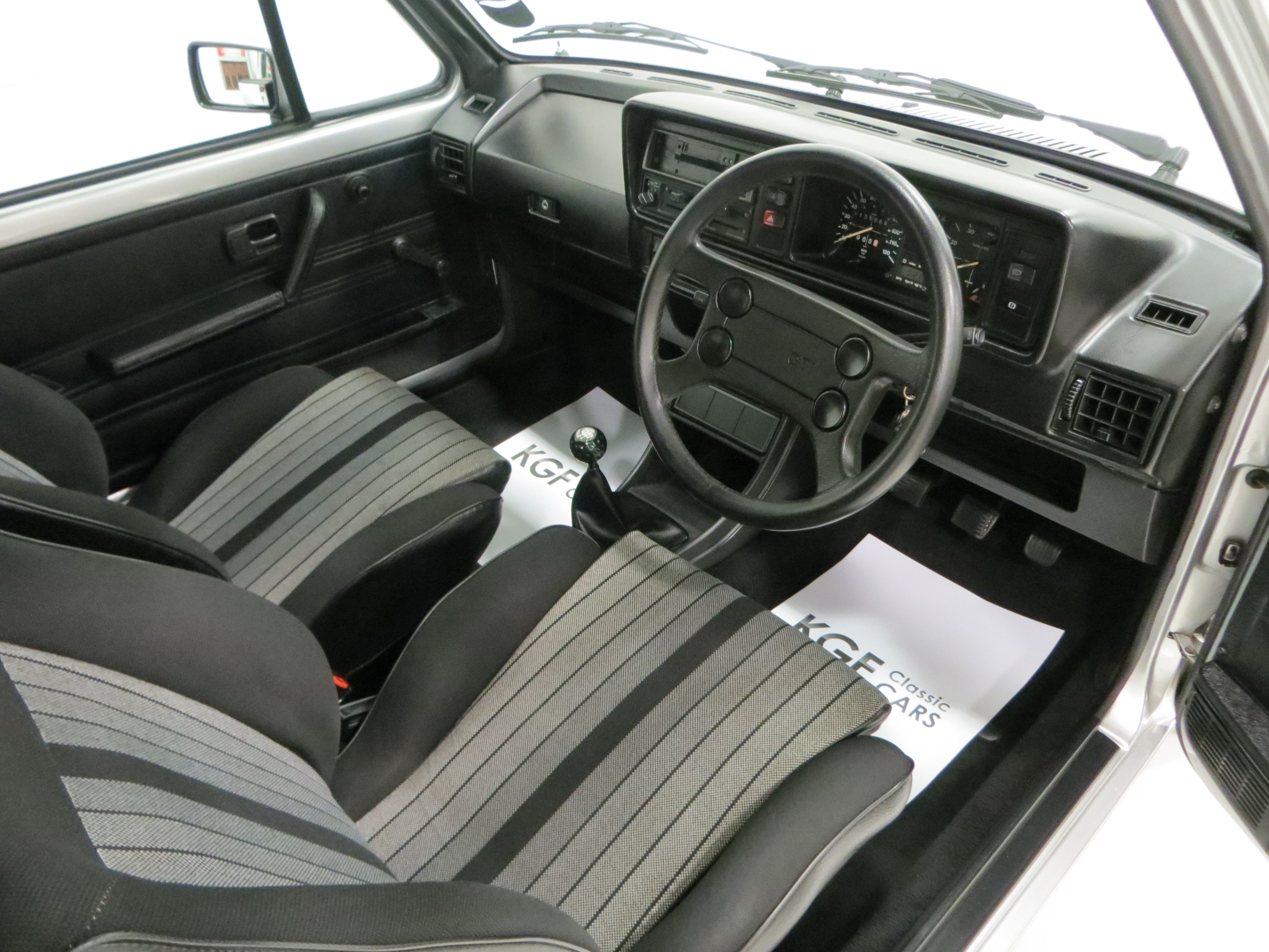 This stunning unmolested MK1 Golf GTi is finished in classic Diamond Silver Metallic, (Code L97A). The paint finish is simply impeccable with a beautiful detailed shine and uniform presentation. All factory panels are pin straight displaying linear and even shut lines. Faint and very minimal touched in chips to the leading bonnet edge do not offend. The rubbers side mouldings, lights and all other body trimmings are perfect and scuff free and the original green tinted glass is security etched. The identification sticker on the boot cross member is present and has the vital ‘Campaign’ option codes of 707 and 750 matching the vehicle data sticker in the service book. Campaign specification trim and decals are exactly correct and remain in remarkable order, including the special edition specific fuel filler cap with spring loaded cover. An incredibly well preserved and cherished example, very special.