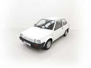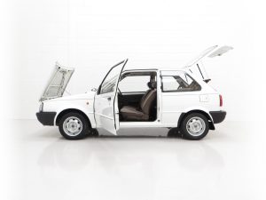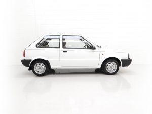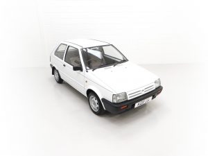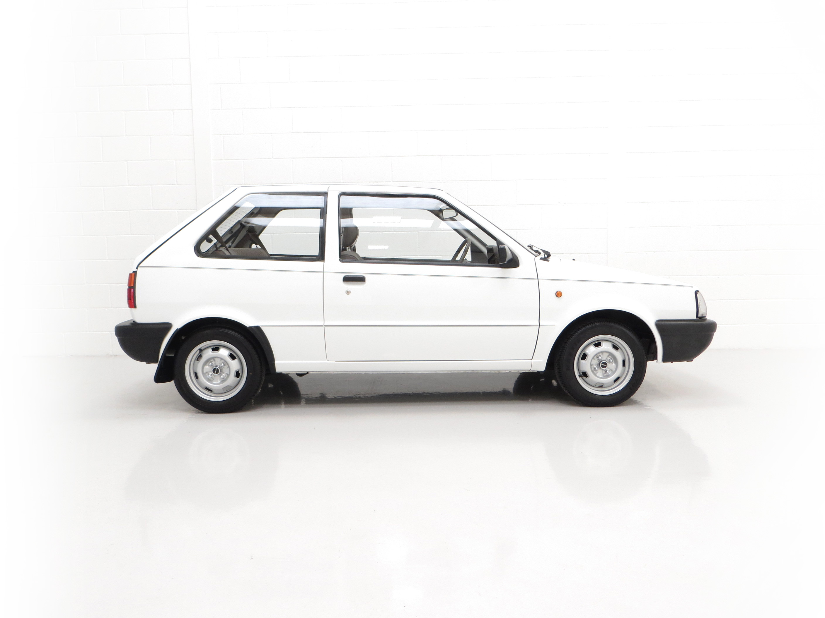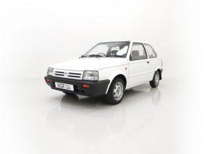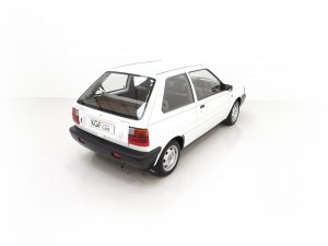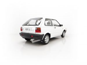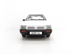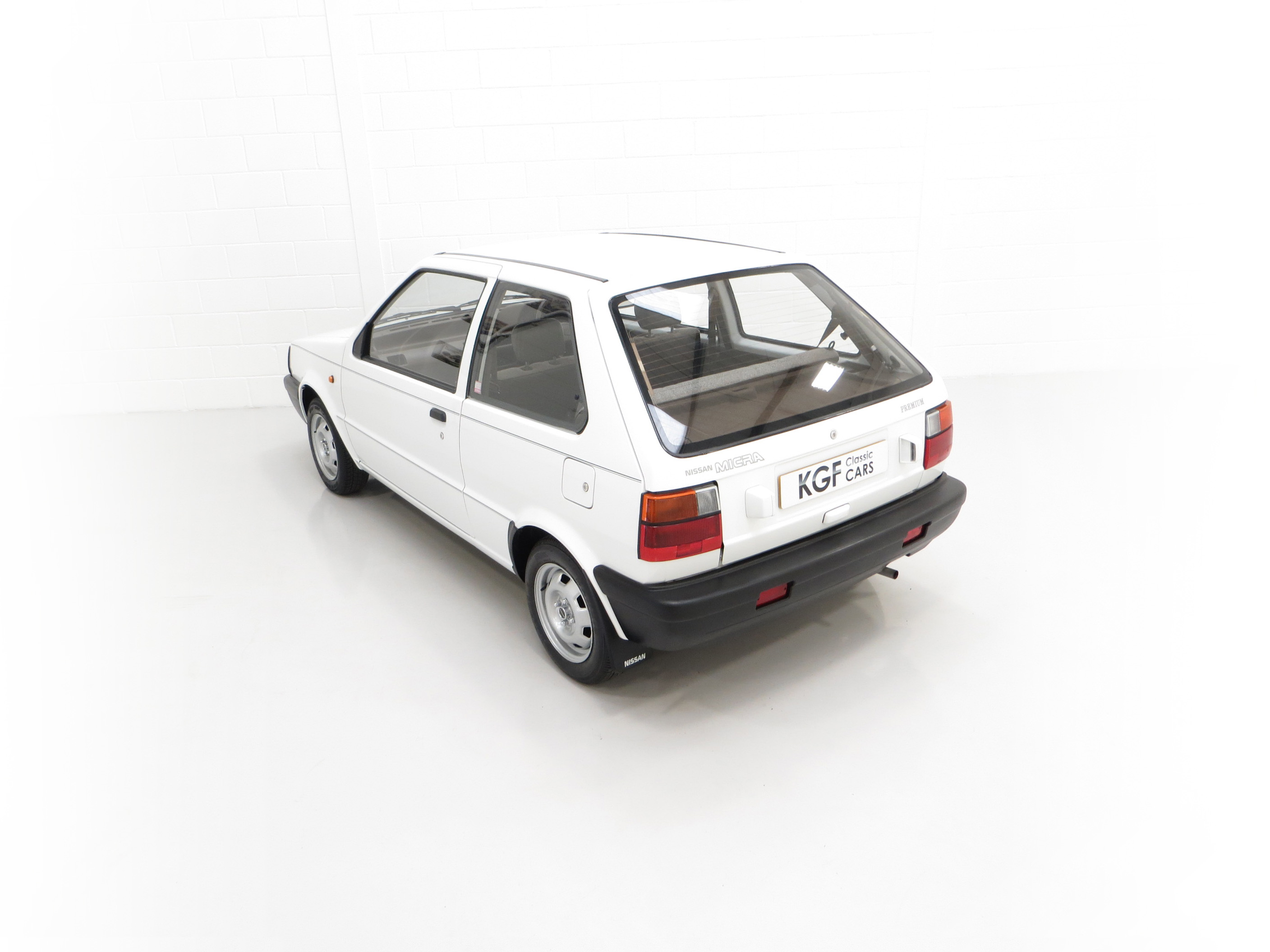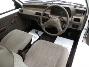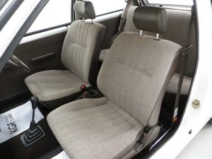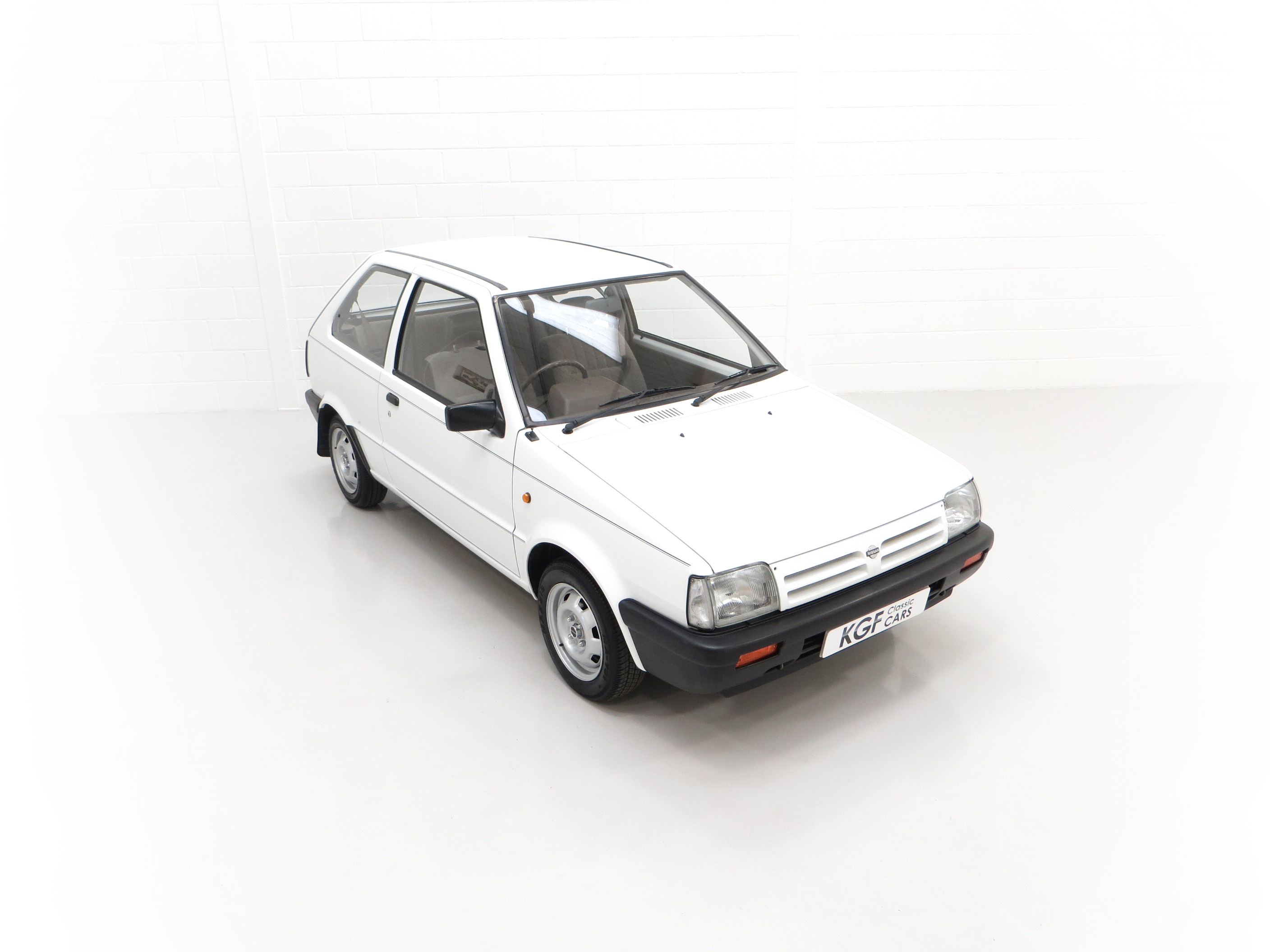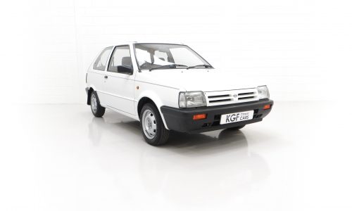 This fabulously frugal yet fun Nissan Micra epitomizes everything it was designed for, simplicity and basic economy motoring from a bygone era when even a passenger door mirror and rear wiper were a luxury! Finished in factory bright Polar White, (Code 531), the paint finish looks superb with a bright uniform shine. Light age-related markings and touched in scratches and chips are visible only upon close scrutiny and spoil none of this cars unmolested appeal and low mileage loveliness. The slightly faded colour keyed radiator grille, wrap around bumpers and all trim is largely unmarked and all glass is factory fitment even displaying the ‘OK Nissan’ sticker. The double side coachline and Micra Premium decals are fully intact. Further originality is affirmed with the original supplying dealer plates from our very own local (at the time) AFG Nissan of Peterborough. Resplendently retro.