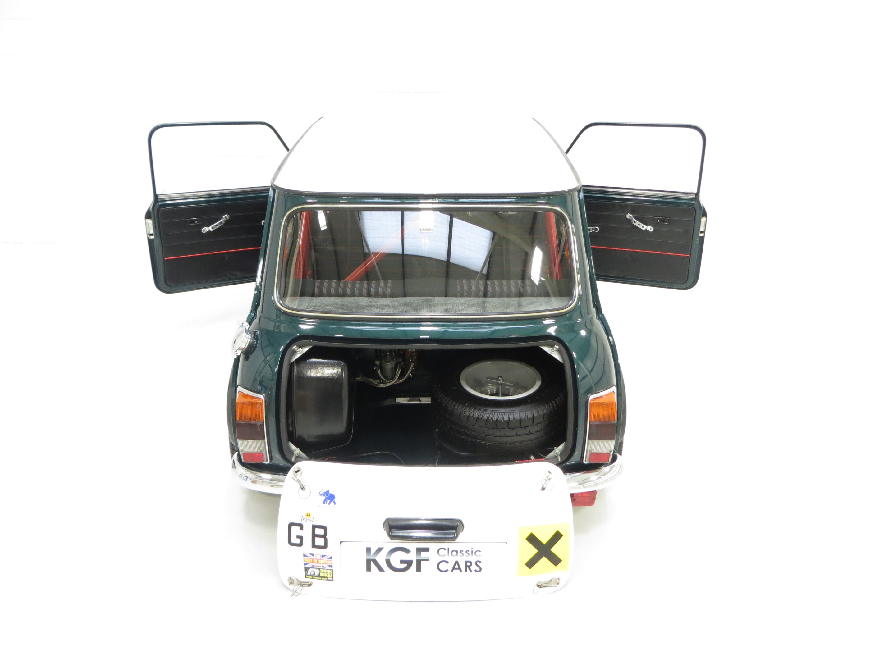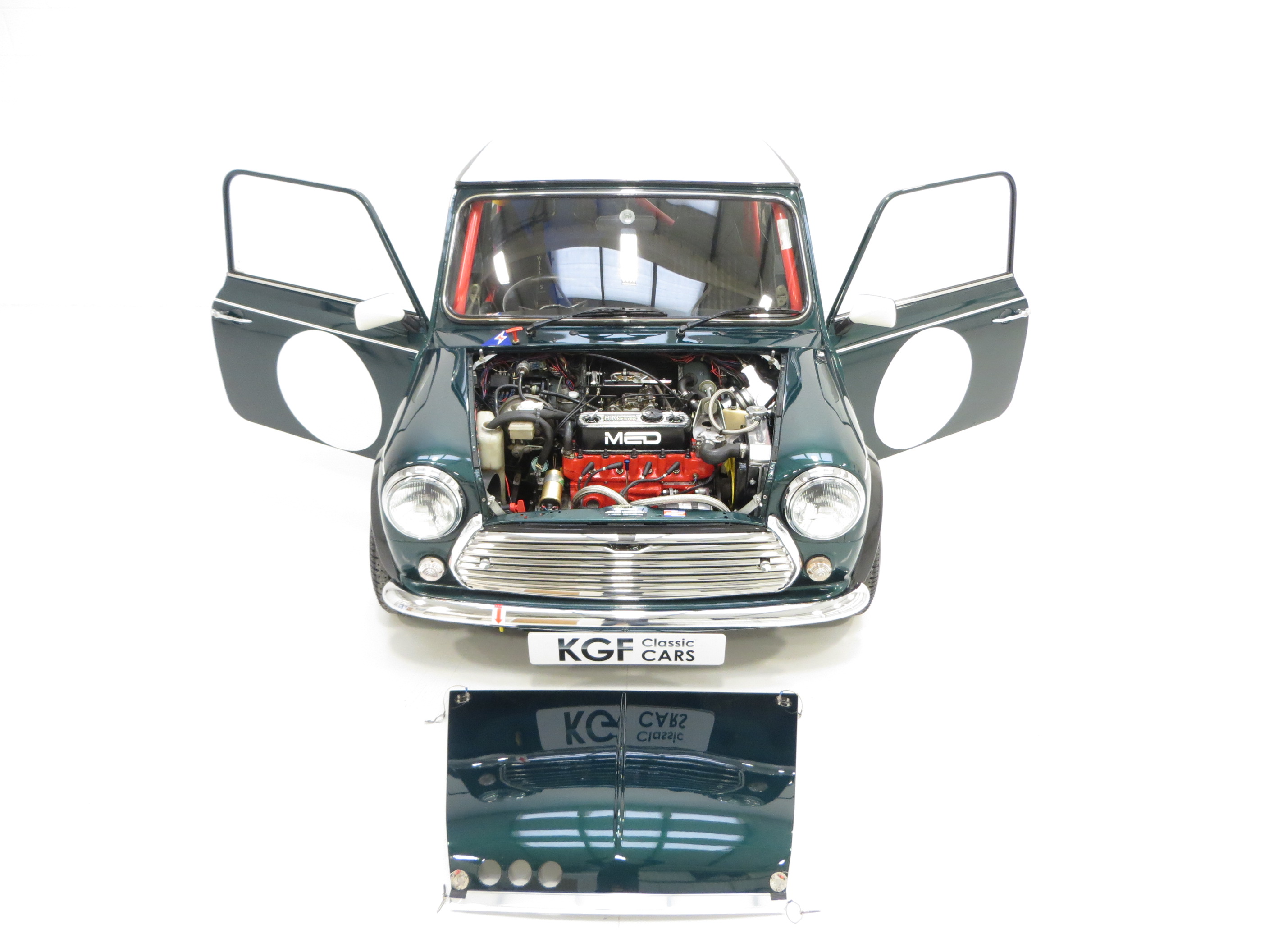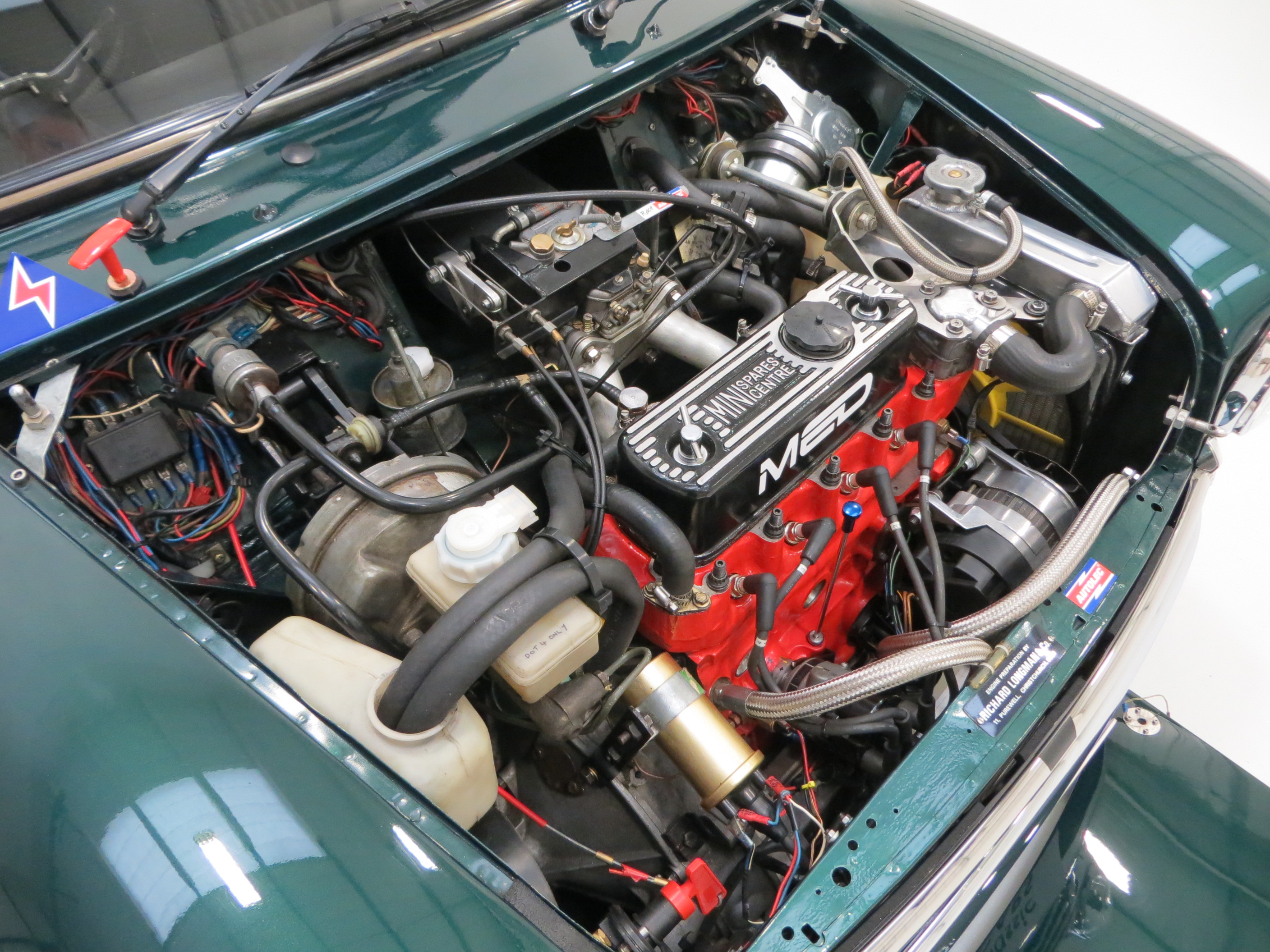 This exhilarating genuine Mini Cooper looks every part the competition machine whilst retaining all the charm and period feel of the classic Mini. Finished in the original factory colour of British Racing Green (code HNA) with original Old English White on the roof, the presentation is excellent with a deep polished shine. Structurally perfect with absolutely no corrosion to the panels, this incredible example has been prepared to an impeccable standard. The lightweight bonnet and fibreglass boot skin provide a hint towards the epic credentials of this purpose built competitor, and the championship and branded decals relate to the events competed in and the equipment fitted. The rear bumper is slightly misshapen and displays a small ding to the corner edge, born possibly from some overzealous competitiveness! The RCA arch spats along with quick release panels and many other competition components further cement the incredible devotion towards the build and the resulting awesome achievement. A true successful contender.