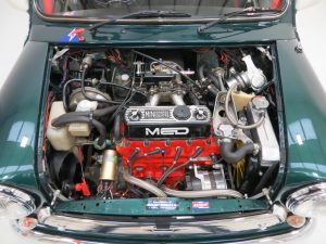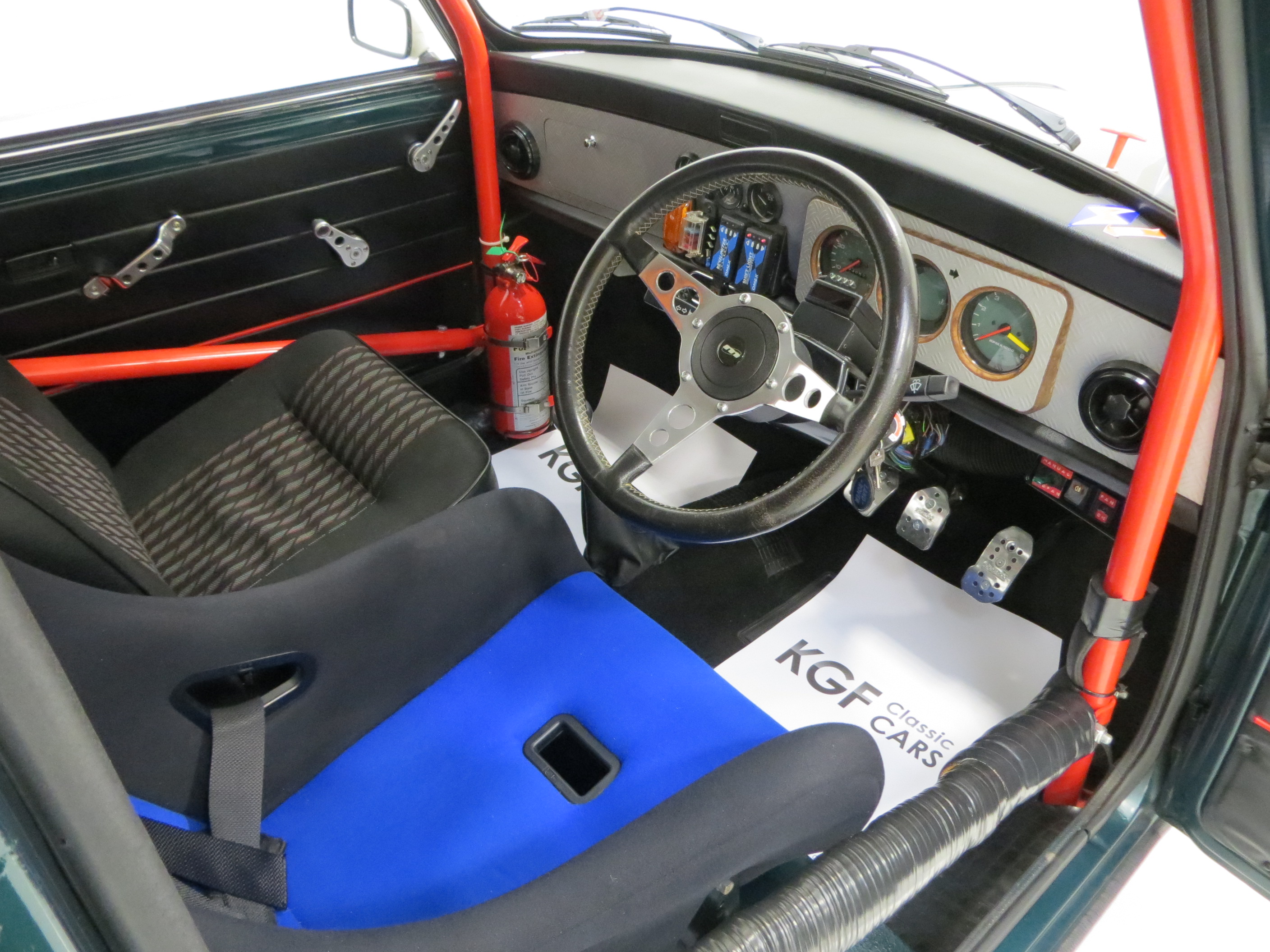 Upon entering the cockpit of this marvellous Mini, you are instantly exposed to the dedicated mind-set towards the creation of a successful machine. The snug and ultra-supportive OMP race seat and Willans harness secure the driver tightly and safely. Once positioned in the race seat, the driver is surrounded by the full FIA approved 6 point roll cage, (bolted through welded strengthening floor plates), fire extinguisher and a plethora of competition dials and controls offering an insight to the incredible driving experience in store. All purposeful equipment and controls have been neatly installed to a professional standard including the Omex shift indicator and rev limiter next to the oil pressure lamp designed illuminate if the pressure drops below 30psi. A perfect balance of competition equipment with original design has been met with the factory fitted passenger seat and rear bench remaining in place. The original dashboard, lightweight carpet set, door cards and headlining are all in excellent order. Utterly exhilarating.