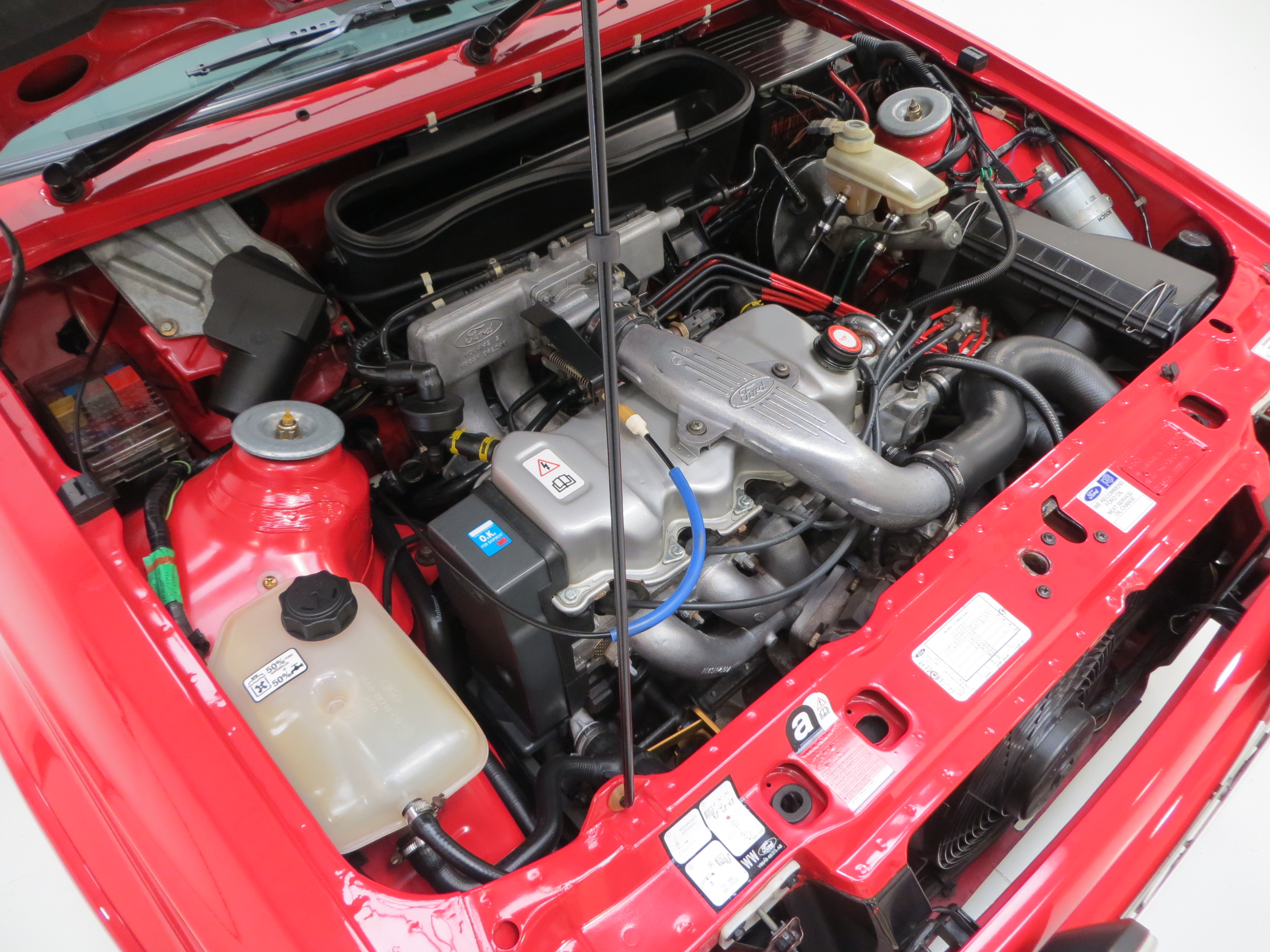 The 1.6 OHC (CVH) Bosch KE-Jetronic fuel injected engine with a Garrett AiResearch T3 turbo charger produces 140bhp, (8bhp increase over a standard car) thanks to a stainless steel standard looking Magnex exhaust system and in such a lightweight car, the 0-60 dash is dealt with in 8.2 seconds and a top speed of 128mph is achieved. A beautifully clean engine compartment displays all the factory stickers and plates, and a Motorcraft battery is fitted. The 5-speed manual Ford BC box with standard 220mm clutch is light, precise and a joy to use.