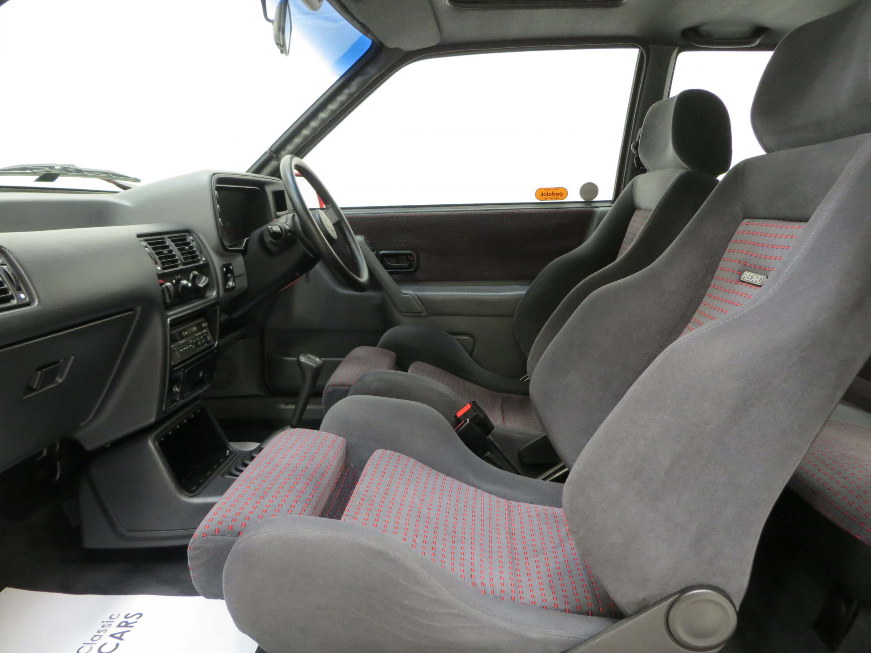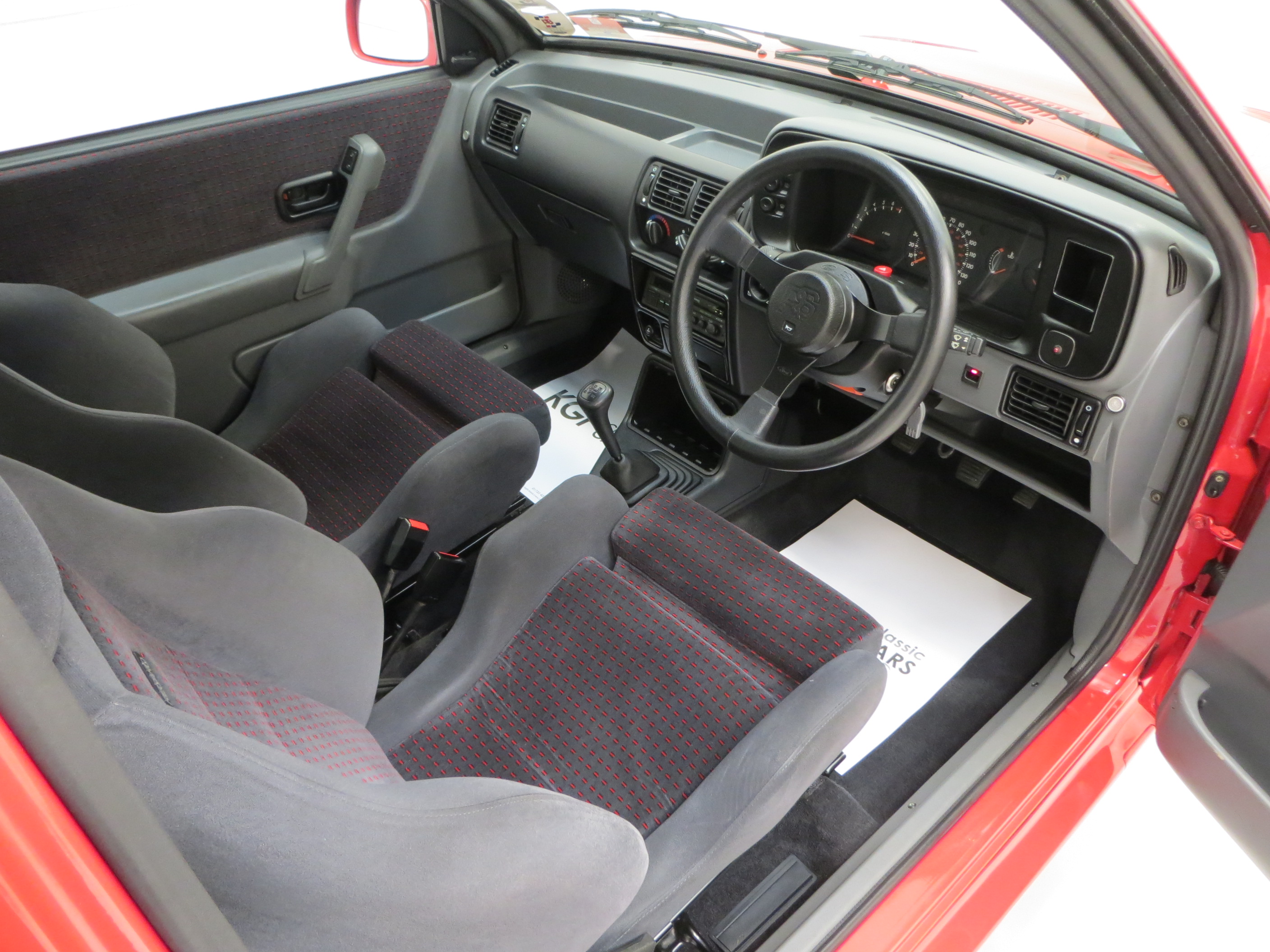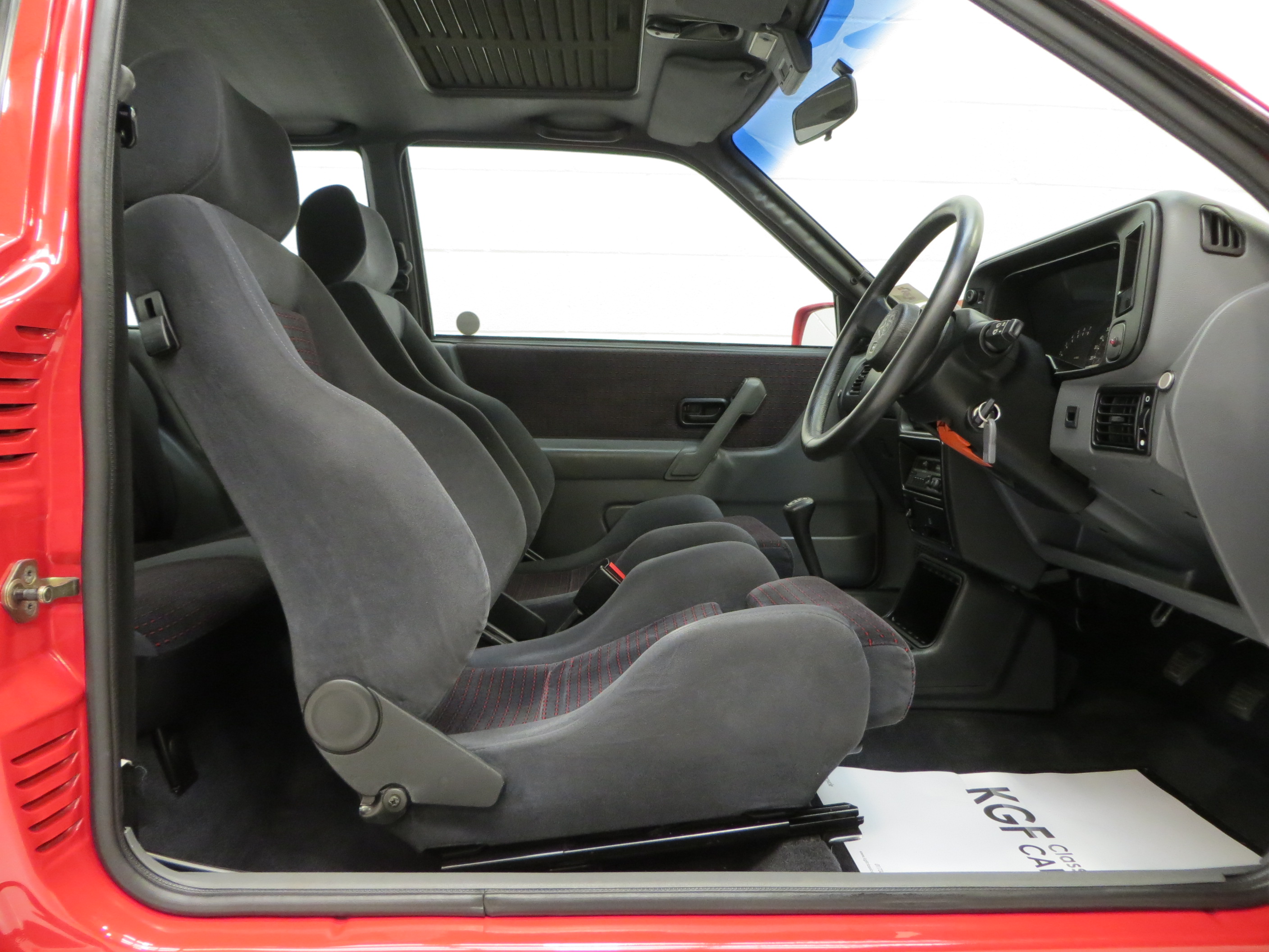 Body coloured bumpers with black insert, body coloured wheel arch extensions, 88 spec tailgate spoiler, halogen headlamps, front driving lamps, cooling vents in bonnet, central door locking, heated rear window, dual-tone horn, tailgate wash/wipe, tinted glass, quartz digital clock, aerial incorporated in rear windscreen, Recaro front reclining seats, 60/40 split rear back rest, tilt/slide glass sunroof, tachometer, electrically operated front windows. Factory options; remote body coloured door mirrors. Fitted accessories: Ford RS steering wheel, alarm immobiliser, genuine Ford rubber mats.